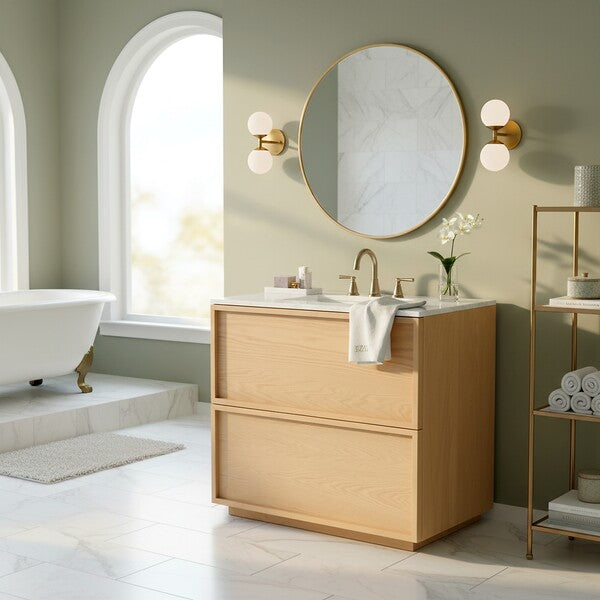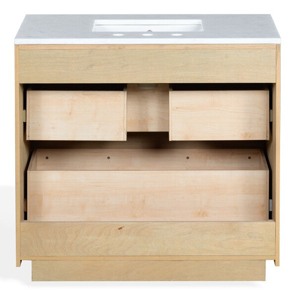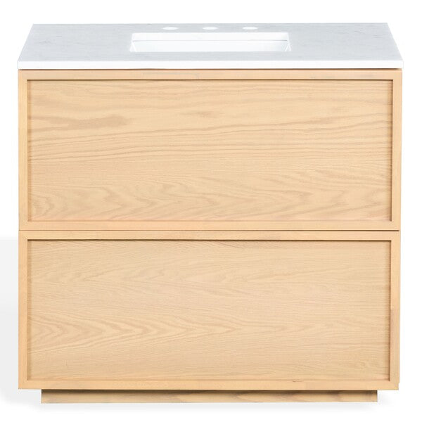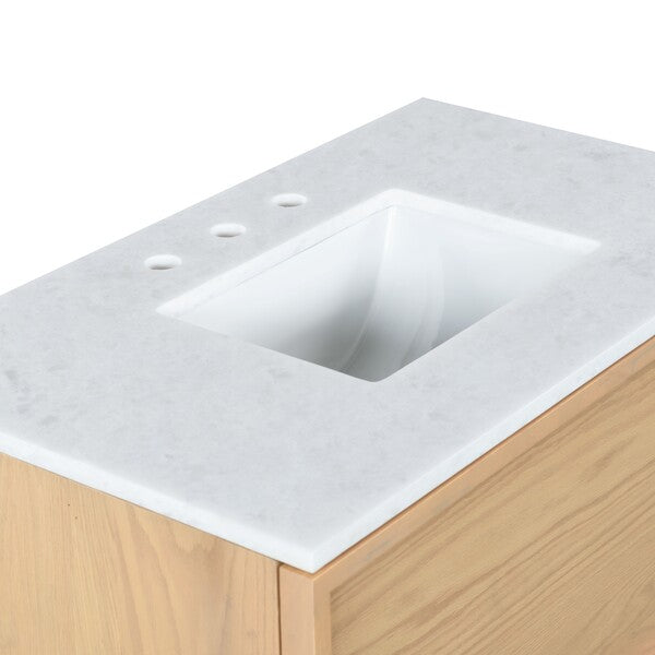 Discover the elegance and style of the Zeus 36 inch single vanity in medium oak and white. This sophisticated piece effortlessly combines function and flair, making it a standout addition to any bathroom. Crafted from wood, with a stunning marble countertop and a ceramic sink, the vanity showcases a harmonious blend of materials. The warm tones of medium oak add a touch of classic charm, while the crisp white accents provide a fresh, contemporary feel, allowing the Zeus vanity to complement a variety of decor styles.