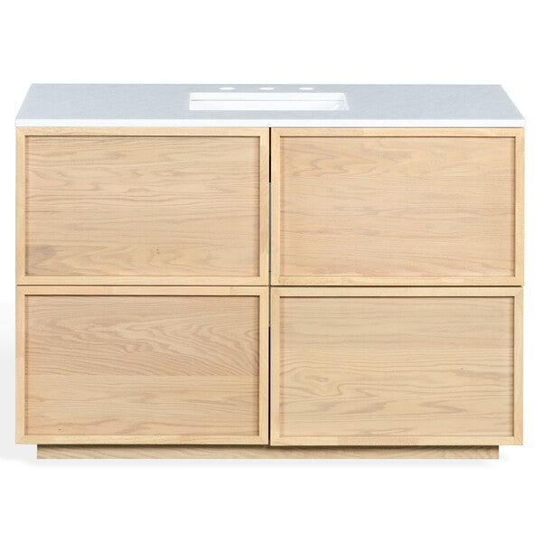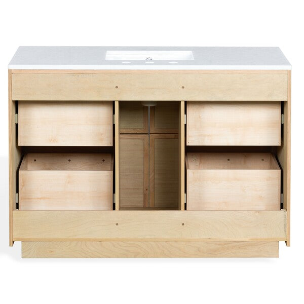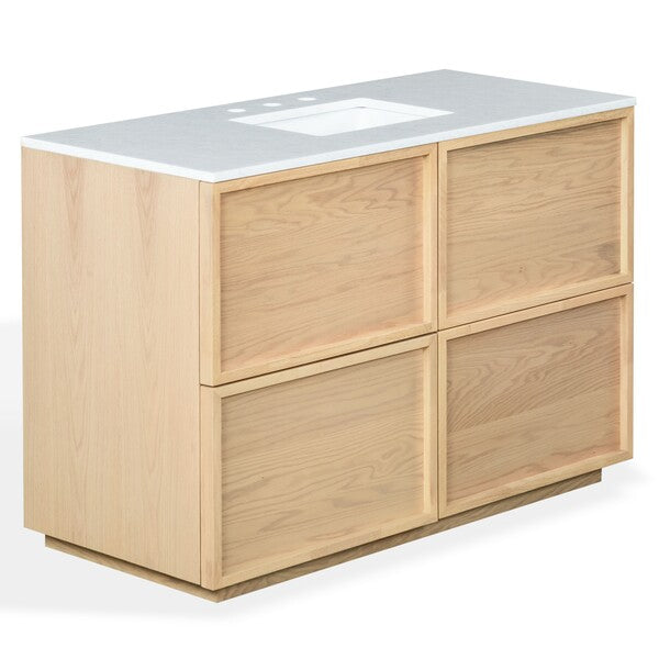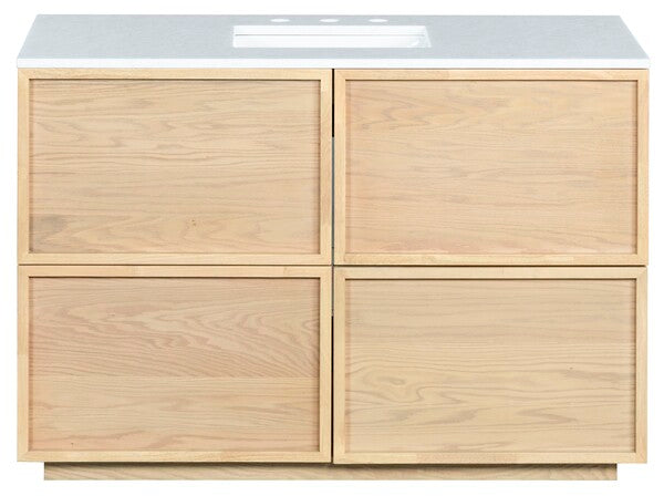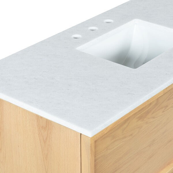 Transform your bathroom into a sanctuary of elegance with the Zeus 48 inch single vanity. With its medium oak finish and sleek white accents, this vanity combines classic beauty with a modern touch. The natural warmth of wood is perfectly complemented by a polished marble surface, bringing an inviting atmosphere to your space. The integrated ceramic sink marries form and function for a seamless aesthetic.