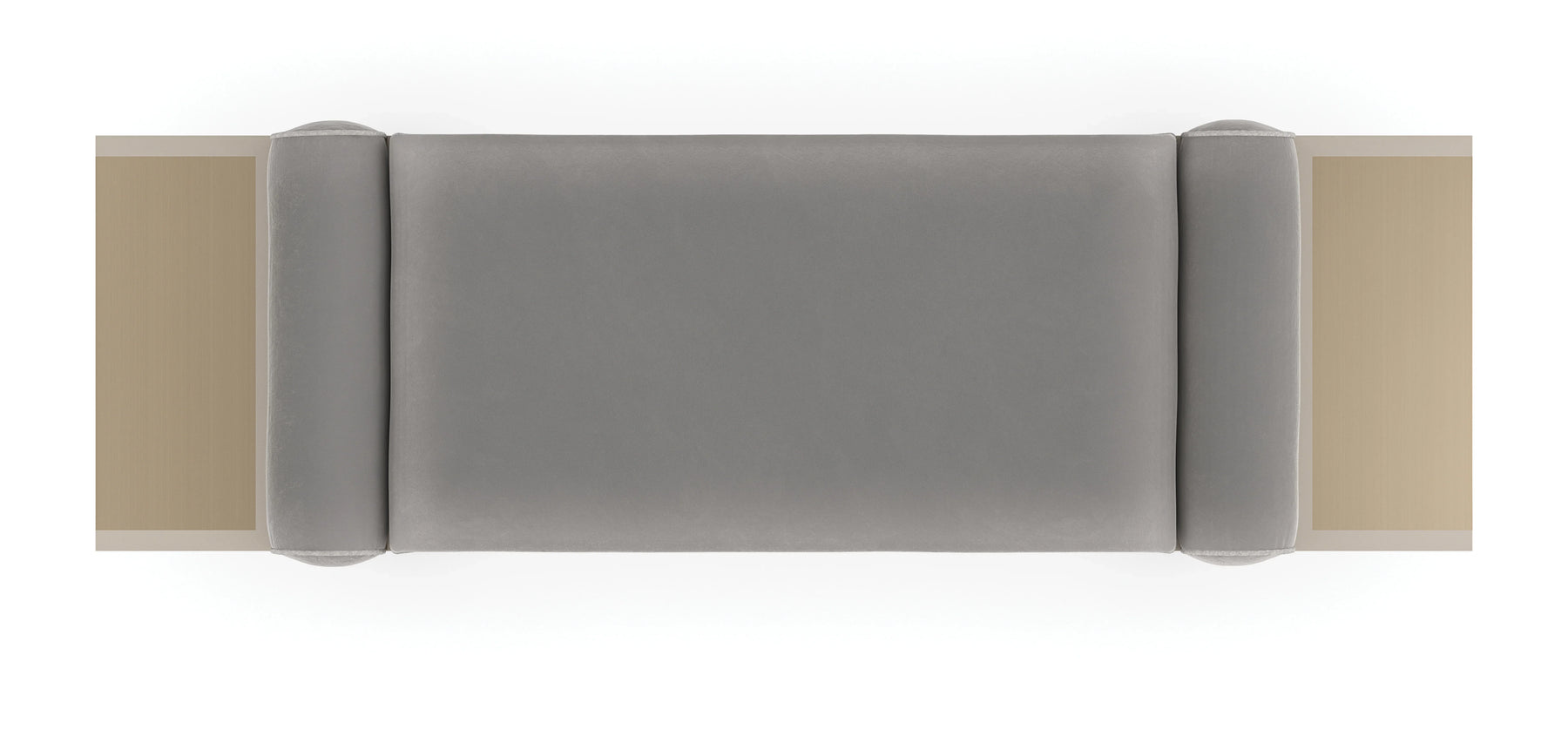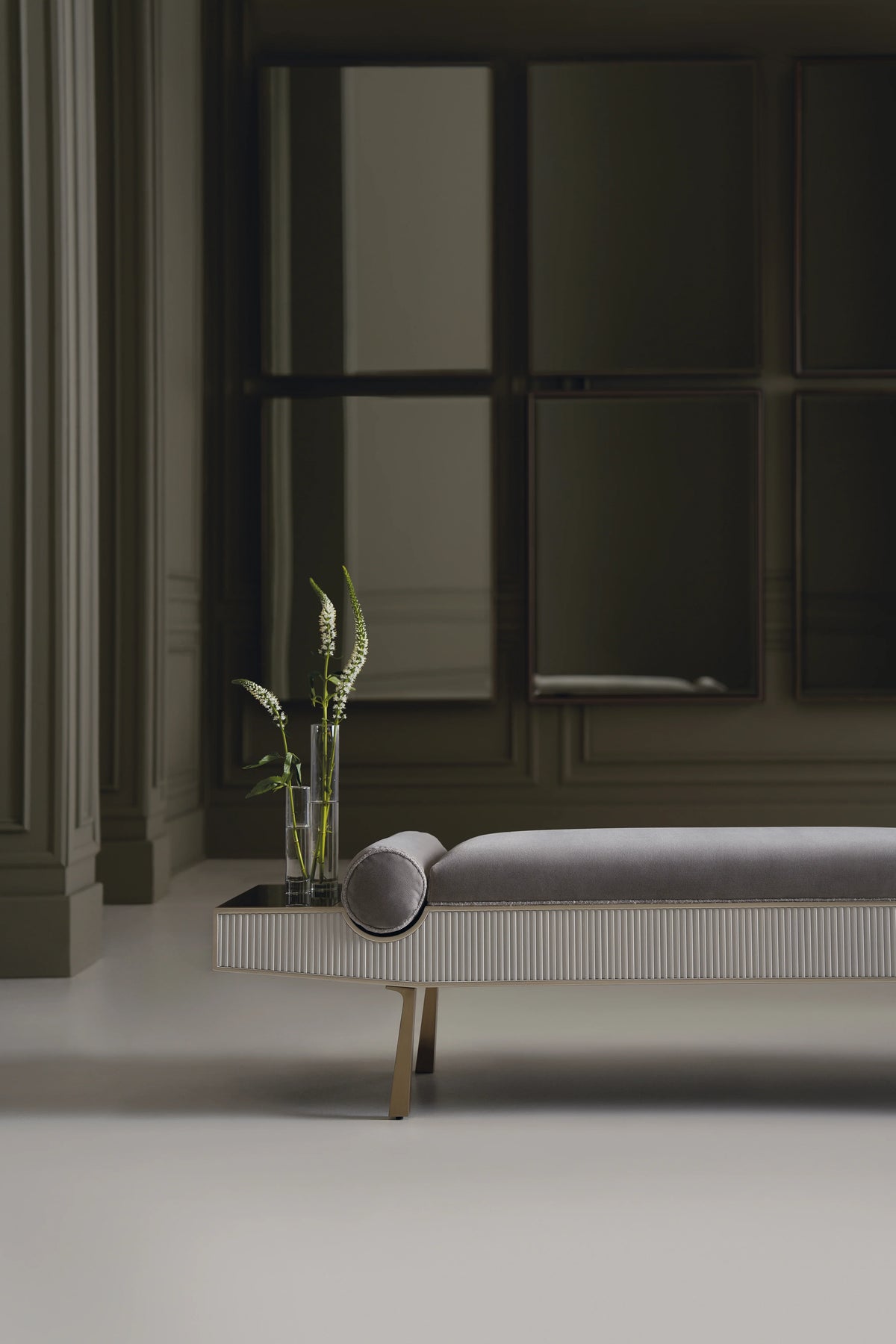 Modern yet elegant in a luxe material mix, this streamlined bench is well-scaled for end-of-bed or an entryway. A reeded apron in a creamy Almond Milk finish brings a sense of rhythm and striking pattern, complemented by a soft gray mohair fabric with a hint of green. Its sleek design featured recessed bolster pillows and opposing metal wings, perfect for placing a book or decorative object. Brushed Gold wraps the ends for a chic finishing touch.