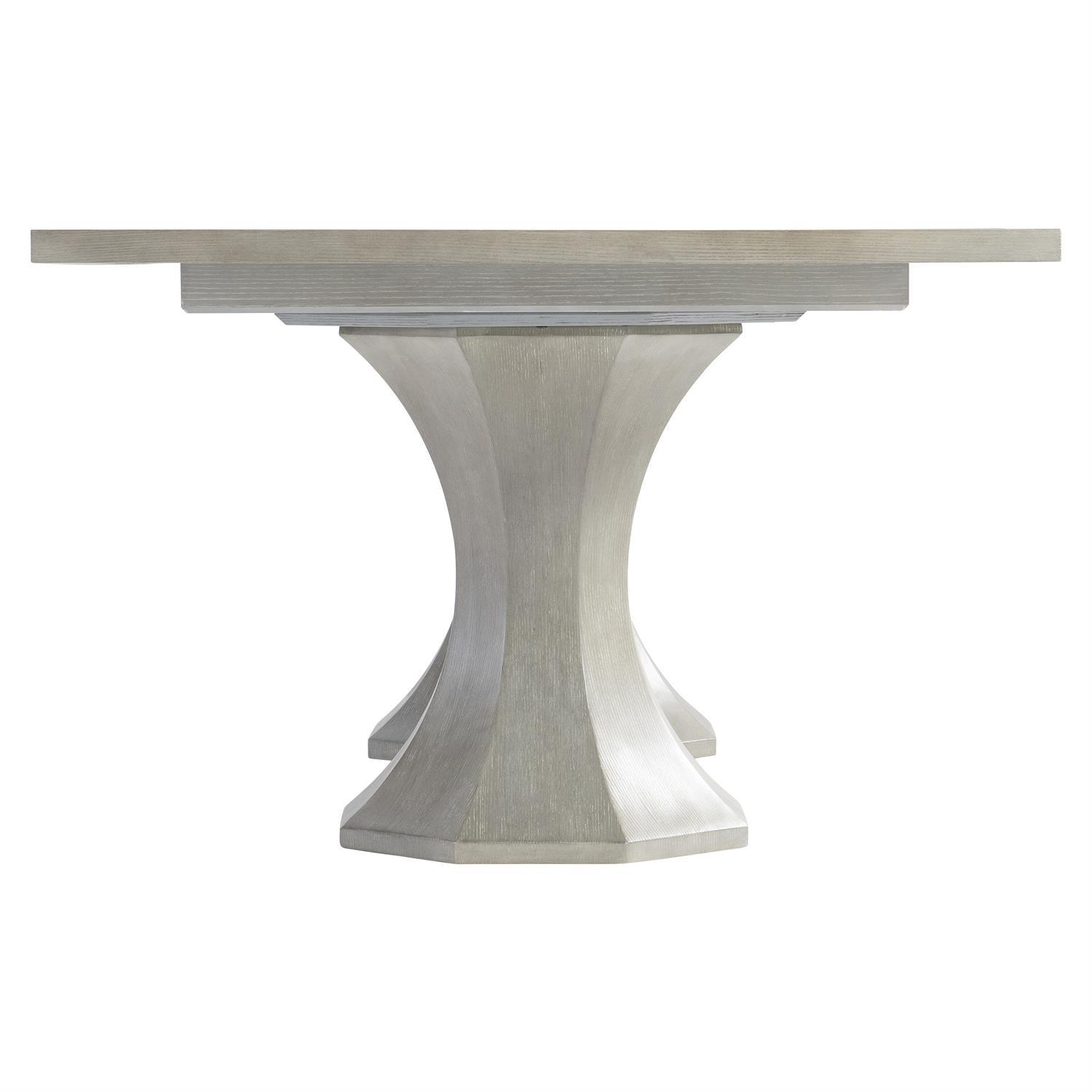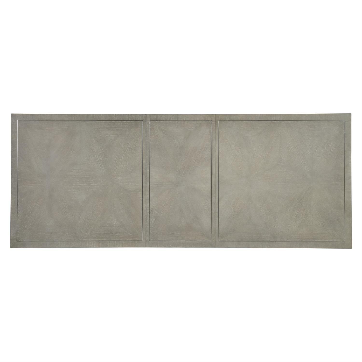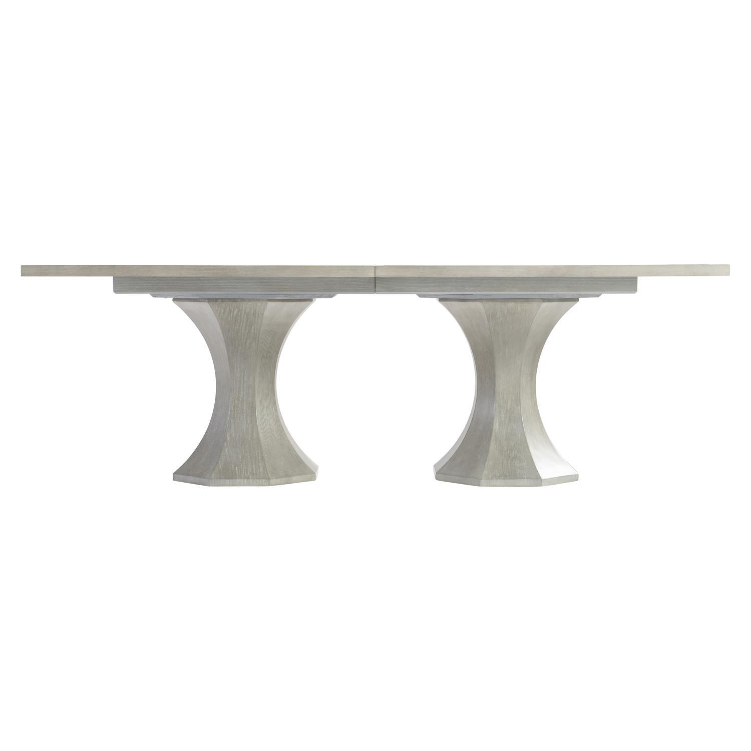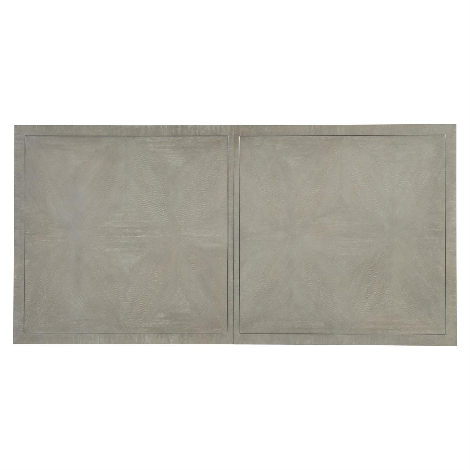 The quality of this piece is apparent from first inspection, with each construction element realized to Bernhardt's precise specifications. An understated, quiet beauty is showcased in the cornelia dining table, two octagonal cast resin pedestals have the look of wood grain in the nebbia finish, and they support a beautiful rectangular top featuring a parquetry top outlined with a brushed stainless steel metal inlay. The cumulative effect of these construction choices is furniture that will maintain its beauty, structural integrity, and functional precision through years of daily use.