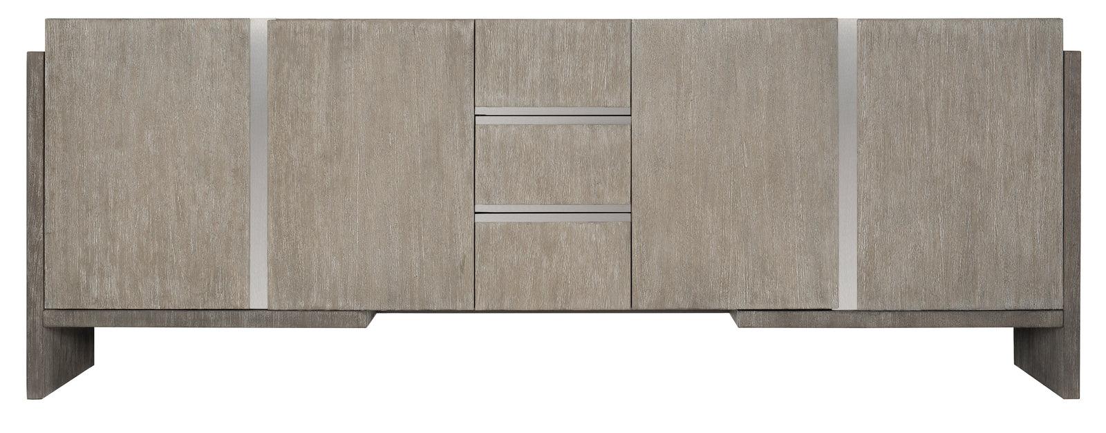 Entertainment Credenza Two-Tone Finish - Case In Light Shale Finish With Support Panels And Rails In Dark Shale Finish. Lsf/Rsf: Two Soft/Self-Closing Doors. Behind Pair Of Doors Is One Adjustable/Removable Shelf And One Fixed Bottom Shelf Surface. Ventilation Holes And One Grommet Hole With Cover In Back Panel. Center: Three Soft-Closing Drawers With Finger Pulls And Inset Brushed Stainless Steel Plate. Wrapped Pad In Each Drawer. Four Leg Posts. Adjustable Glides