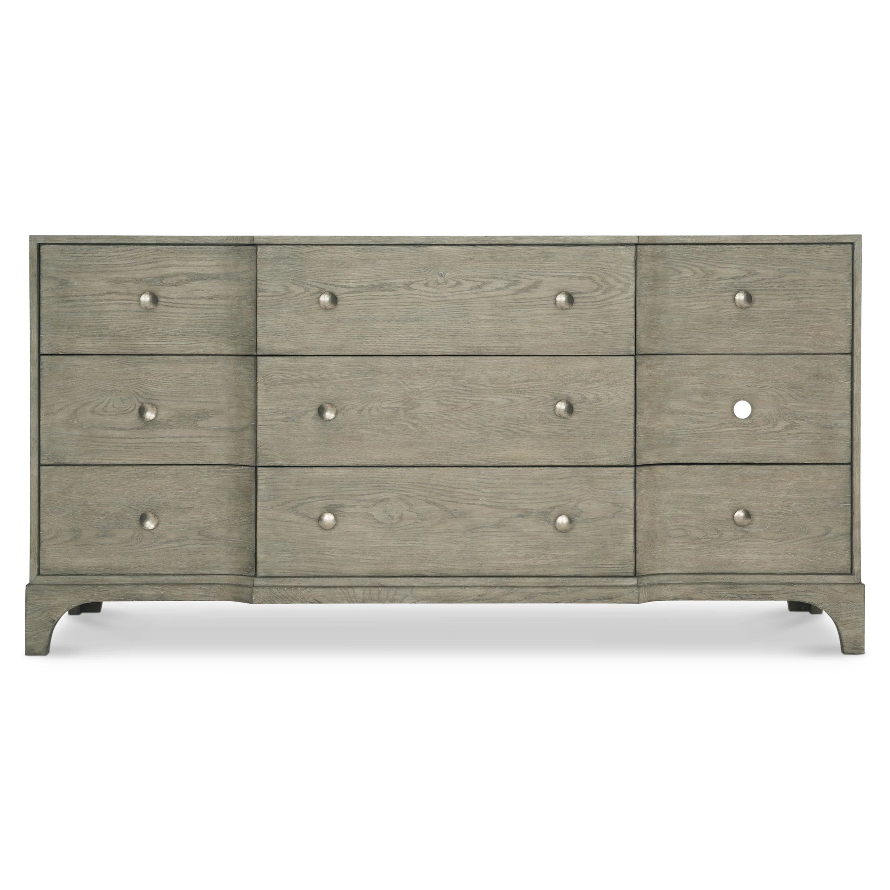 Pewter Finish. Breakfront-Style Dresser With Nine Soft-Close Drawers. Adjustable Glides.