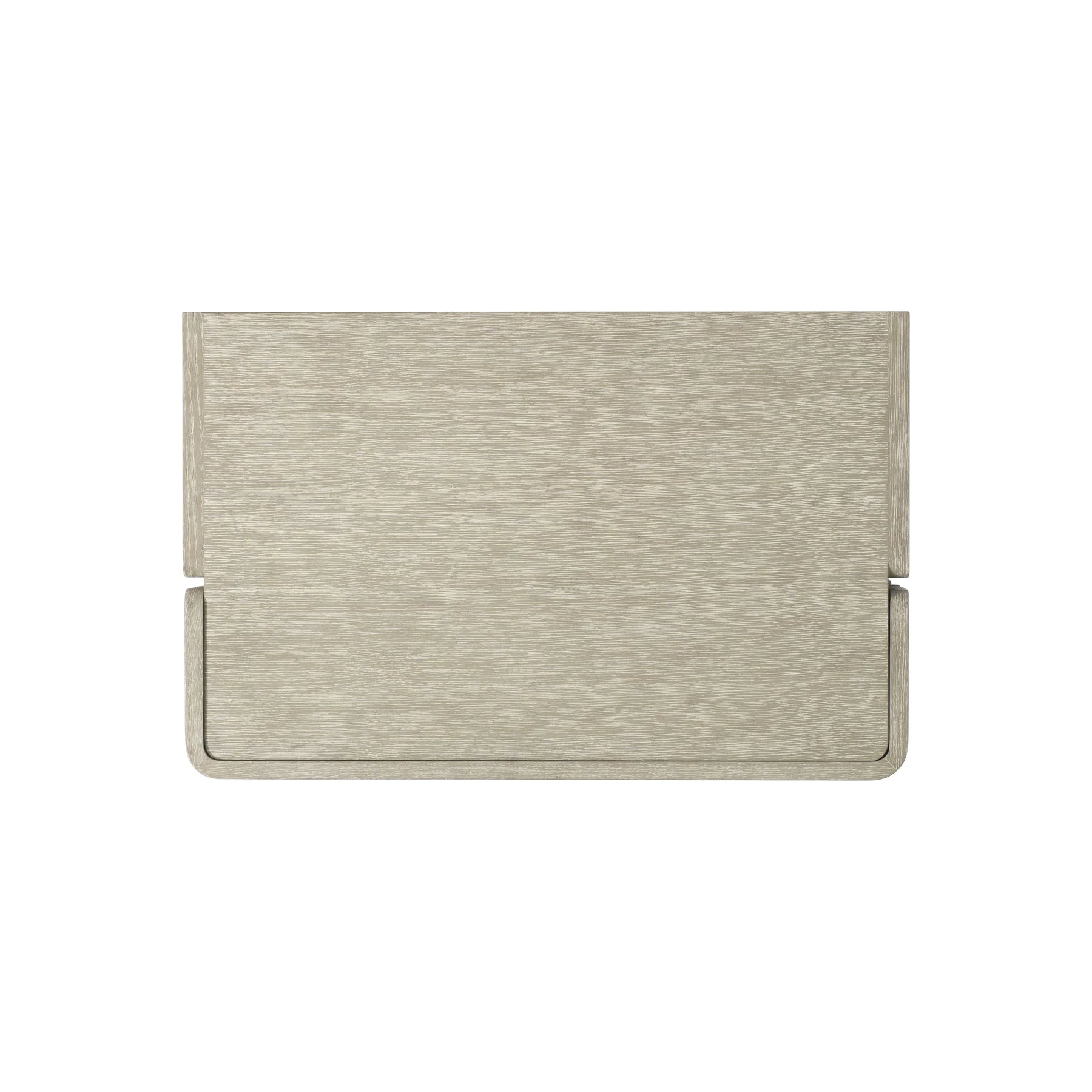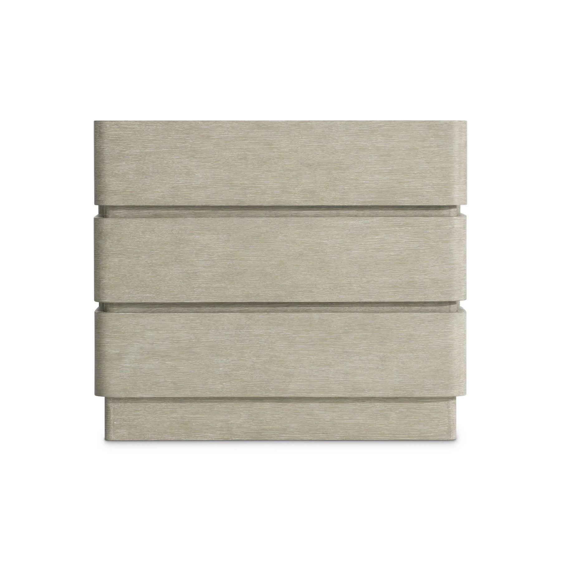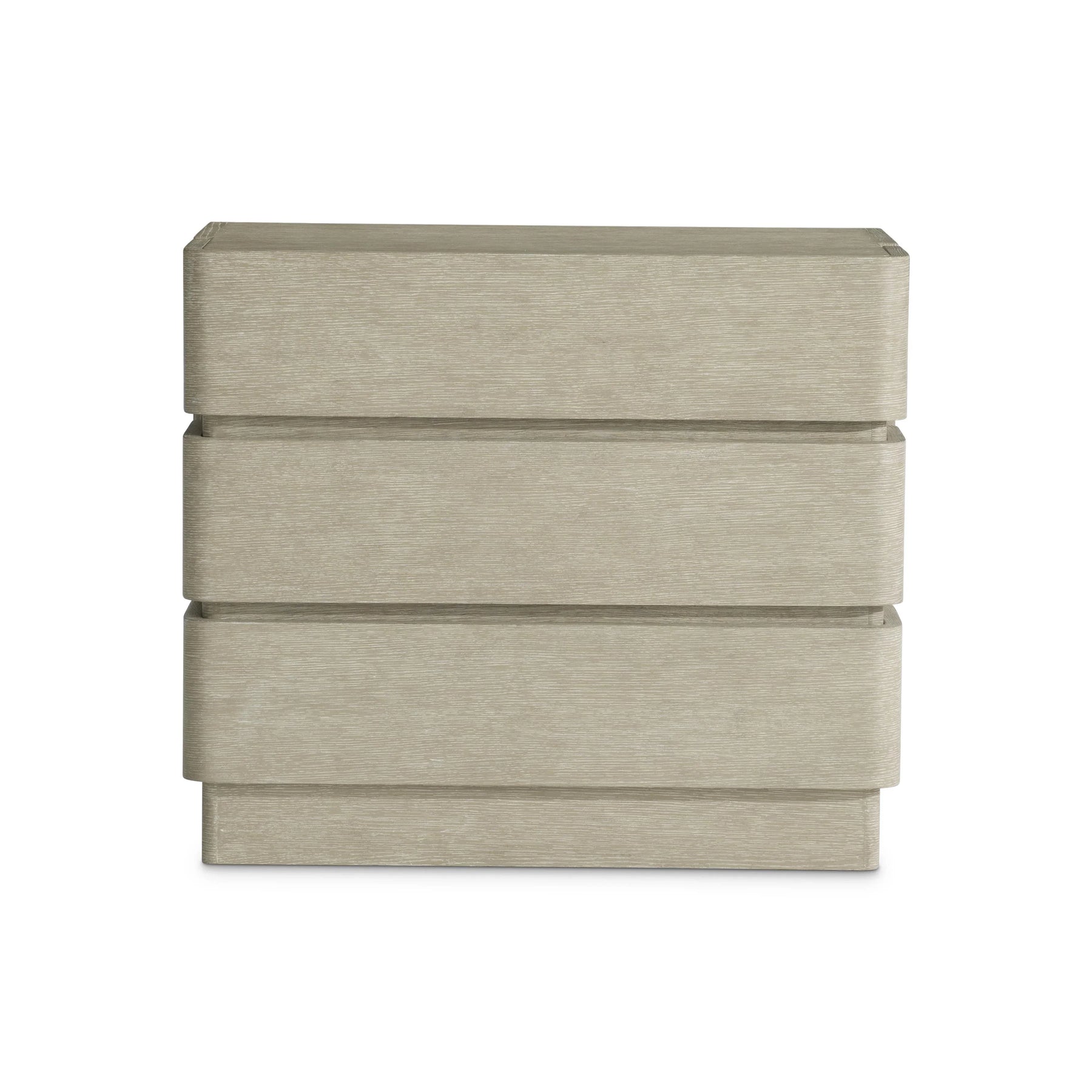Wirebrushed Oak Nightstand With Three Wrap Around Design Soft-Close Drawers With Finger Pull In Clay Finish. Plinth Base. Adjustable Glides.