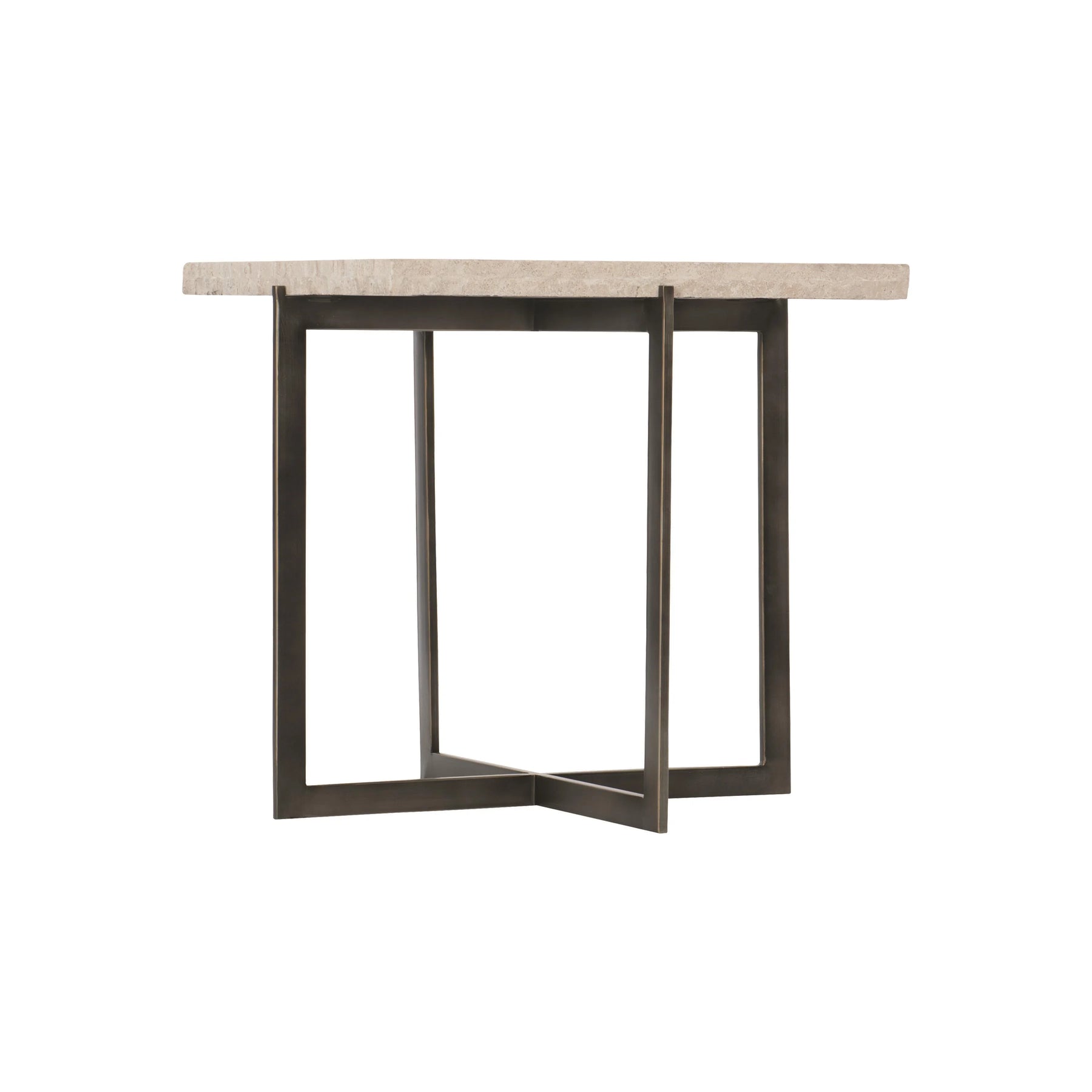 Laminated White Travertine Stone Tops. Tubular Steel Base In Oil-Rubbed Bronze Finish. Adjustable Glides.