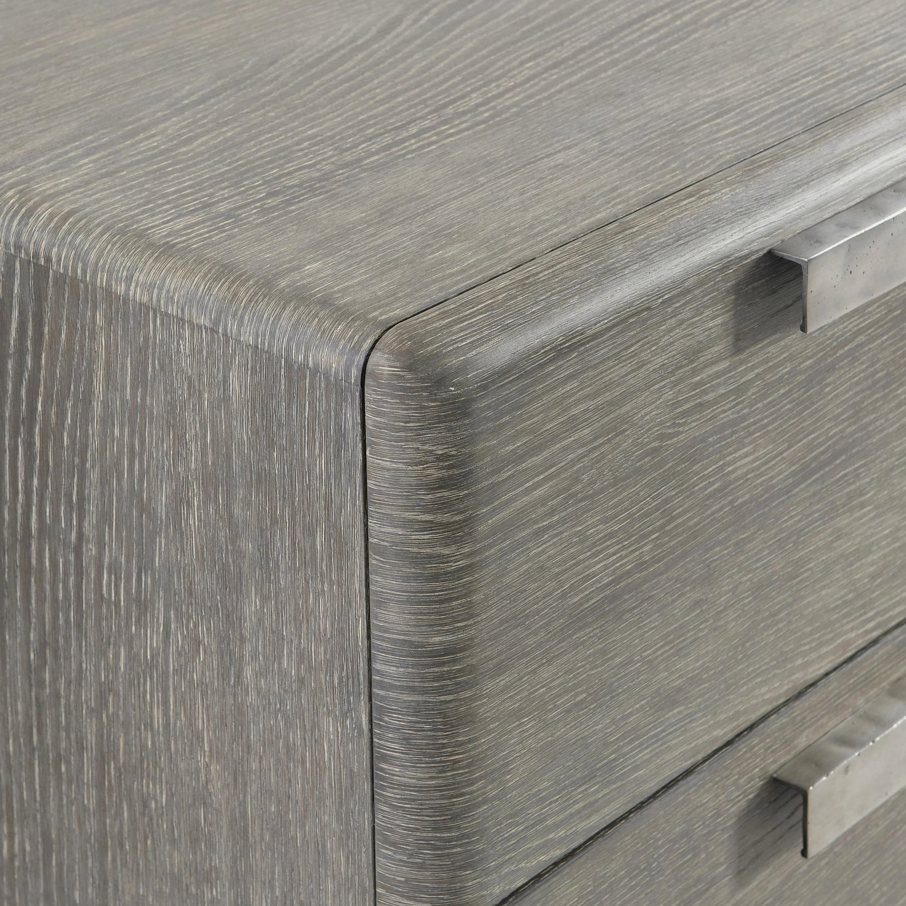 The Monolith Dresser Has A Distinctive Modern Style With An Offset Vertical Post Between Two Sections Set On Plinths. On The Left Are Two Deeper Soft-Close Drawers With Cast Aluminum Tab Pulls In Graphite Finish. On The Right Are Three Longer Drawers With The Same Beautiful Hardware. The Overall Design Has A Deeply Textured Look In Puma Finish.