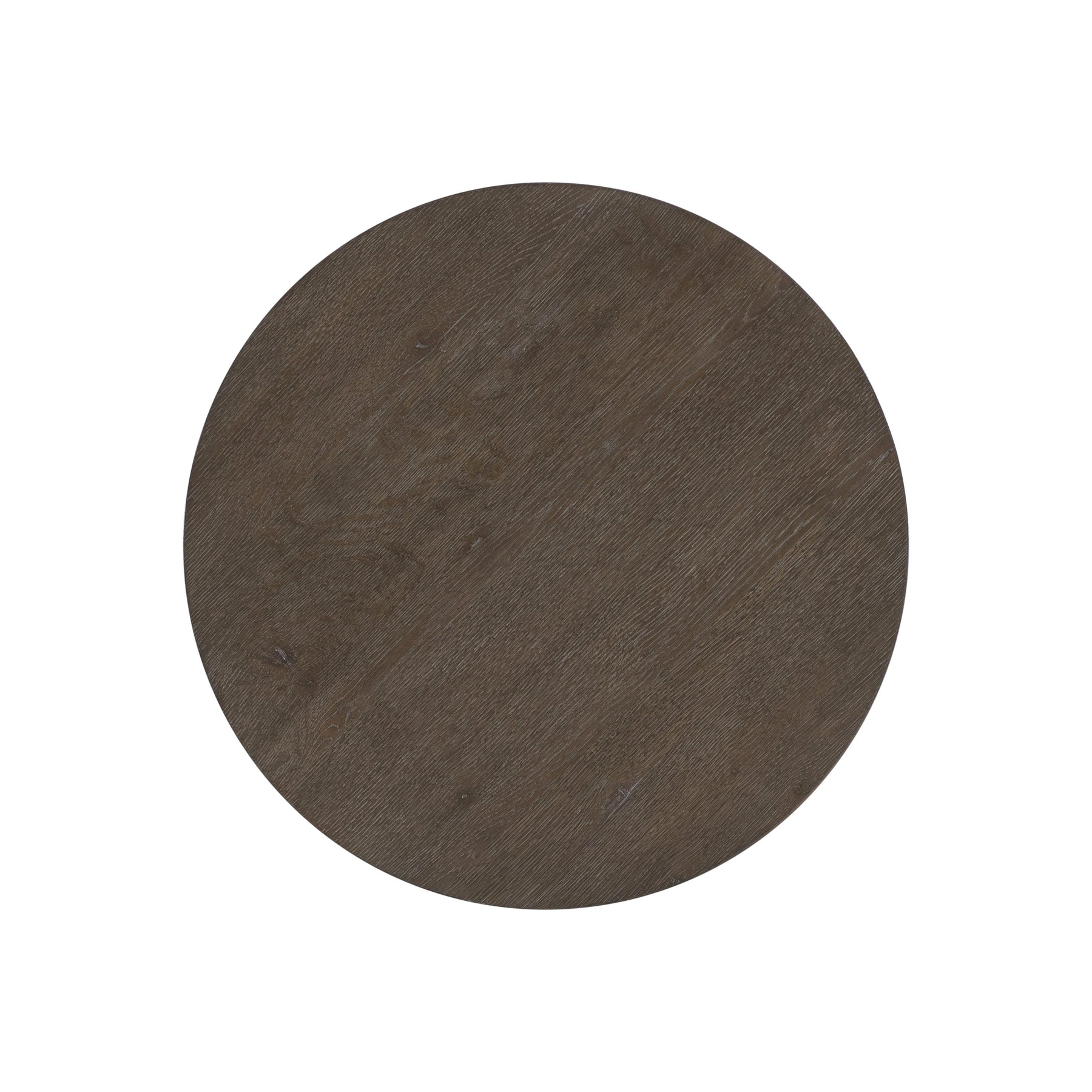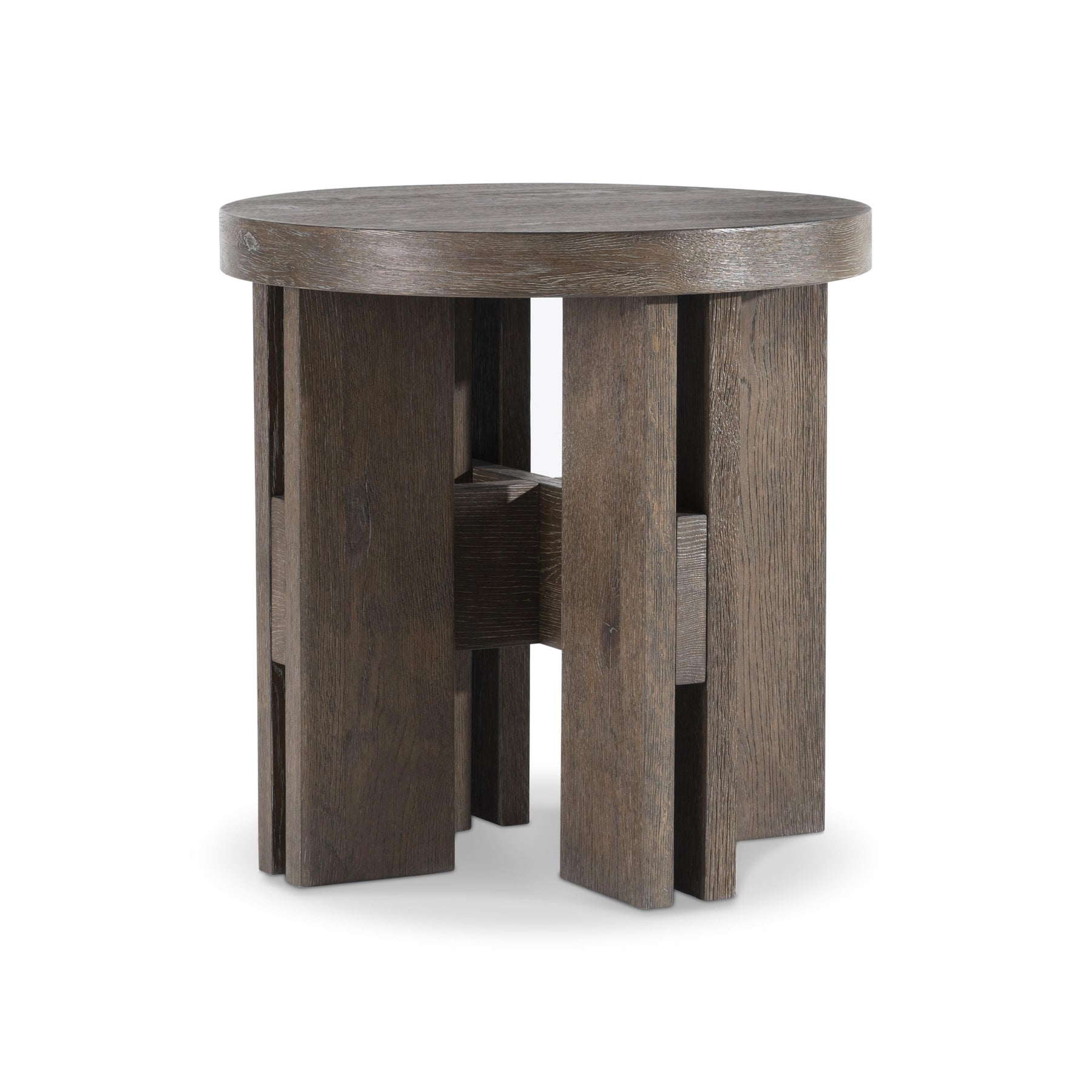 Inspired by the architectural style of Frank Lloyd Wright, the Outline side table highlights the bold forms and simple lines of the Arts and Crafts movement. Deeply textured wood finished in Cassel is fashioned into geometric shapes that showcase craftsmanship. Rectilinear panels bisect for the base, supporting a sleek round top.