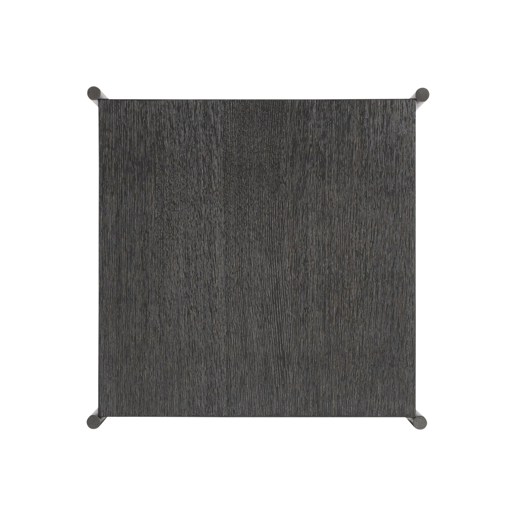 The Outline side table has a sleek metal frame that includes slim pillars that support each corner. The top appears to float above the x-shaped stretcher, giving a lightness to the solid form. The wood is finished in a deep Kohl while the metal glows in Atra.