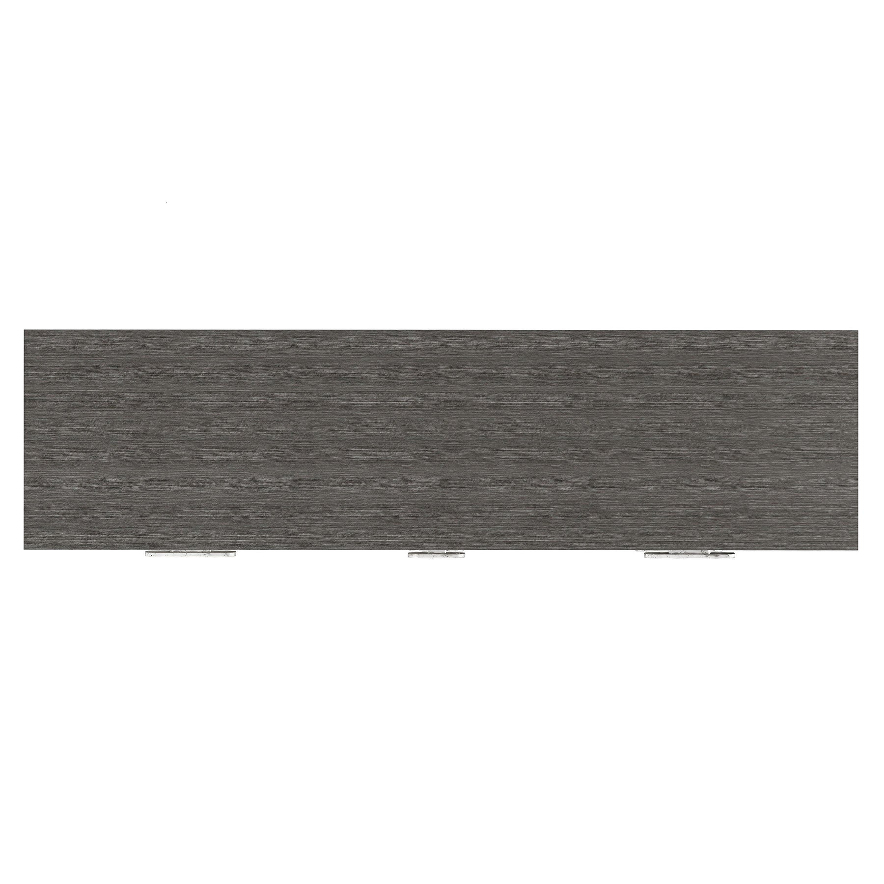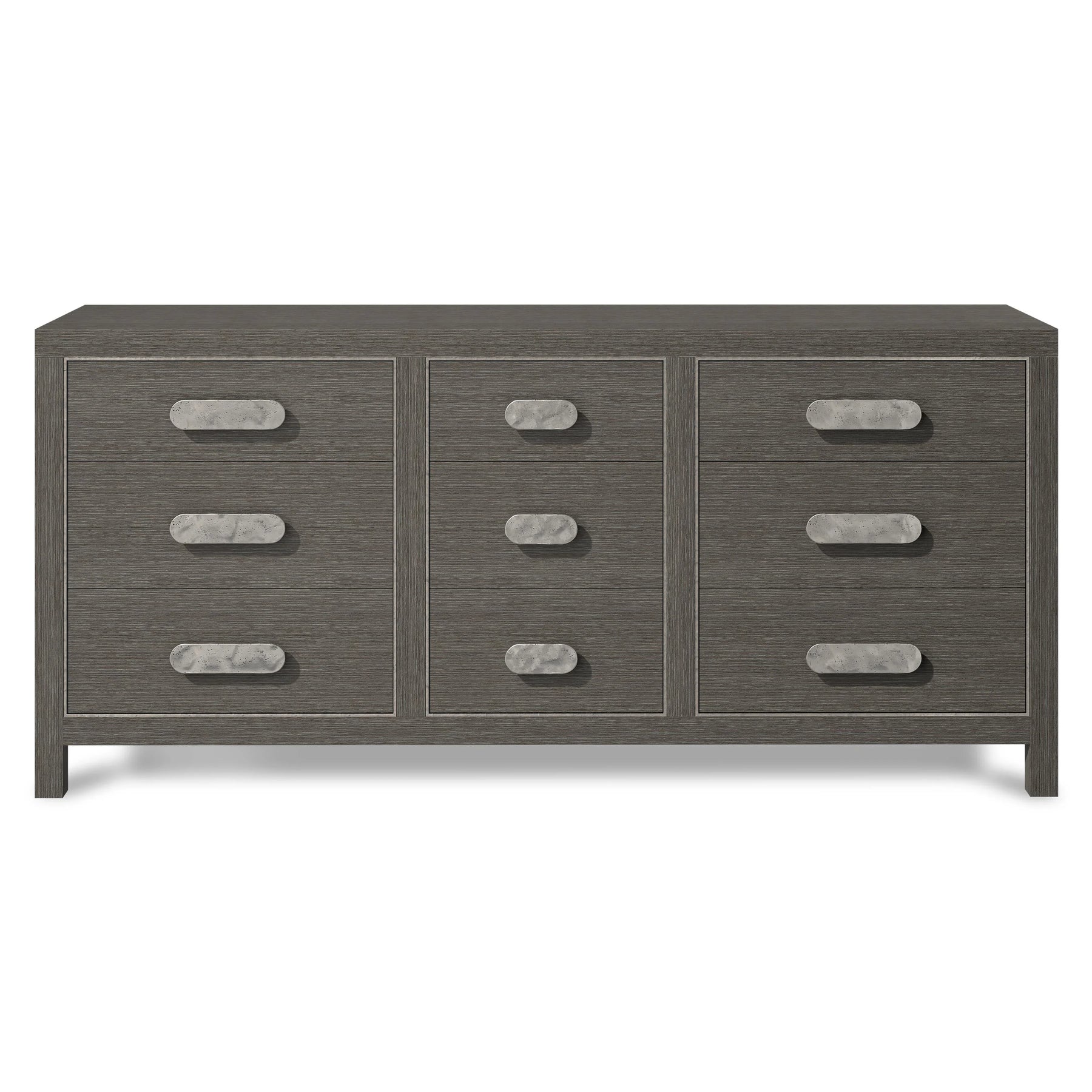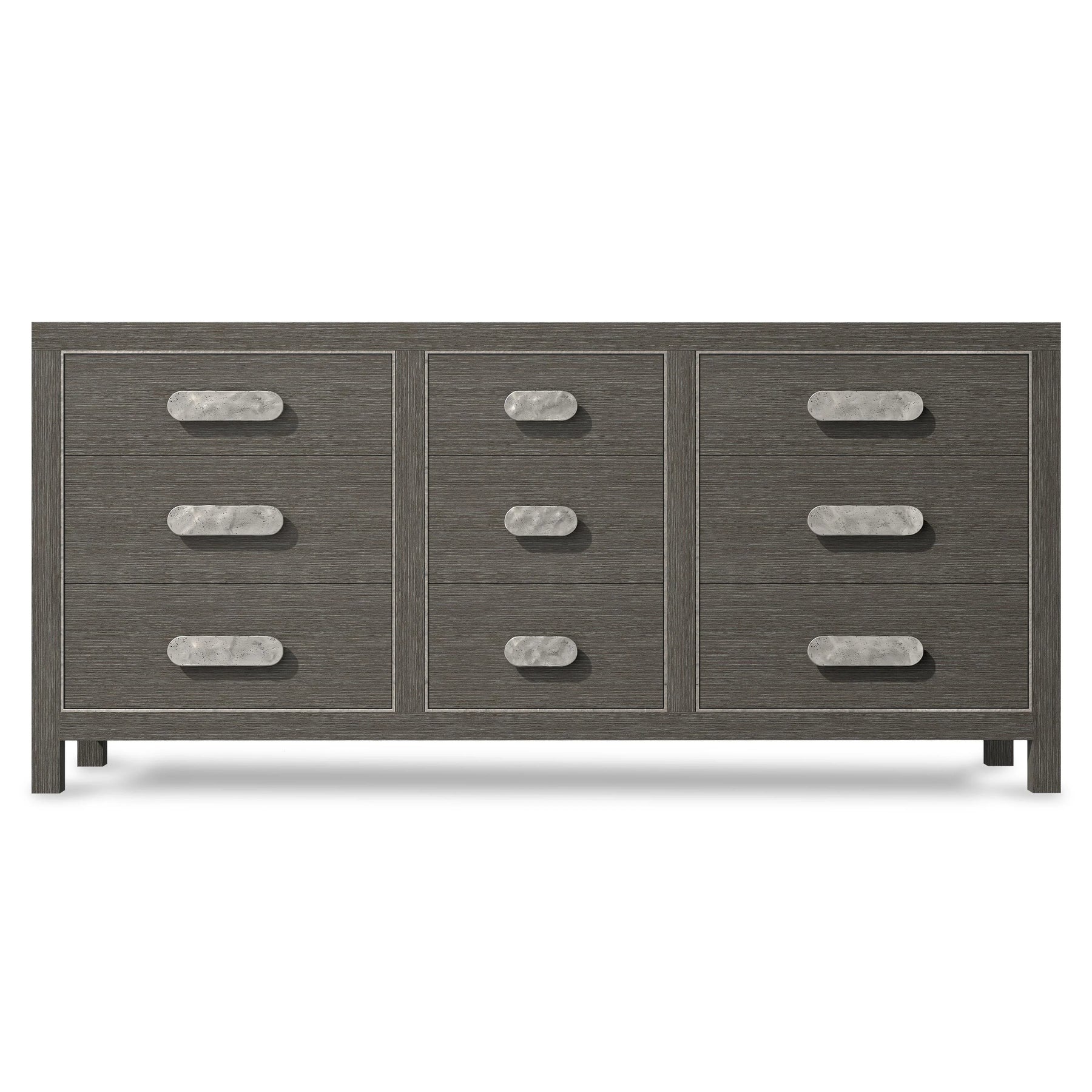 Ash Wood Veneers And Quartered Oak Veneer In Procini Finish. Nine Soft-Close Drawers: Siz Wider Drawers On Left And Right And Three Narrow Drawers In The Center. Textured Metal Drawer Pulls And Inset Metal Frame Around Each Of The Three Drawer Banks In Bright Graphite Finish. Four Legs And Two Center Support Legs In Porcini Finish. Adjustable Glides.