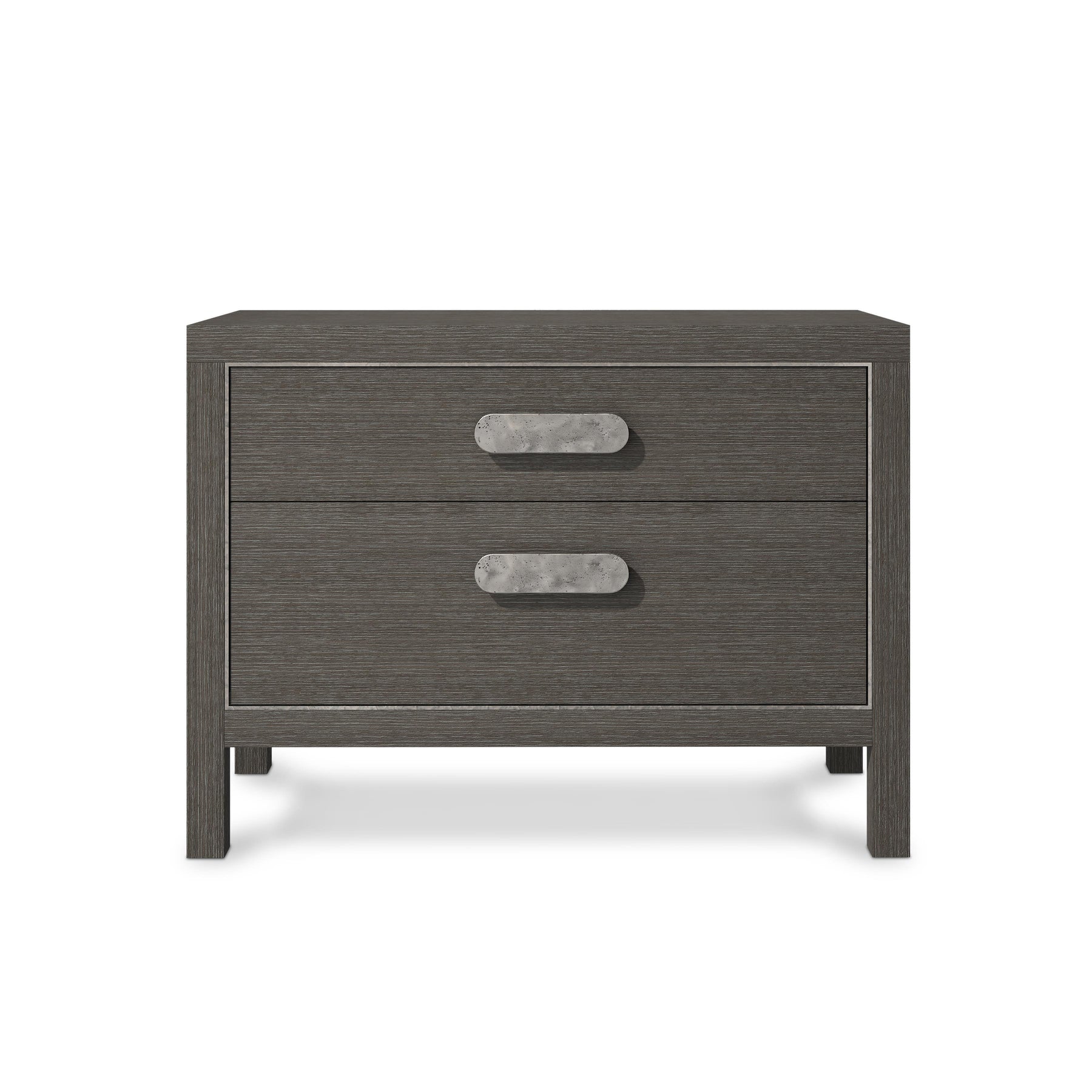 Porcini Finish. Two Soft-Close Drawers. Inset Metal Frame In Bright Graphite Finish Around Drawer Bank. Adjustable Glides. Two-Port Usb Charging System On Back Of Case.