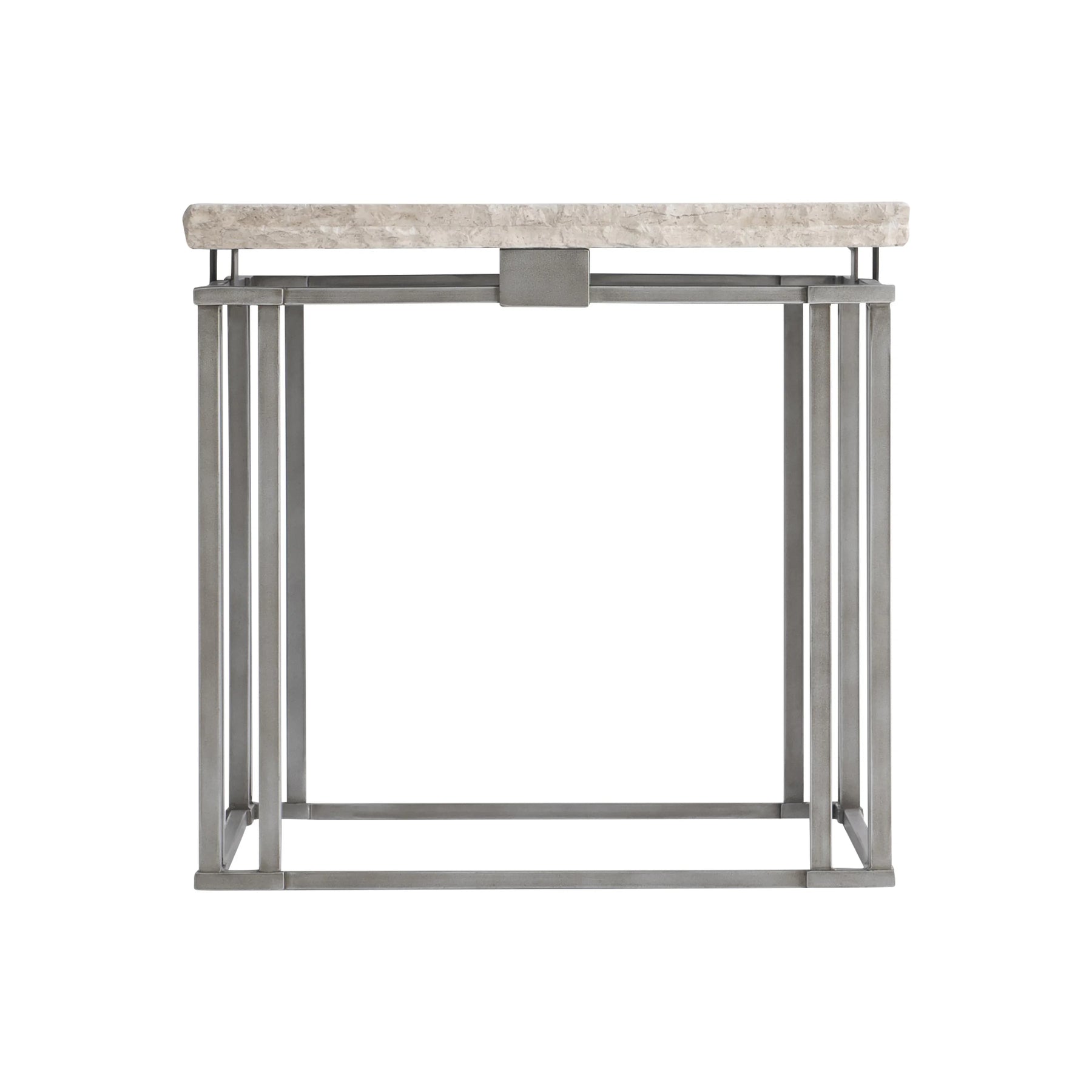 Honed Bianco Travertine Laminated Stone Top. Chiseled Edges. Metal Base In Silver Finish. Adjustable Glides.