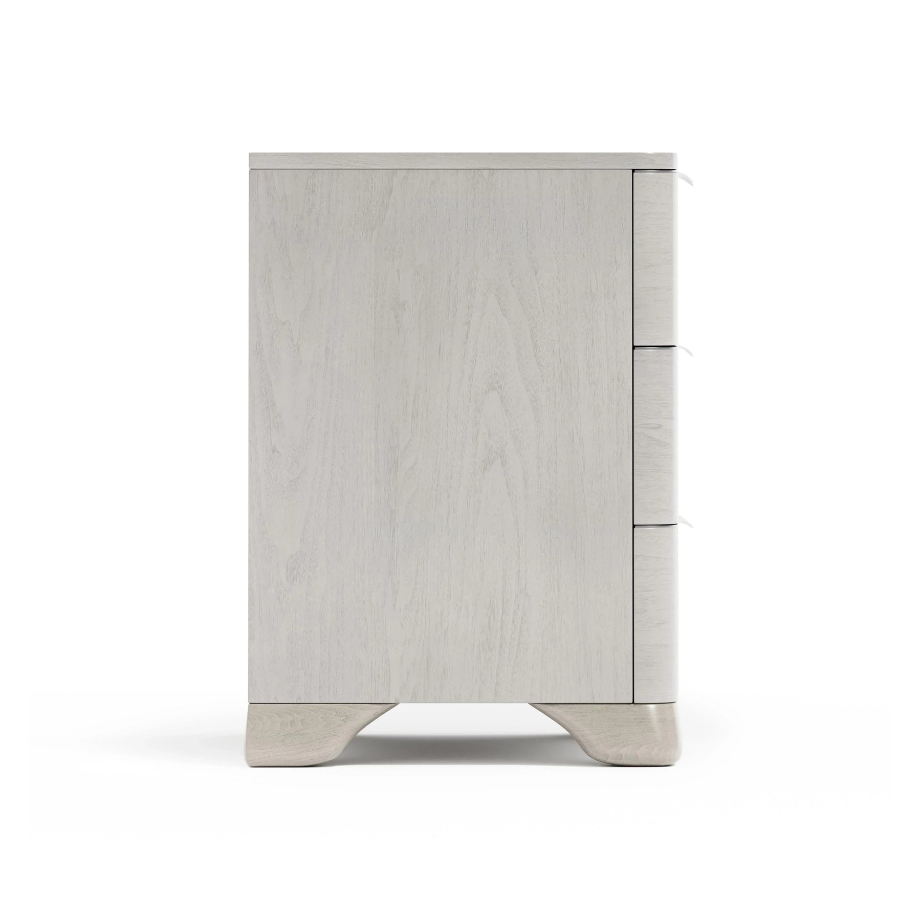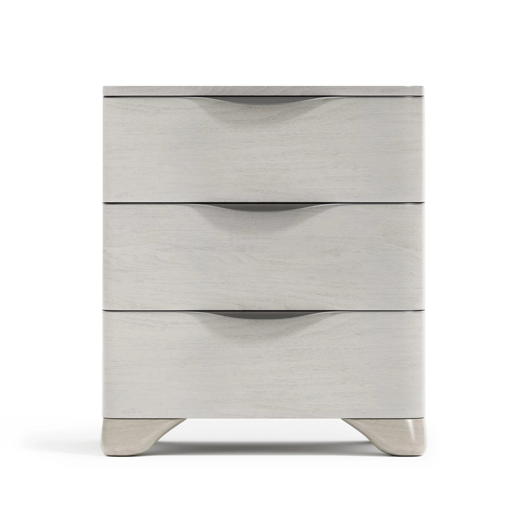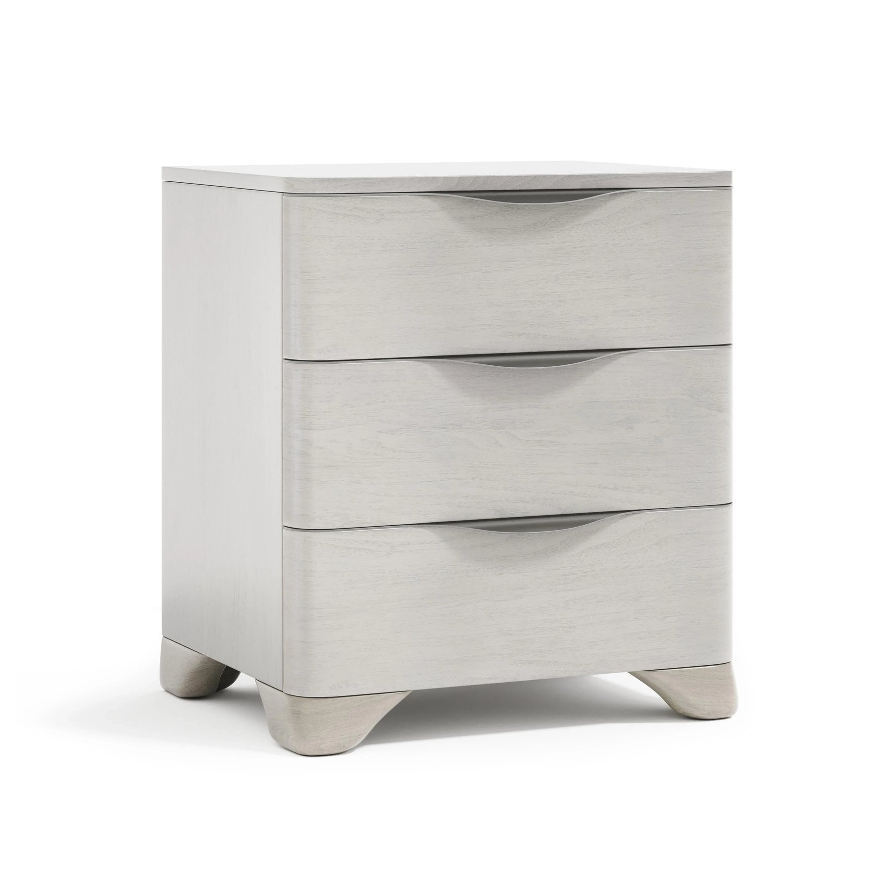 Walnut Nightstand In Lutra Finish With Three Soft-Close Drawers With Full Length Brushed Stainless Steel Pulls In Nickel Finish. Cast Resin Feet With Faux Stone Texture. Two Port A+C Usb Charging Unit.