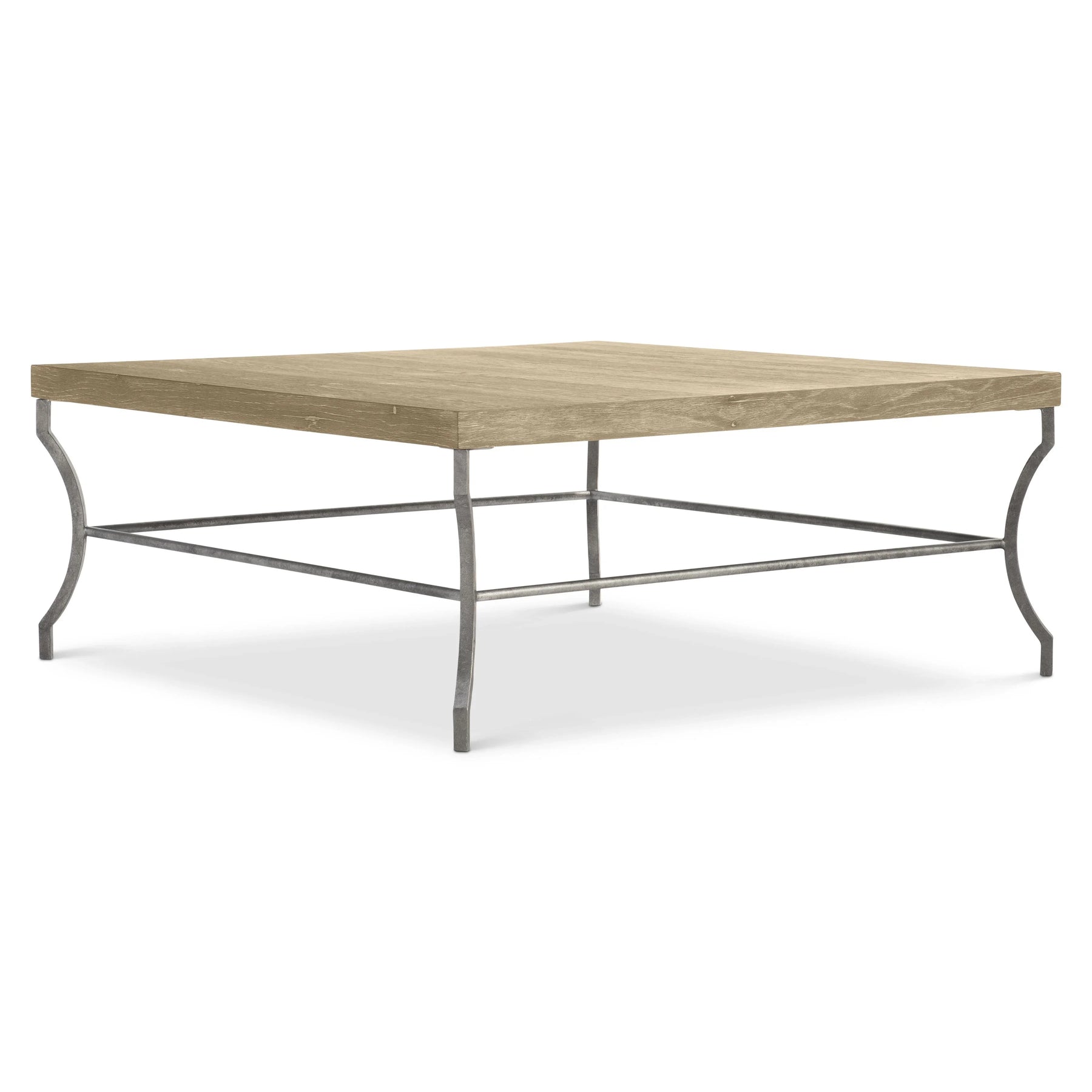 Square Cocktail Table With Wirebrushed Oak Top In Aurum Finish. Textured Steel Base And Stretcher In Barlow Finish. Adjustable Glides.
