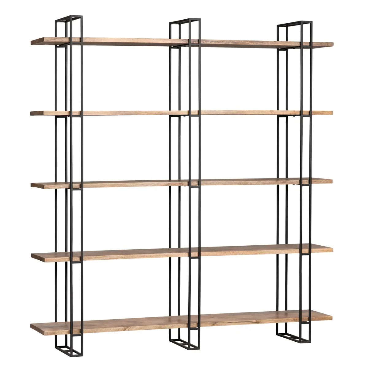 With a striking combination of brown and black hues, this rectangular etagere blends industrial and rustic charm. Crafted from mango wood and iron, it features five fixed exterior shelves with an open design for versatile storage and display. The iron frame consists of slim vertical and horizontal bars, creating a geometric pattern that enhances its modern aesthetic. Stained for a rich finish, the natural wood grain brings warmth and character to the piece, making it an eye-catching addition to any space