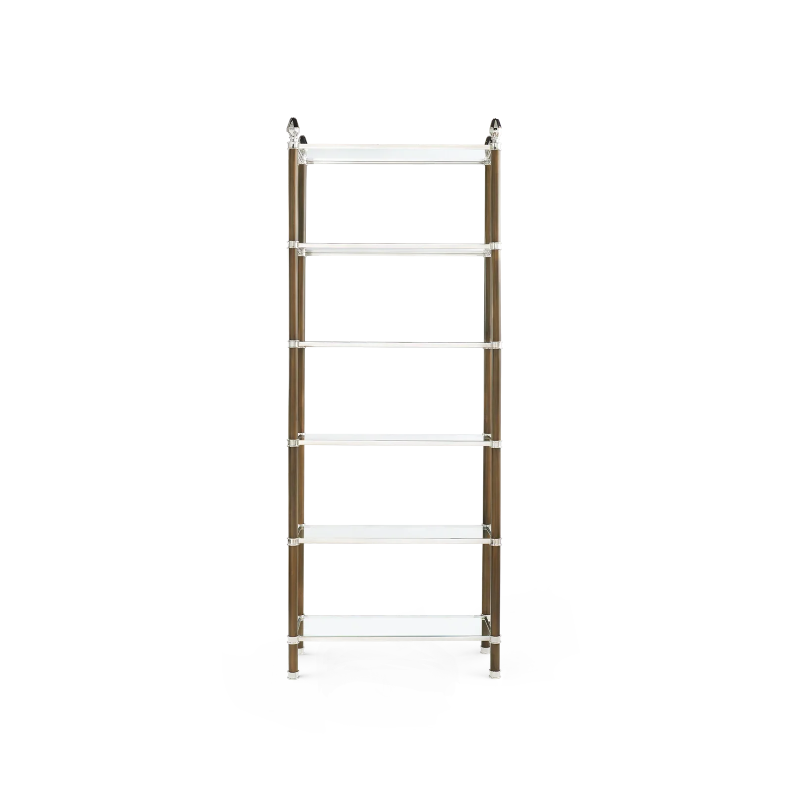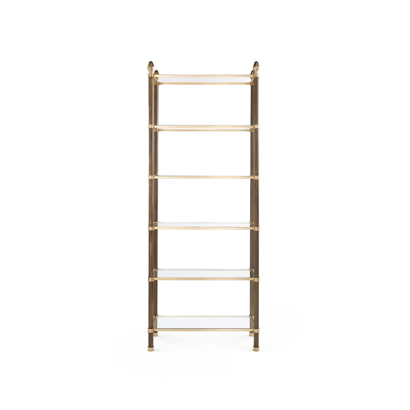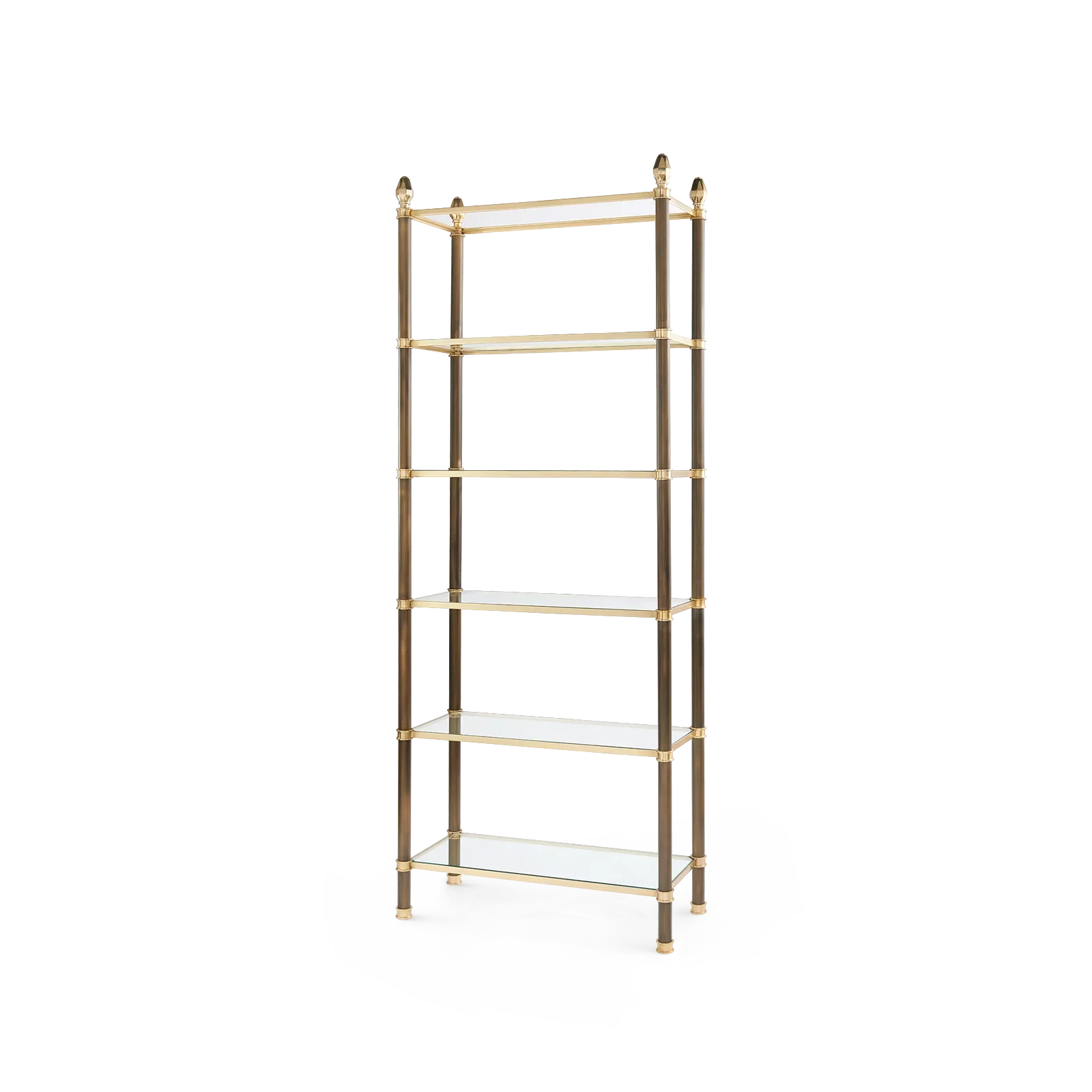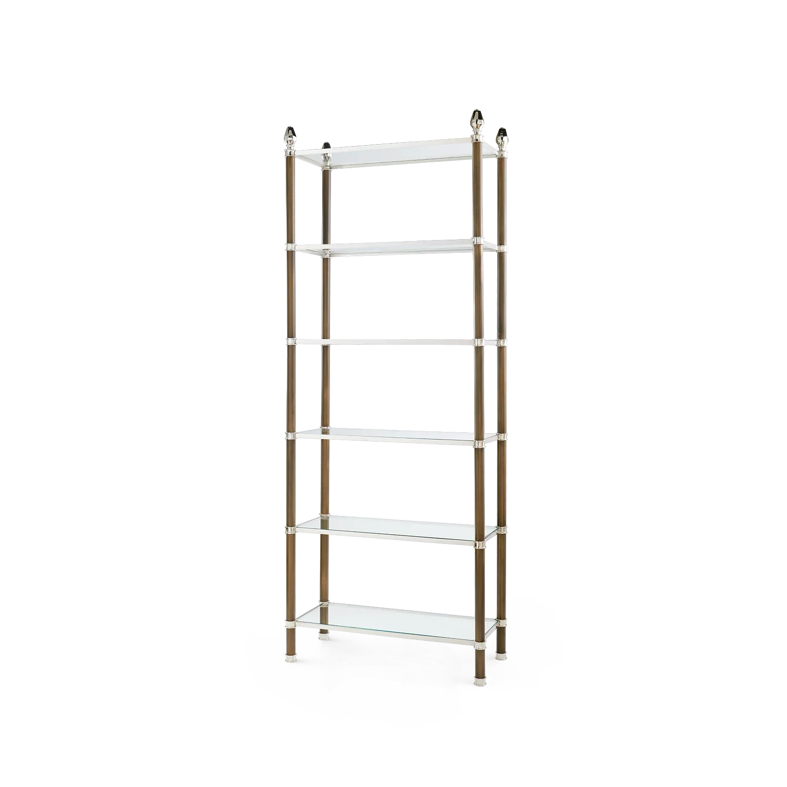 With a nod to the Neo-classical, the Pierce Étagère is perfect for showcasing your personal items with a glamorous touch. Mixed finishes add visual interest and dimension as the uprights are finished with bronze, and the frame and accents come in a choice of either solid brass or polished nickel. The slim frame is paired with tempered glass shelves to keep the overall effect feeling nice and light, and topped off with a geometric acorn style finial. The Pierce would easily pull together any living room, office, or bedroom with its classic and timeless simplicity.