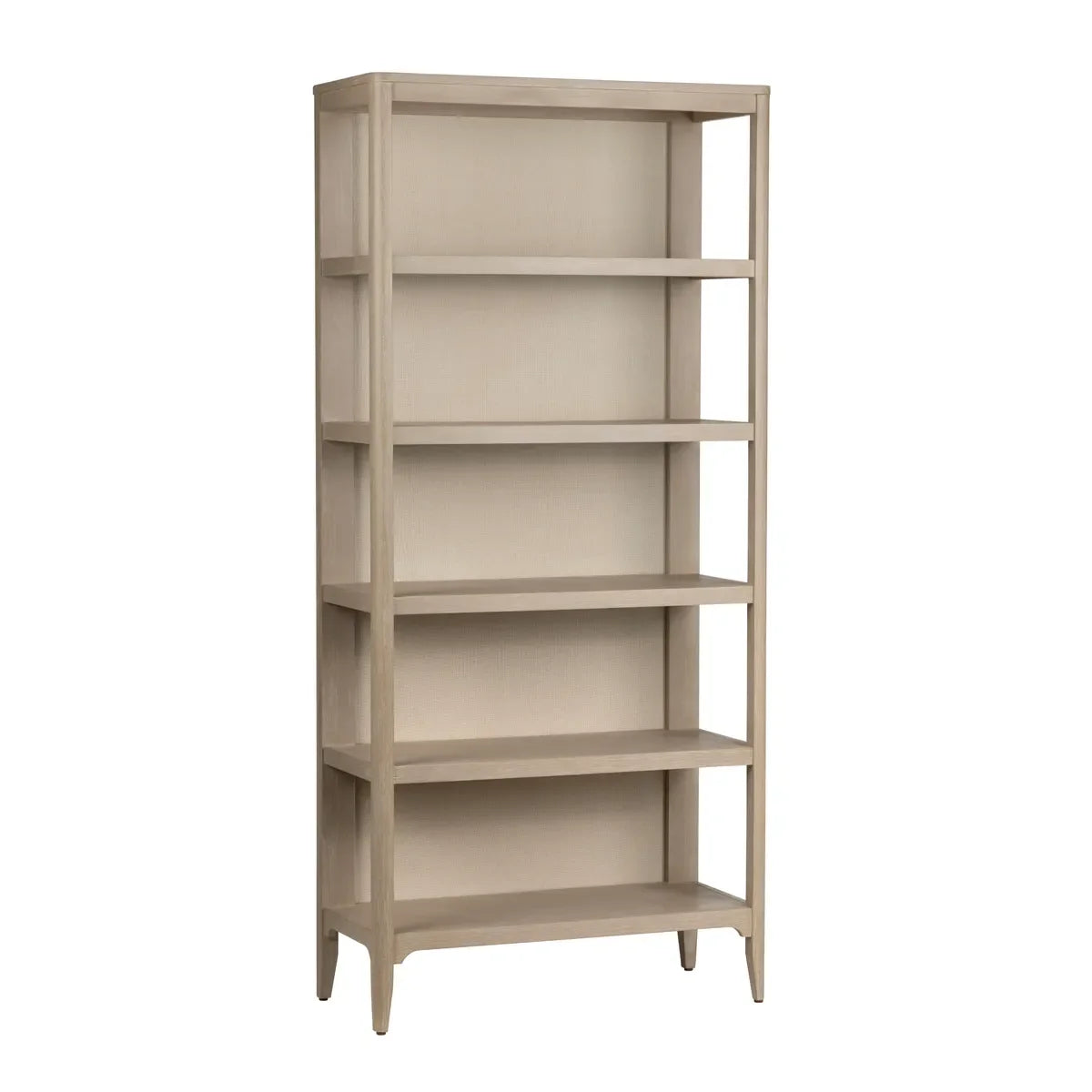 This bookcase features a sleek rectangular silhouette with five fixed exterior shelves, offering both display and storage functionality. Crafted with a light natural wood grain finish, the frame highlights a subtle textured appeal, complemented by a fabric-paneled back for added depth. Its tall, open structure is supported by tapered legs, giving it an airy elegance. Designed for easy setup, this piece seamlessly blends functionality with modern style, making it a versatile addition to any space