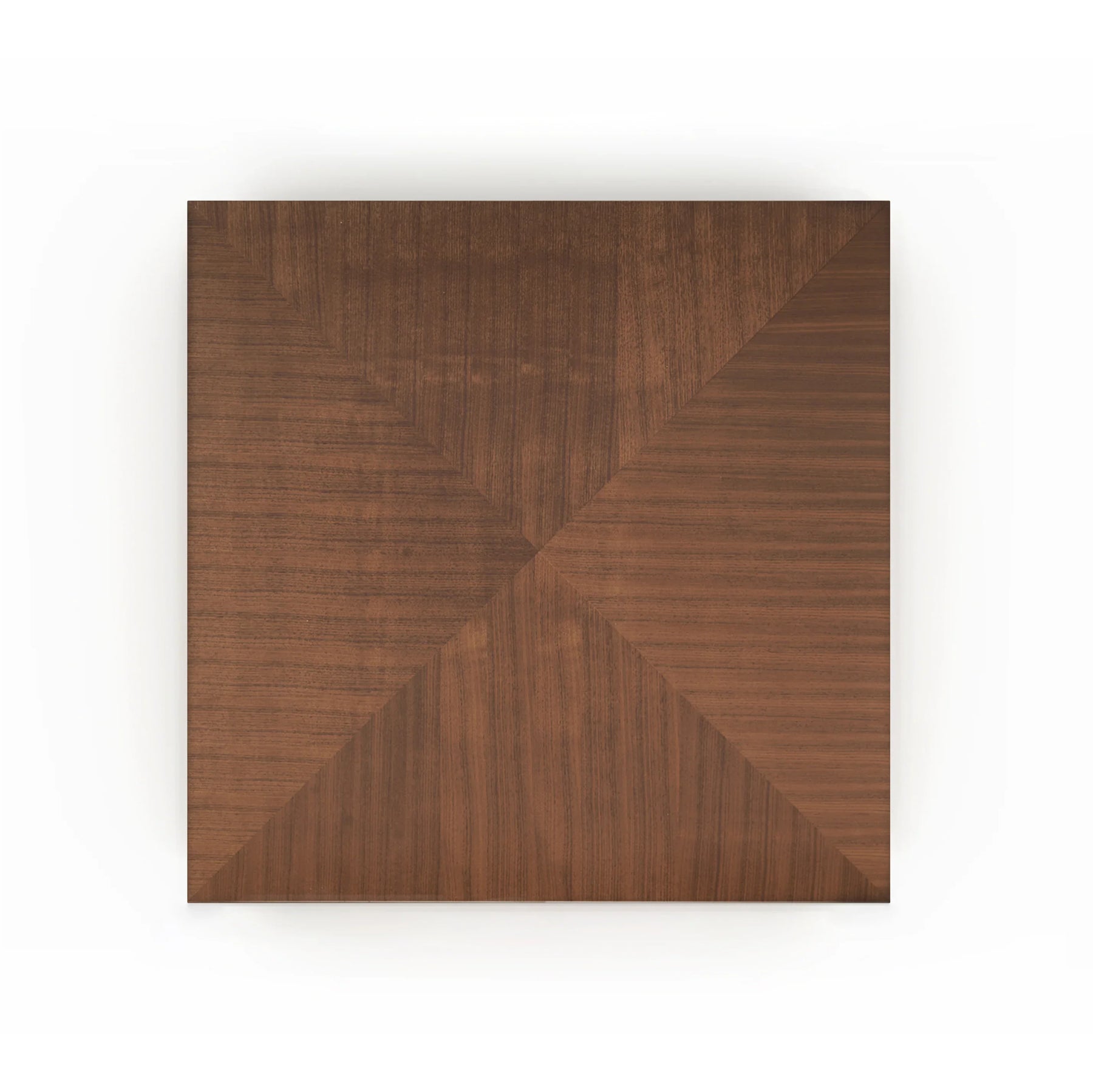 Bello is a beautiful celebration of a classic wood. Book-matched Retro Walnut veneers are hand-applied in intersecting triangles on the top of the table. The veneers seamlessly continue down the sides of the block-style table to a thin plinth with Retro Walnut running in a contracting direction. This is a substantial piece that pairs well with large sofas in sizeable seating areas. Designed and sized to fit modularly into Bello upholstery.