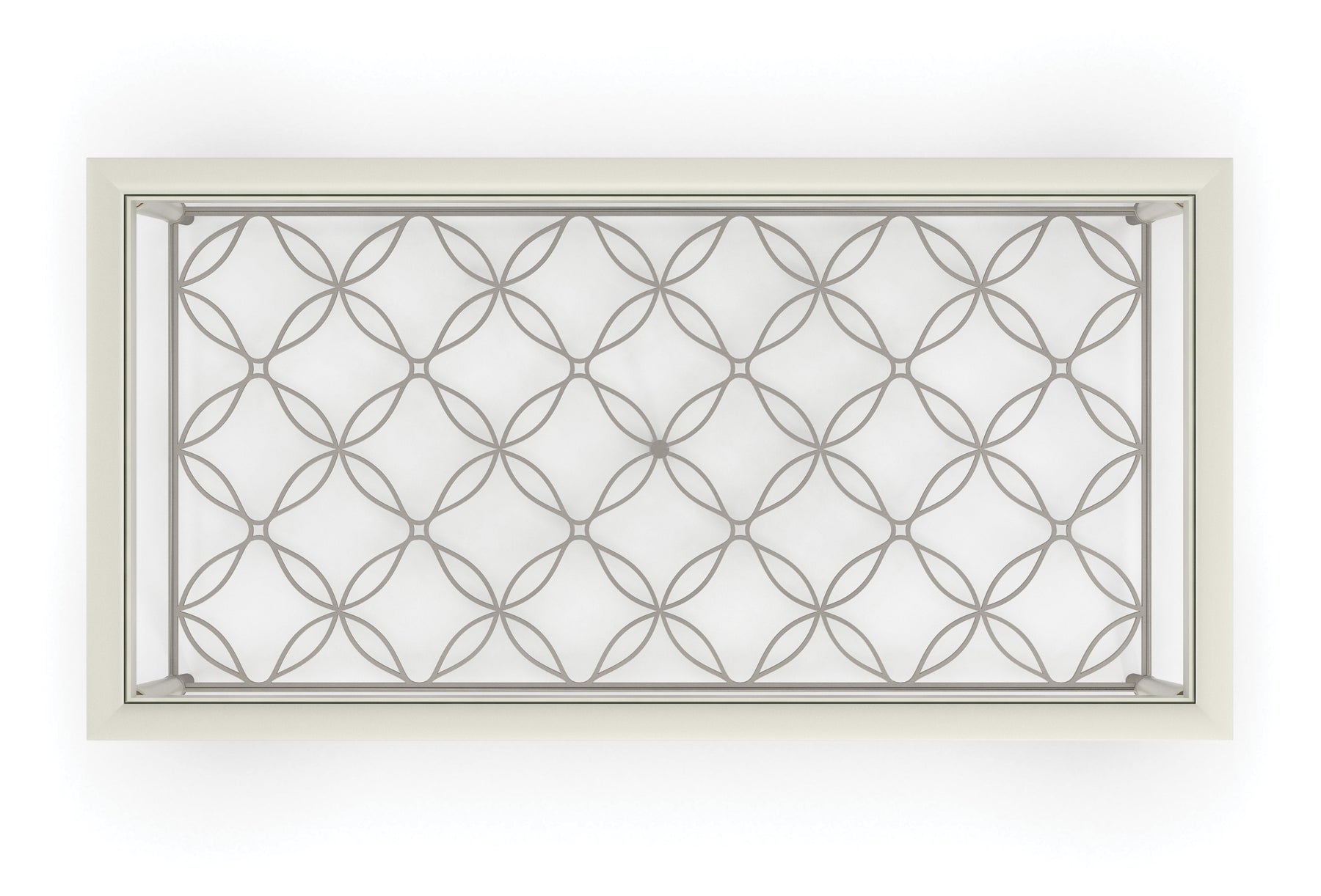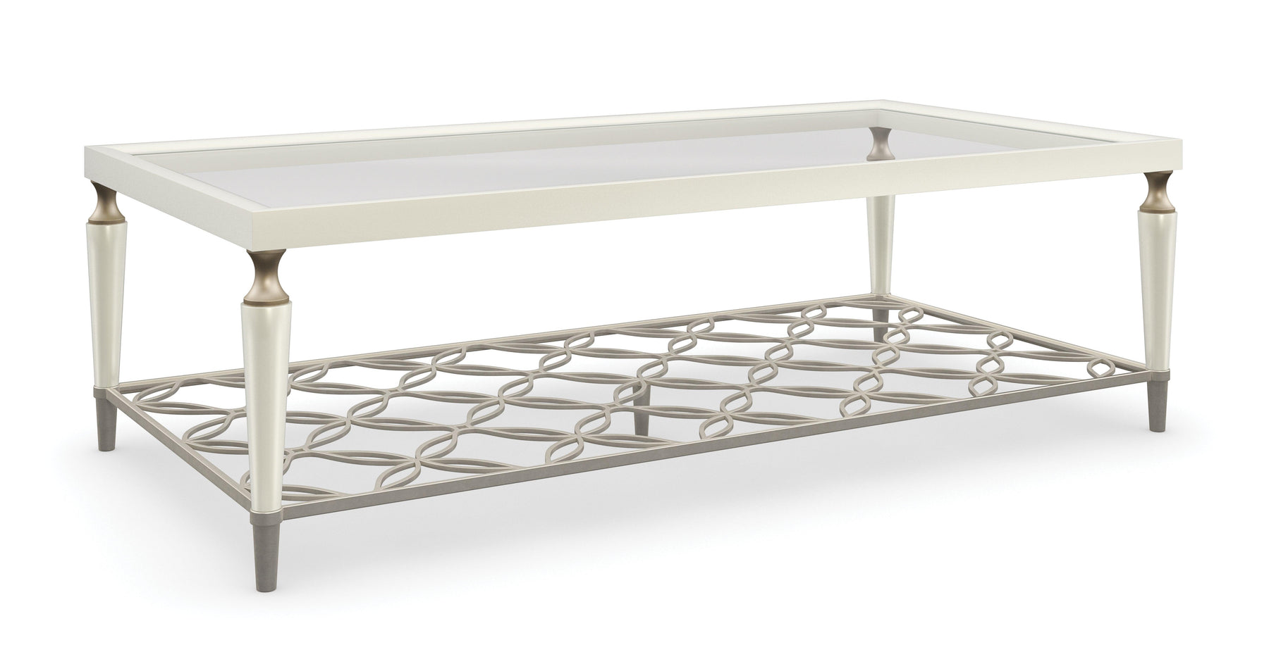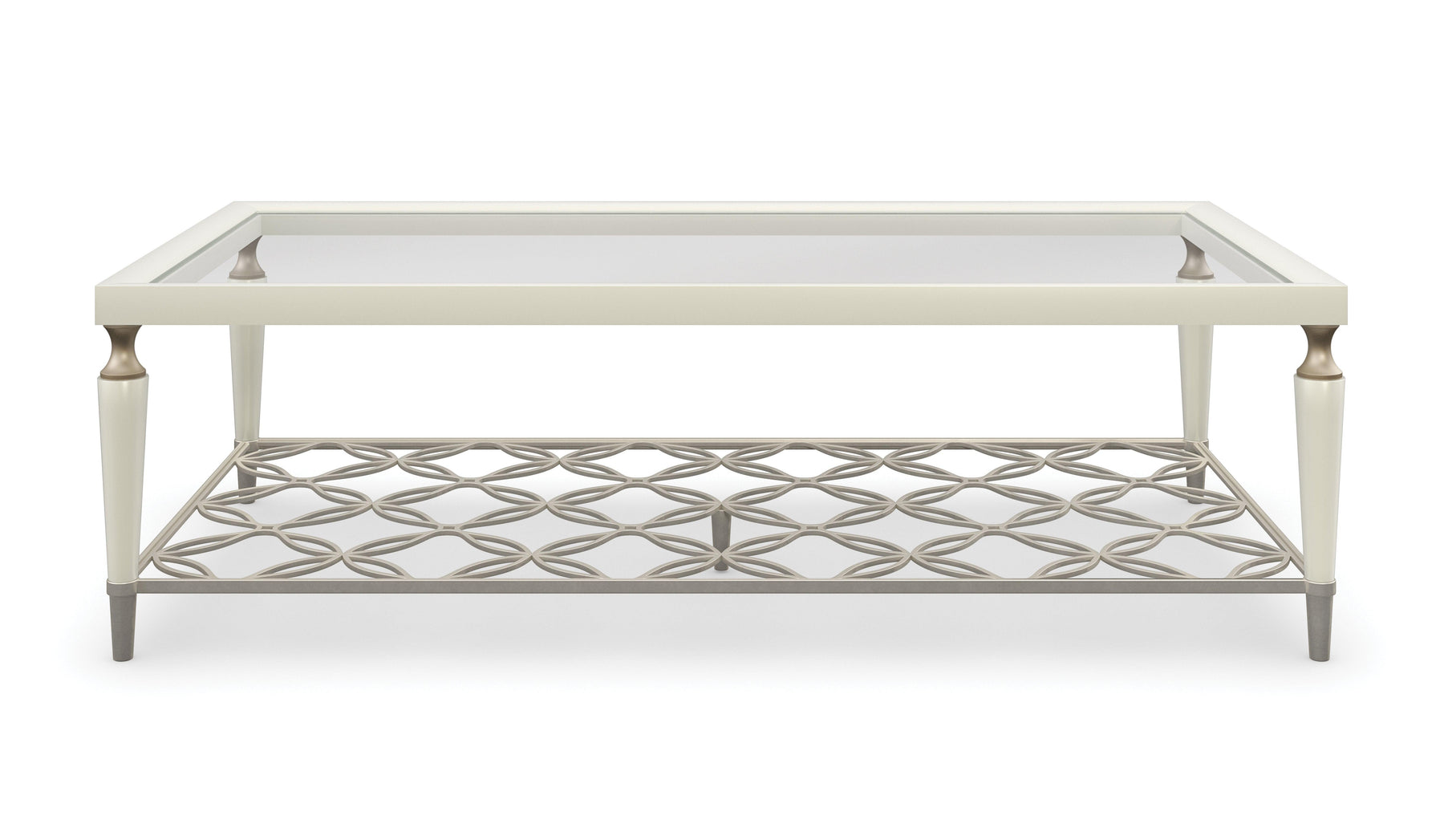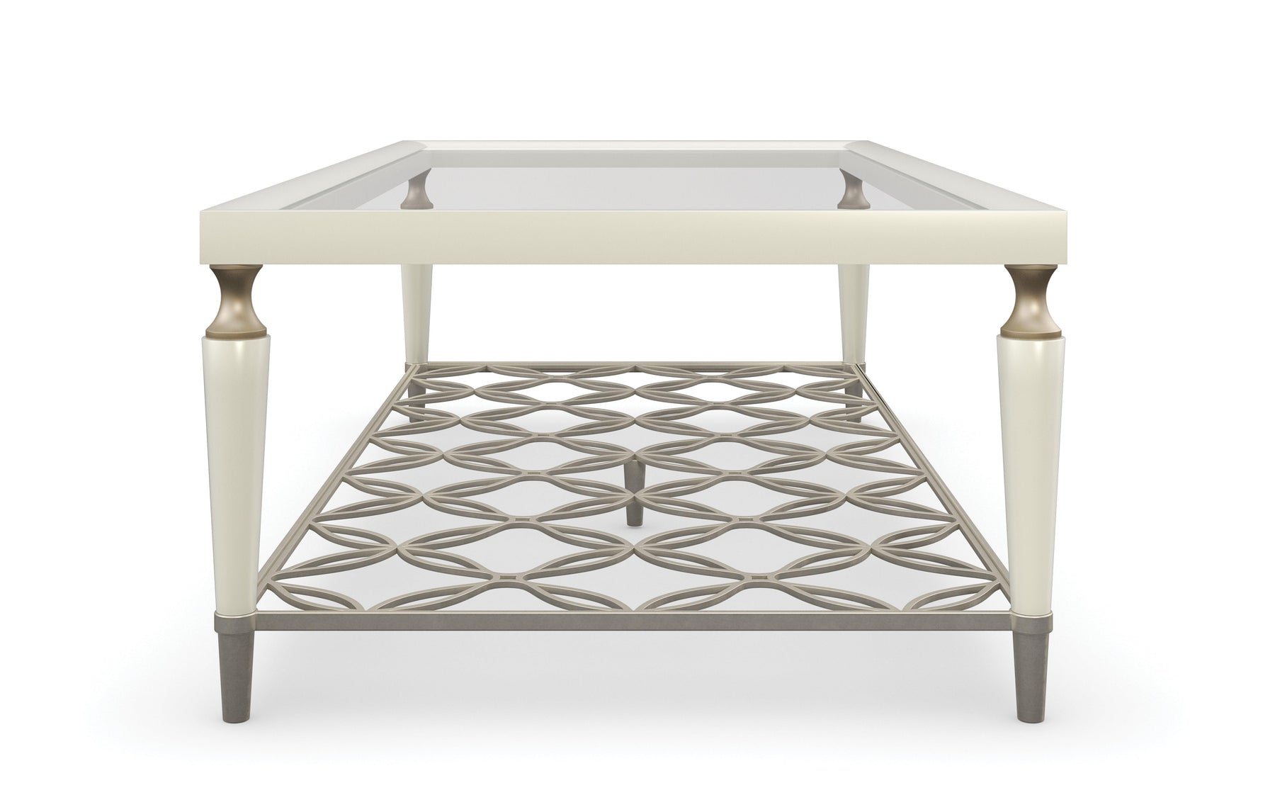 Classic and of the moment, this cocktail table effortlessly grounds the room and makes an unforgettable statement. An open fretwork metal shelf lends a striking view, glimpsed beneath its clear glass top, set within a Crème de la Crème painted wood frame. Turned legs add an elegant detail, defined by metal ferrules and a Gold Bullion Leaf decorative collar. Part of a five-piece offering in occasional tables