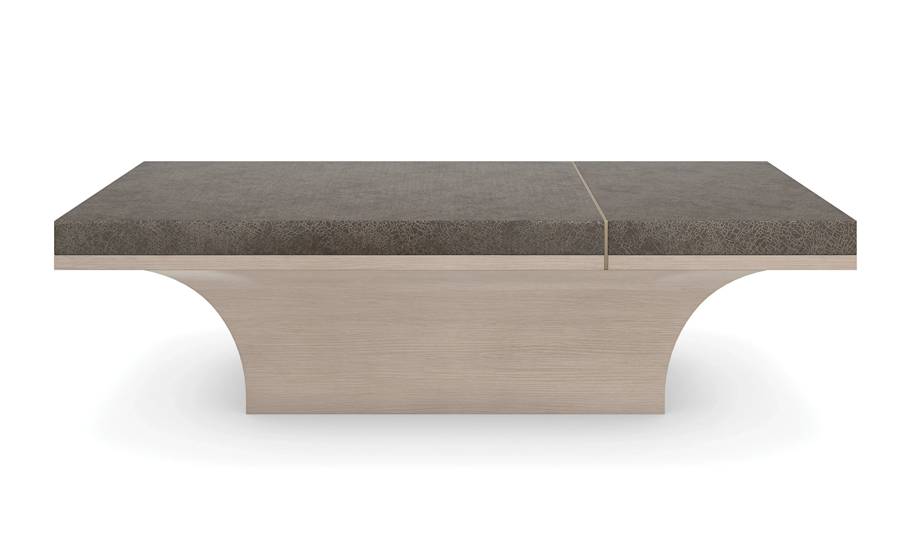 Like a pair of pants precisely tailored to fall just above the shoe, this cocktail table speaks to the delicate tension between texture and material. Features an ample top in a darkly contrasting Forest Craze finish, balanced on a swooping Koto wood base that appears to defy gravity. An asymmetrical beaded spline in Brush Gold lends separation and a luxe finishing touch. Each element of the Full Break is engineered to the same exacting standard Caracole applies across its entire collection — from the precisely applied surface treatment to the robust case construction underneath.