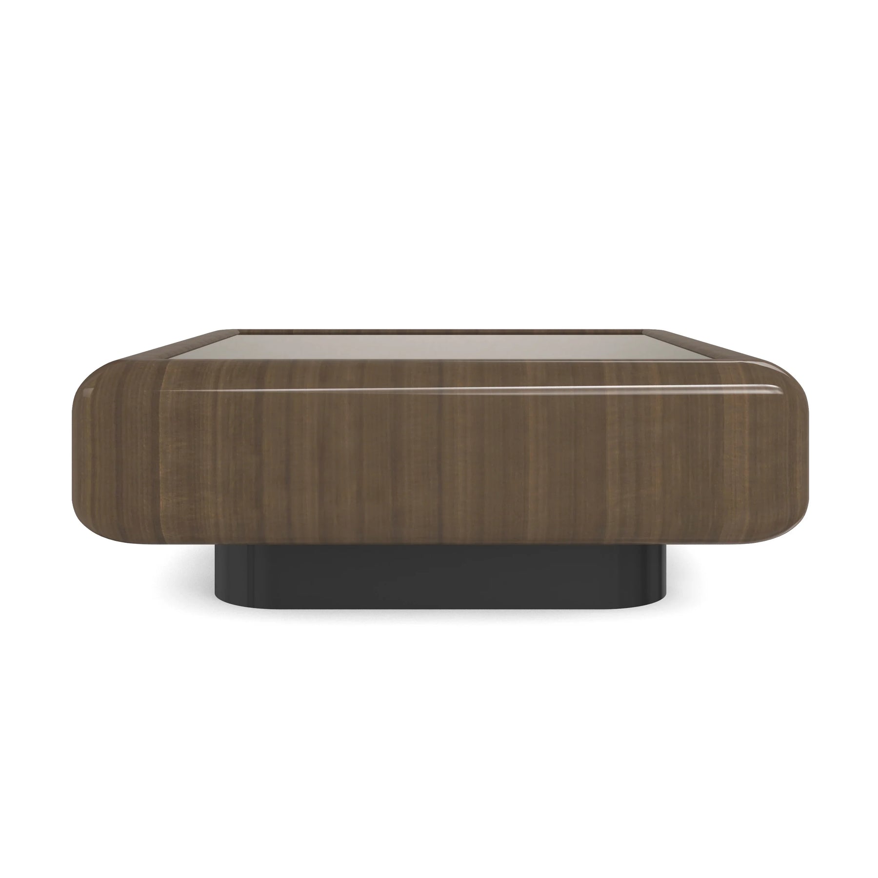 A celebration of high-gloss color, the square Gelée Cocktail Table in Apatite Gloss is defined by its generously rounded edges and compound curves that have been created by to create a dramatic waterfall effect. The top features an inset Crystal Grey mirror. This substantial piece rests on a base with fully-rounded corners finished in Oracle leaf. Each element of the Gelee Cocktail Table is engineered to the same exacting standard Caracole applies across its entire collection — from the precisely applied surface treatment to the robust case construction underneath.