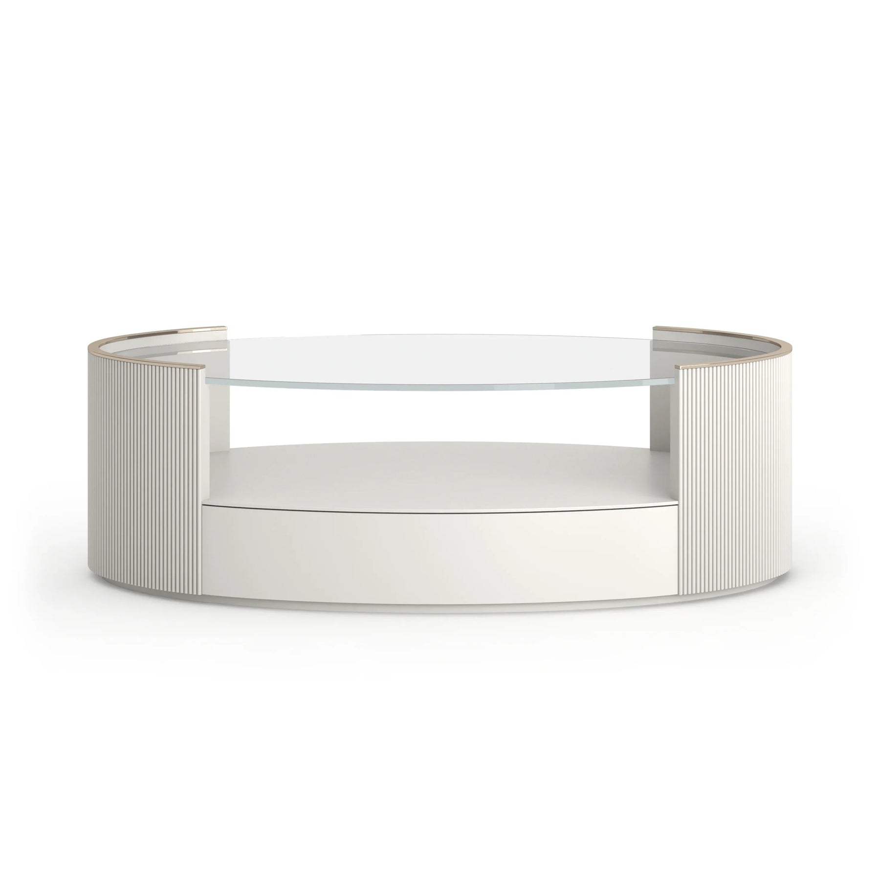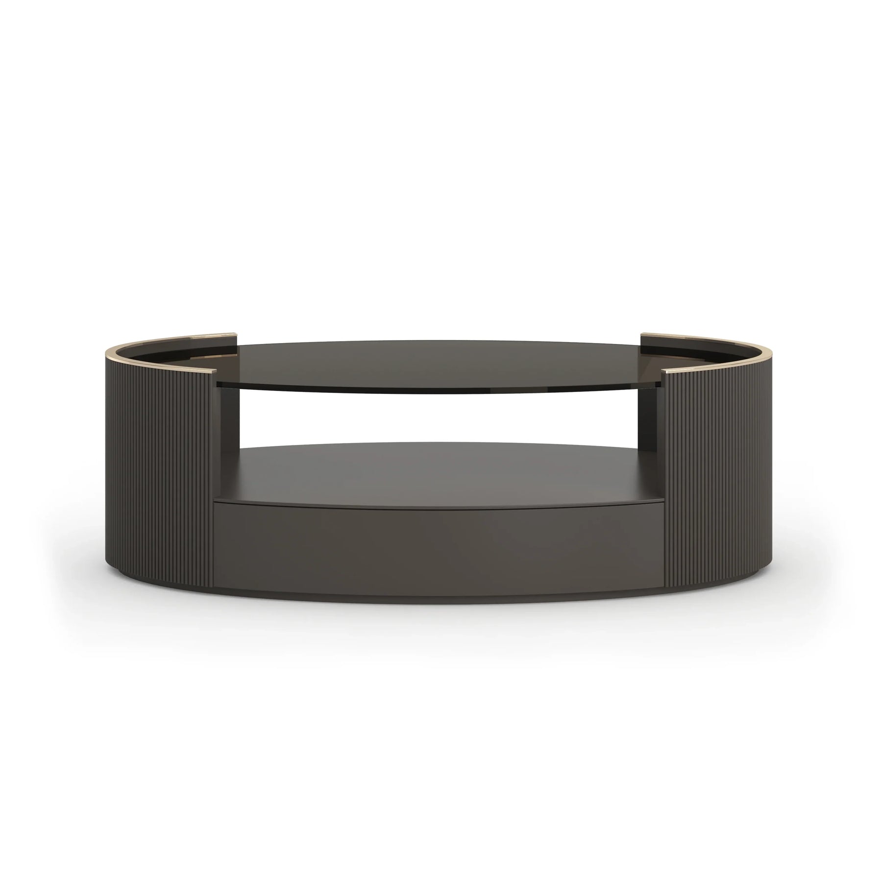 Gather around this oval cocktail table. This piece has a smoked bronze glass top and half-moon casework at the end of each oval that displays fluted detailing in Dark Chocolate. There is an open storage area and one drawer at the bottom with a fluted front, a bottom finger pull opener and soft-close hardware with an interior finished to match. Available in Matte Pearl, Whisper of Gold and Dark Chocolate; Whisper of Gold, accented with gold hardware details.