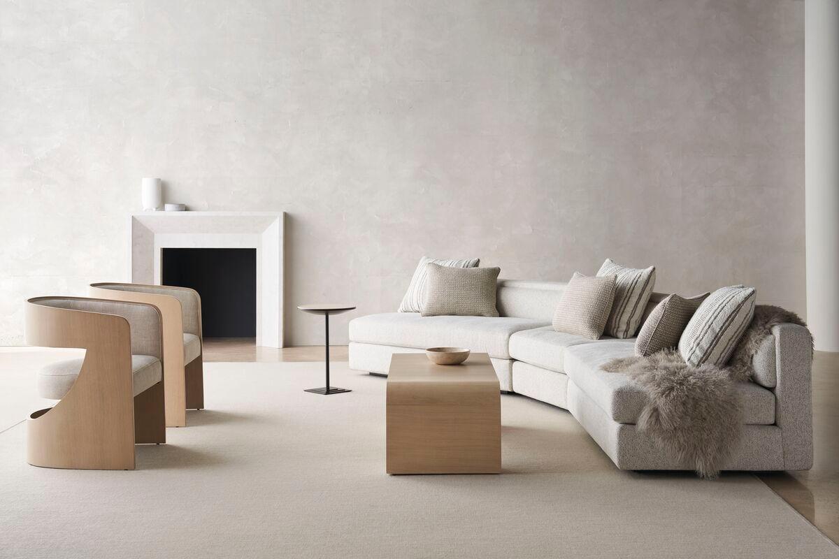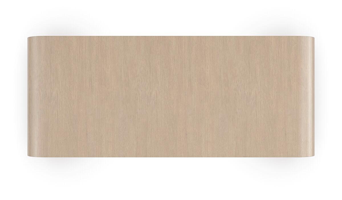 A calming rendition of organic fluidity, this cocktail table is defined by the beauty of Sun Drenched Oak and an ample top surface that gracefully waterfalls over either side. Its curved base adds movement and a tactile element in an innovative Textured Adobe finish. Pair with our Movement end table to make a fresh statement and soften clean modern lines. Available in 54W x 22D x 17H.