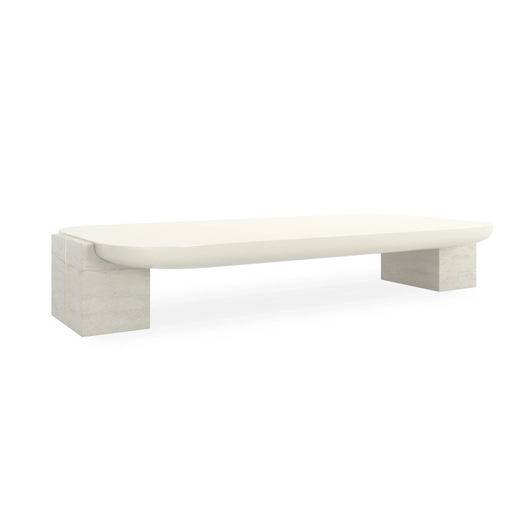 "Combining luxurious Almond Milk with unfilled travertine stone side panels and elegant Whisper of Gold metal accents, this cocktail table provides an exceptional blend of modern luxury and sophisticated detailing.". Available in Piano Black, Whisper of Gold and Almond Milk, Whisper of Gold.