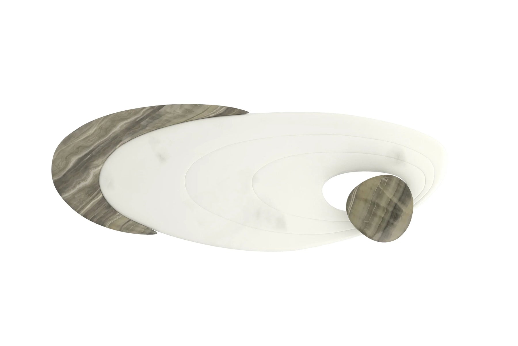 contemporary statement piece features a White marble top, with accent swirls that ripple out from a smaller, offset, elevated Grey Onyx oval marble top to a raised half-moon-shaped Grey Onyx section. Each piece is supported by a metal frame and tapered legs in shimmering Champagne Gold. For the modern collector, this piece is out of this world.