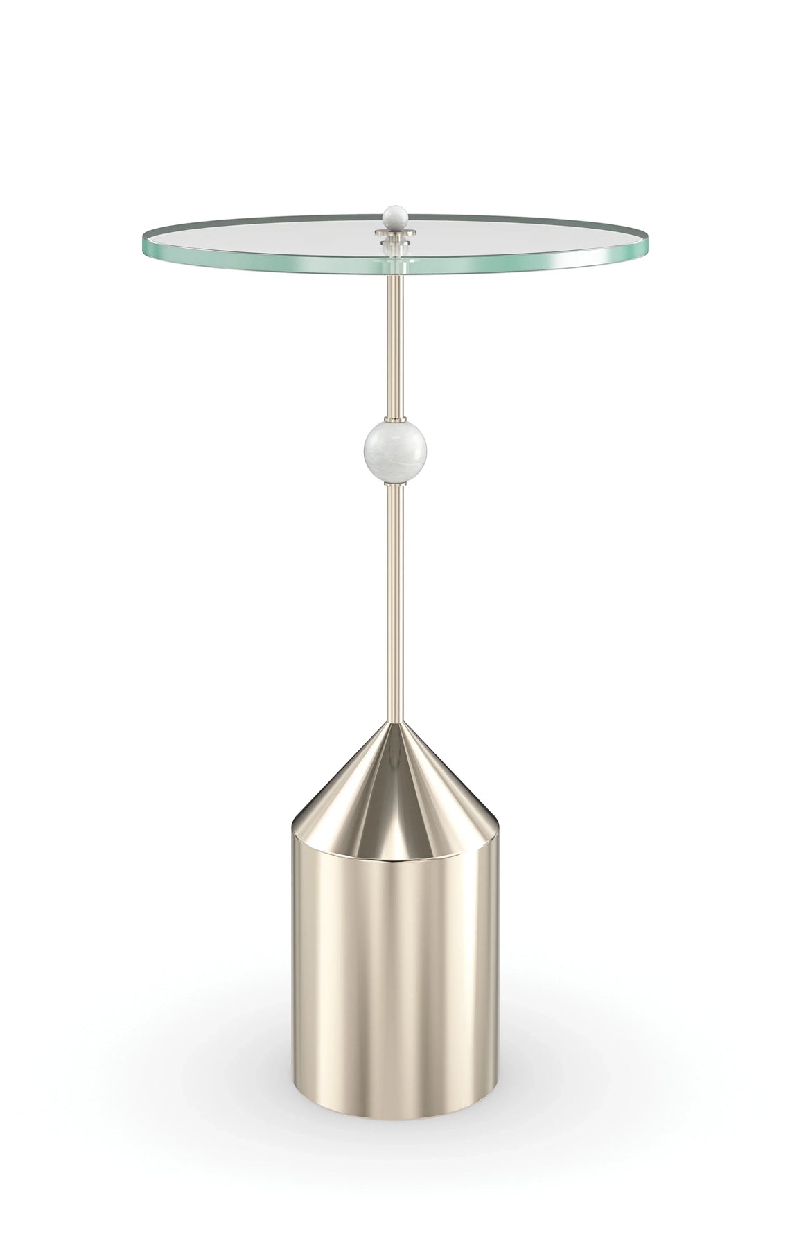 A nod to the streamlined style of a mid century candlestick, this spot table is well-scaled for conversation nooks or larger spaces designed for entertaining. A clear glass top adds to its light and reflective aesthetic, contrasted by a sculptural metal frame with a decorative stone bead and sturdy base in a Whisper of Gold. Pair with our Beta and Gamma accent tables to create composition, or style solo for ease of use and convenience