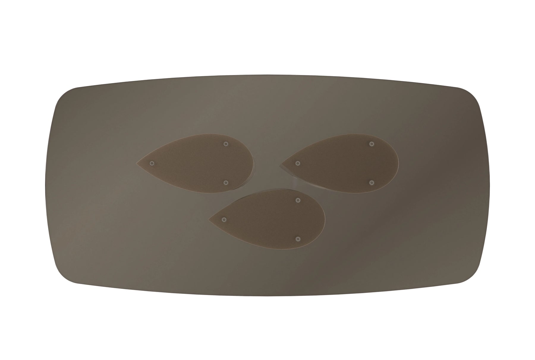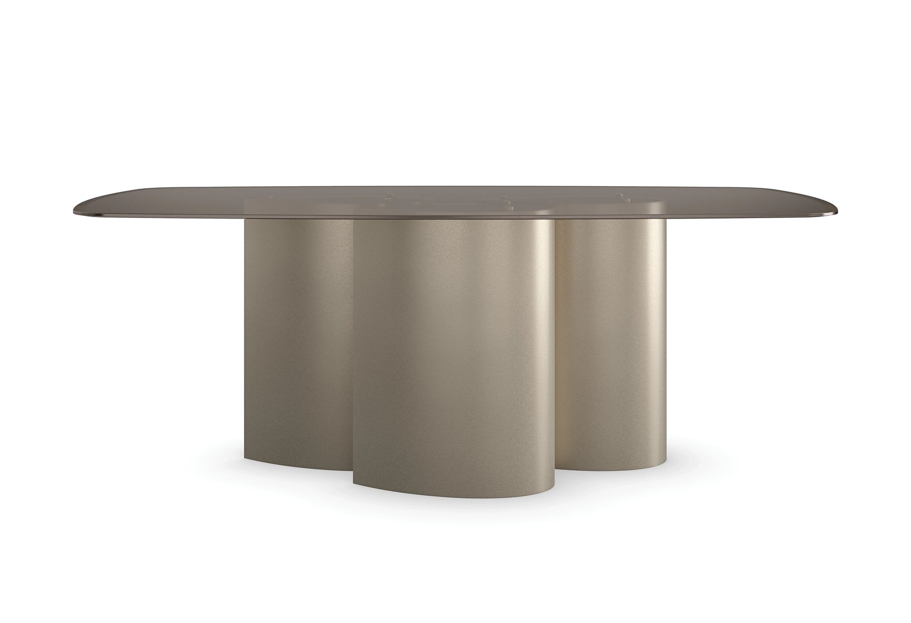 Gathered columns with a sharply angled, teardrop shape lend a sculptural element and sense of movement to this glass top dining table. When viewed from above, its uniquely designed base appears to emulate a school of darting fish, and from the side, it quickly guides the eye, for a look that shimmers and is visually light. For larger gatherings, a four-pedestal base is also available to pair with our 110” Smoked Bronze rectangle glass top.