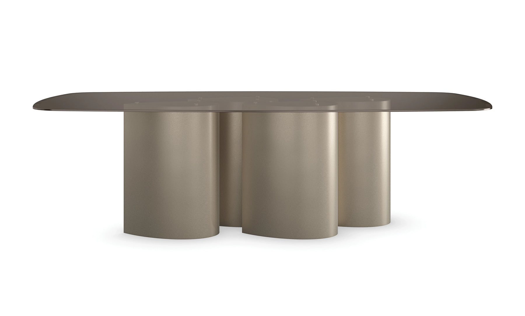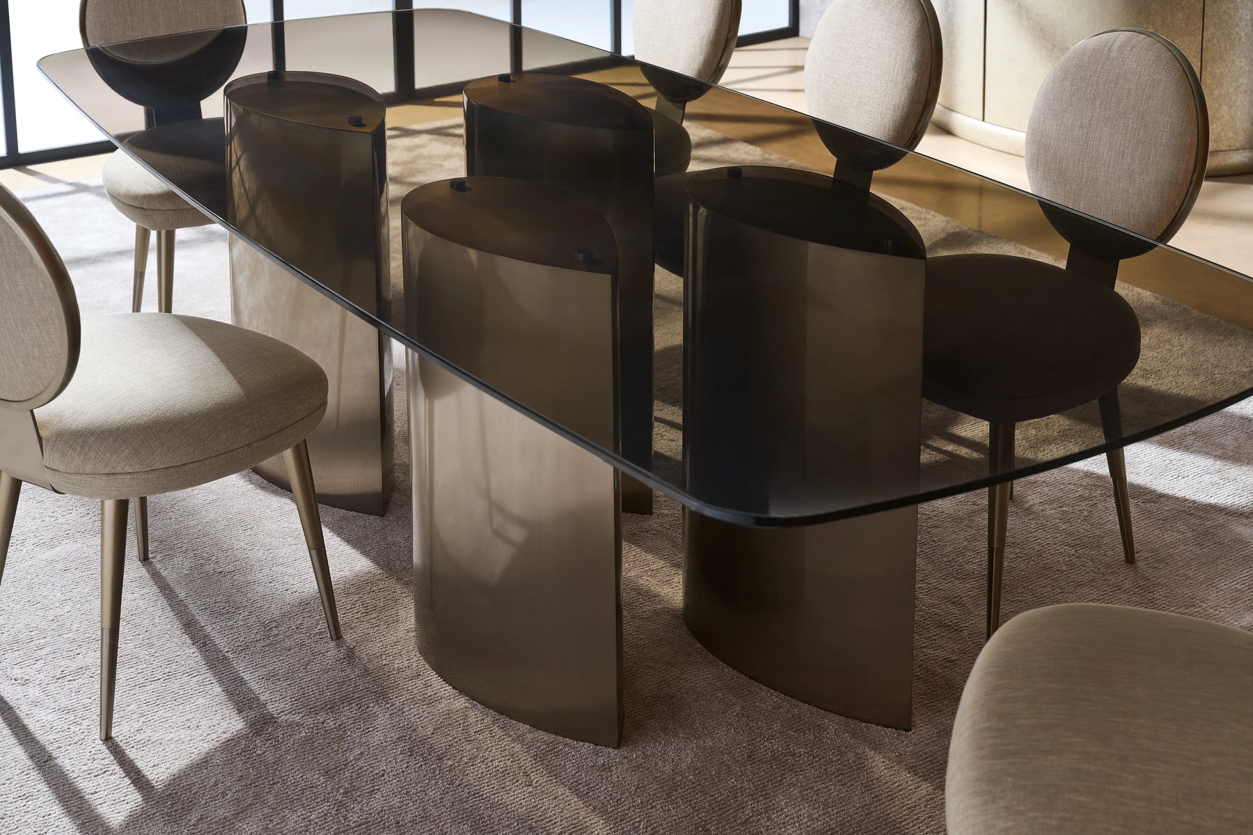 Gathered columns with a sharply angled, teardrop shape lend a sculptural element and sense of movement to this glass top dining table. When viewed from above, its uniquely designed base appears to emulate a school of darting fish, and from the side, it quickly guides the eye, for a look that shimmers and is visually light. For more intimate dining experiences, a three-pedestal base is also available to pair with our 80” Smoked Bronze rectangle glass top.
