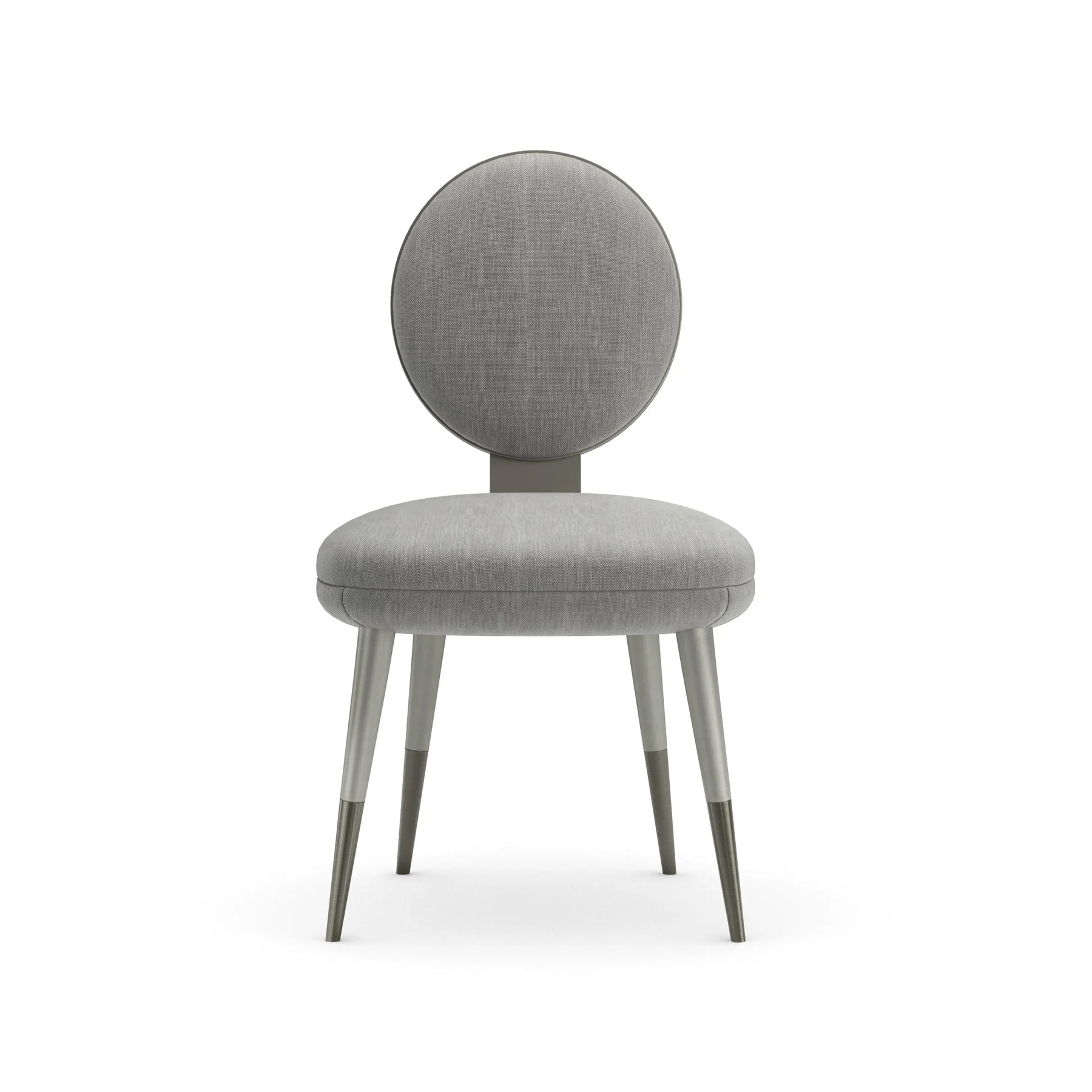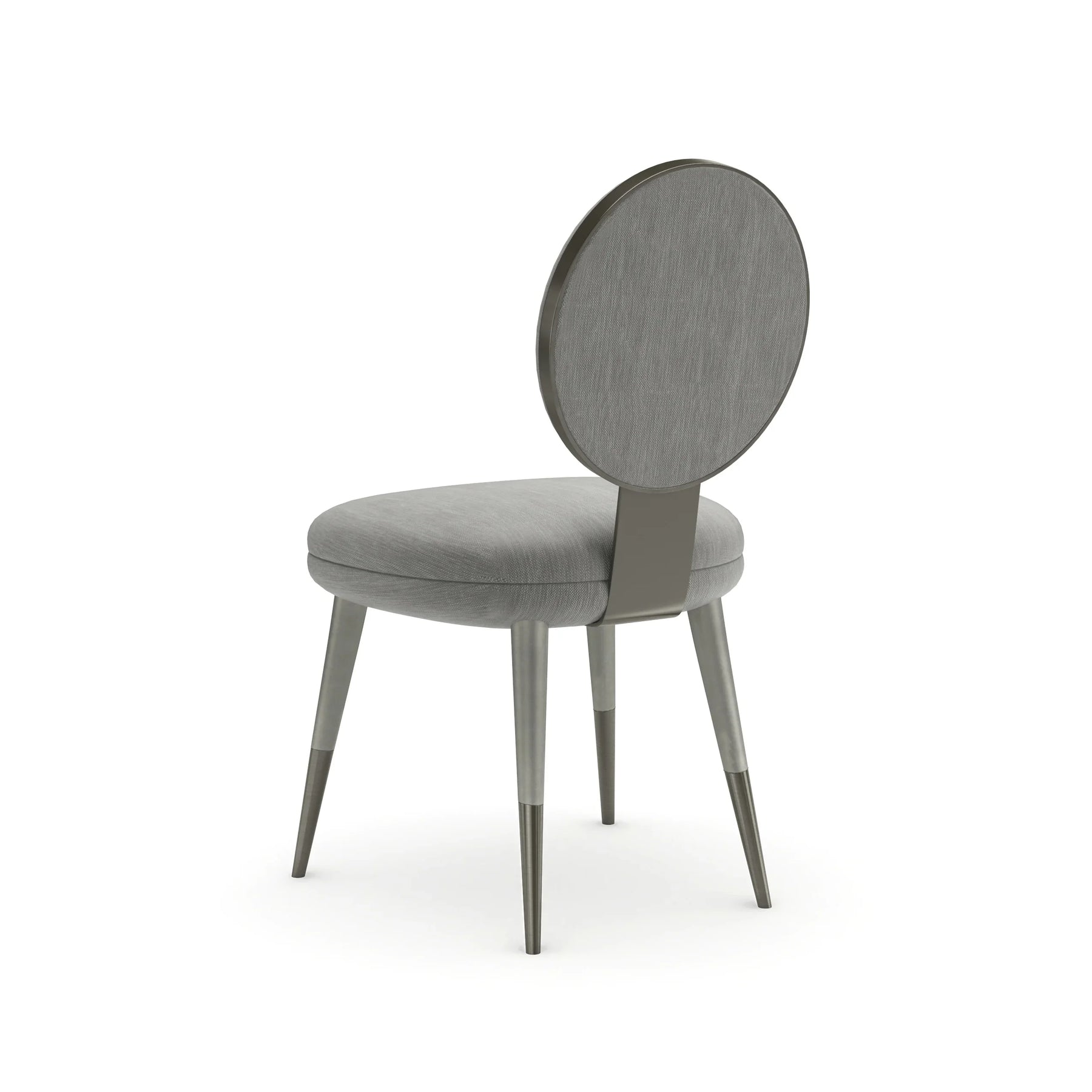 A contemporary take on neoclassical styling, this round back dining chair adds welcoming warmth and a note of tonal glamour. Meticulously tailored in a metallic dark grey woven fabric, its metallic dark grey Smoldering Paint frame gives a nod to the Atomic Age with tapered legs and iconic metal ferrules in a Deep Bronze. This chair is perfectly pitched for comfortable seating from dining table to desk or bedroom vanity.