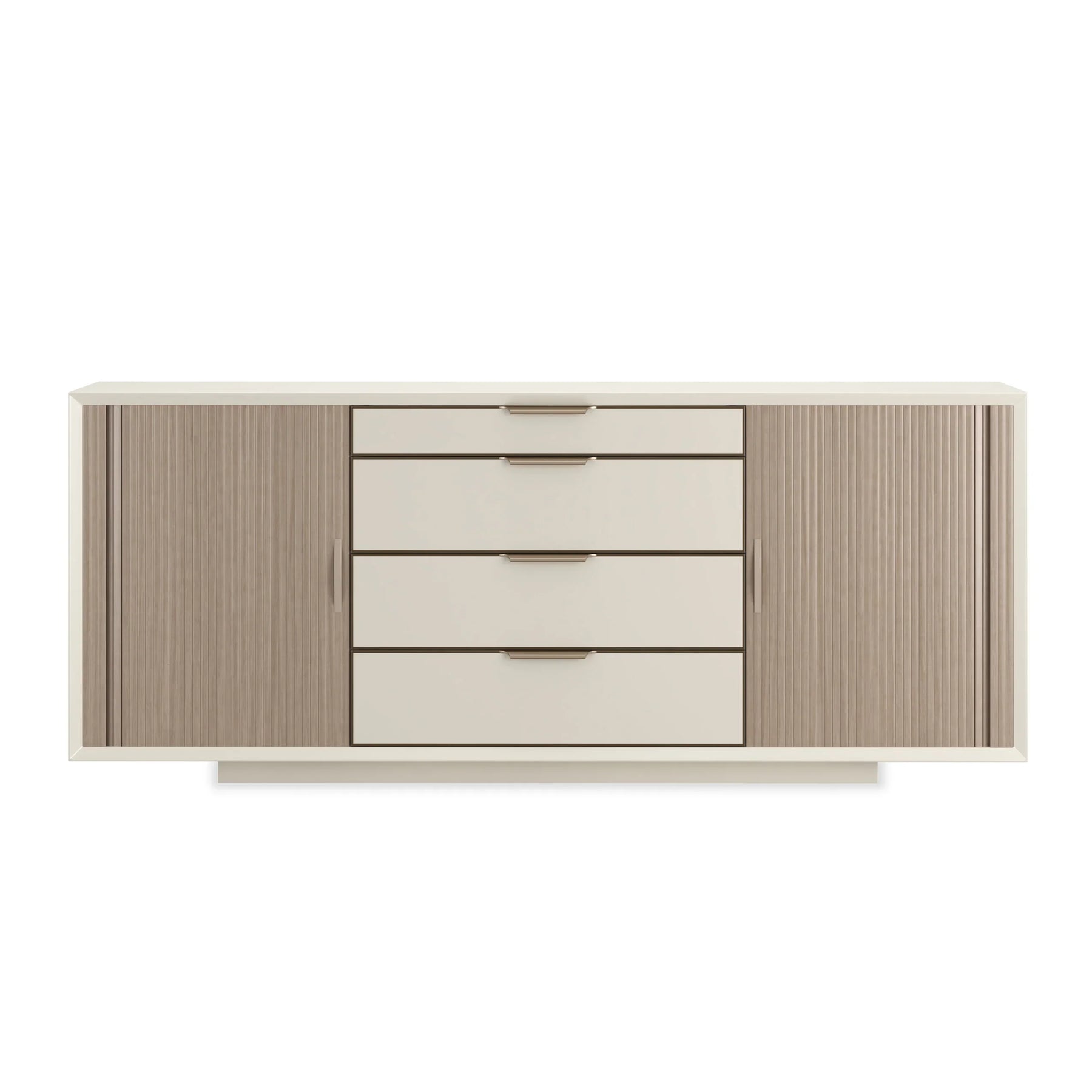 A masterful mix of form and function, this mid-century-inspired console stirs interest with its linear design and host of storage options. Sliding tambour doors in Moonstone add texture and contrast to an Almond Milk finish. Framed in Almond Milk, four center drawers feature vinyl fronts, embossed with a pattern reminiscent of rain trickling down a windowpane. Expansive storage offers two fixed shelves on the left, offset by five soft close drawers on the right. Modern and ultifunctional, its clean-lined design is well-suited for living, dining, and bedroom interiors.
