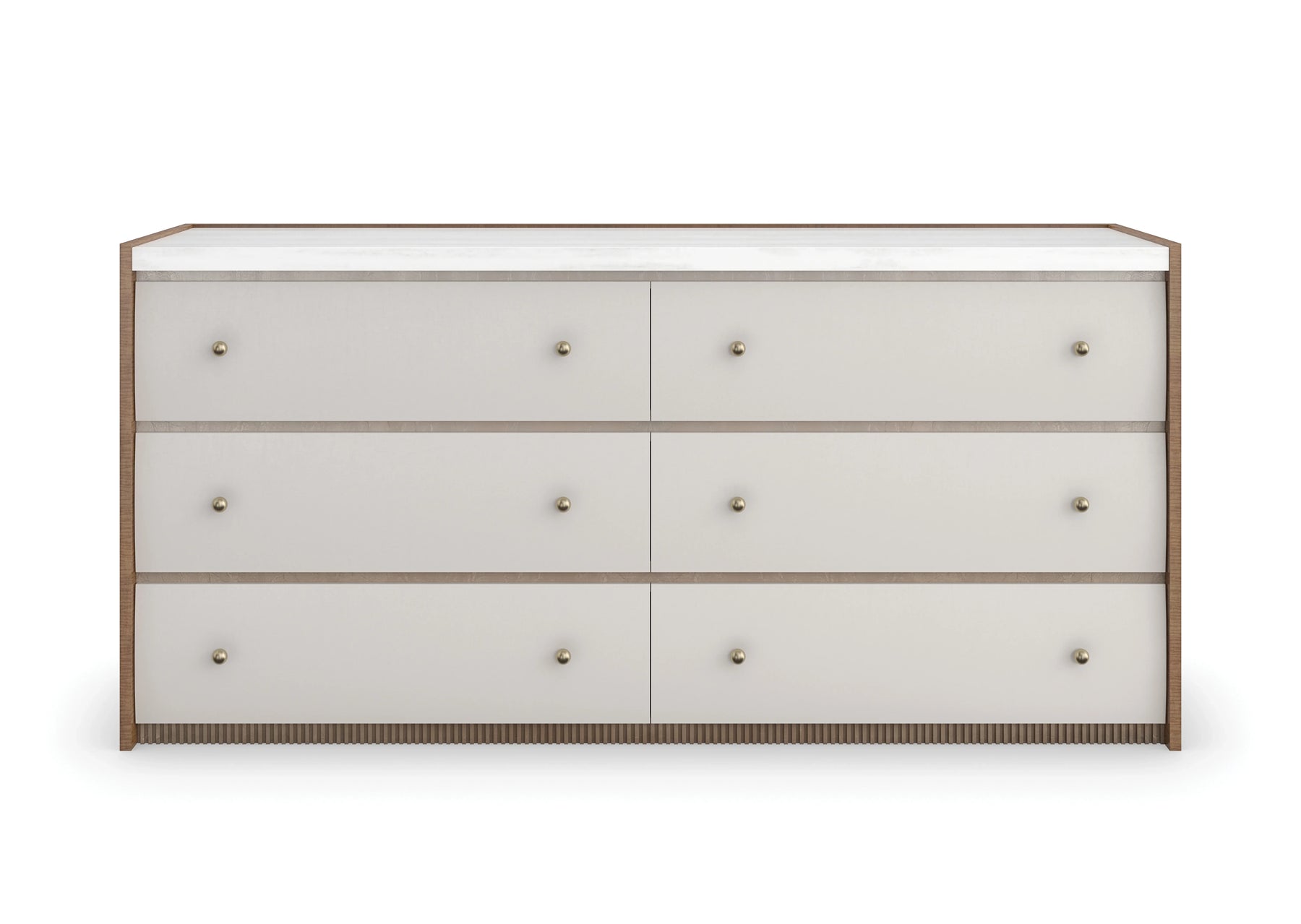 With a rustic elegance reminiscent of rural France, this dresser features tactile drawer fronts in a Rockport Burnished Adobe finish. Drawing the eye to its architectural design: a striated white onyx marble top, warmly contrasted by end panels in Toasted Sycamore and an Antique Bronze Leaf dentil molding detail along the base. Features six spacious drawers with painted interiors and ball hardware in Brushed Gold for an accentuating element that ties it to our Provence bed.