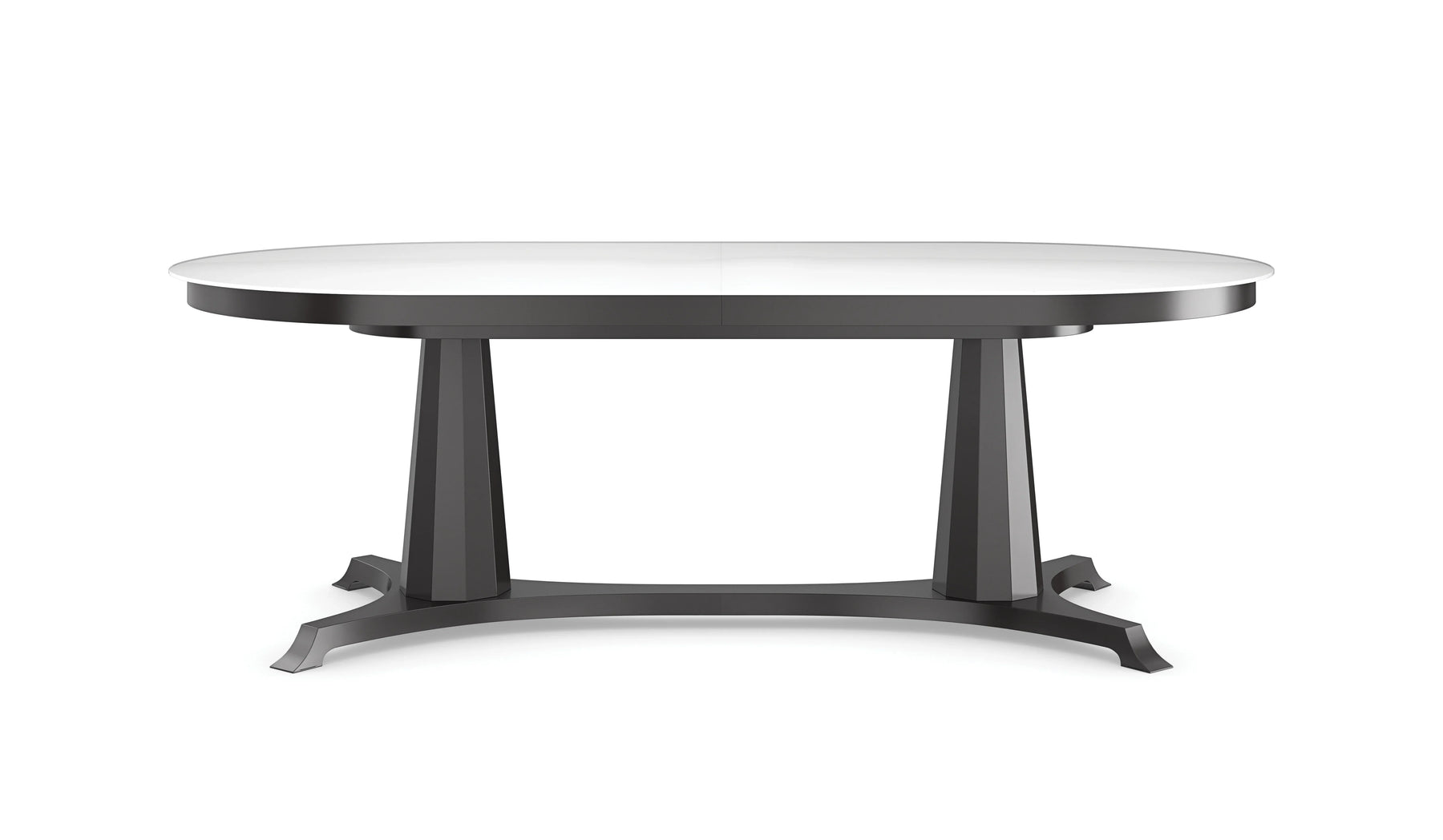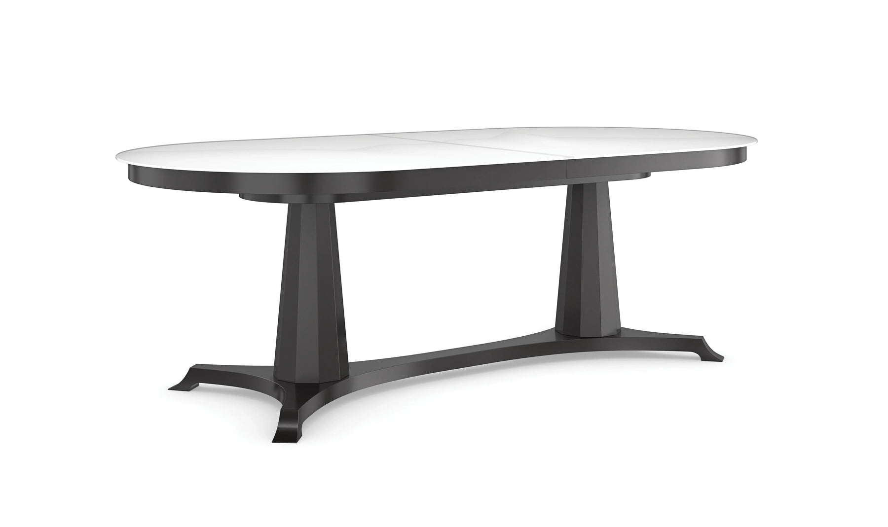 Simply elegant with a restrained use of embellishment, this oval-shaped dining table makes a surprisingly striking statement. With an opaque effect reminiscent of milk glass, its polished, tempered glass top is contrasted by an Almost Black double pedestal base with faceted columns for a hint of traditionalism. Perfect for entertaining and celebrating special occasions, it comfortably seats 12 when fully extended.