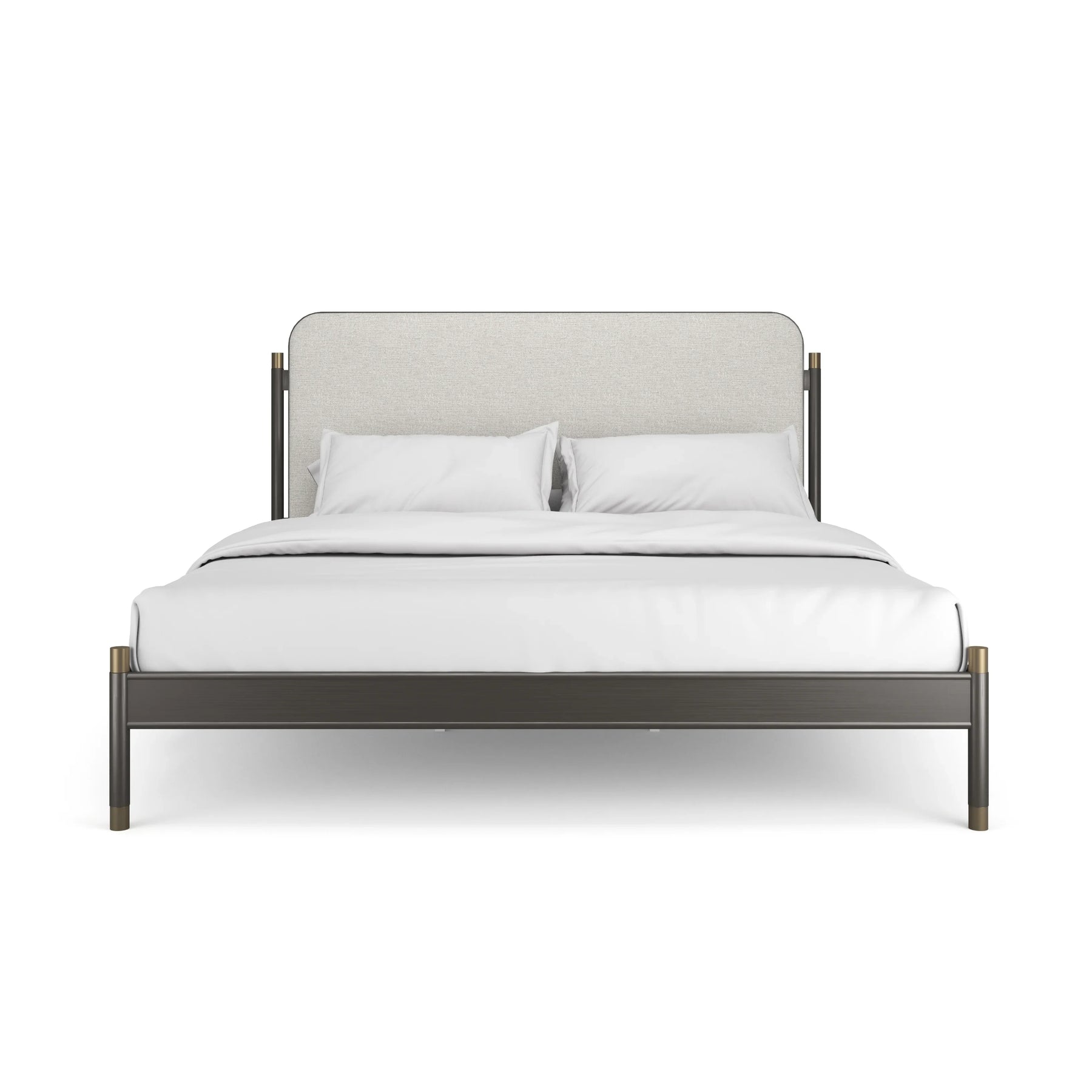 Metal campaign beds of the past get a new spin with this attractive mix of metal and upholstery in contrasting colors and textured finishes. Ivory linen-blend micro-ribbed fabric is applied to the headboard, footboard and side rails. Designed to be able to float in a room, the headboard is upholstered on both sides and framed in a Brushed Deep Bronze metal frame. Headboard trim and low finials glisten in Champagne Gold. This bed can be paired with our Campaign King Bed Canopy to add drama to a bedroom.
