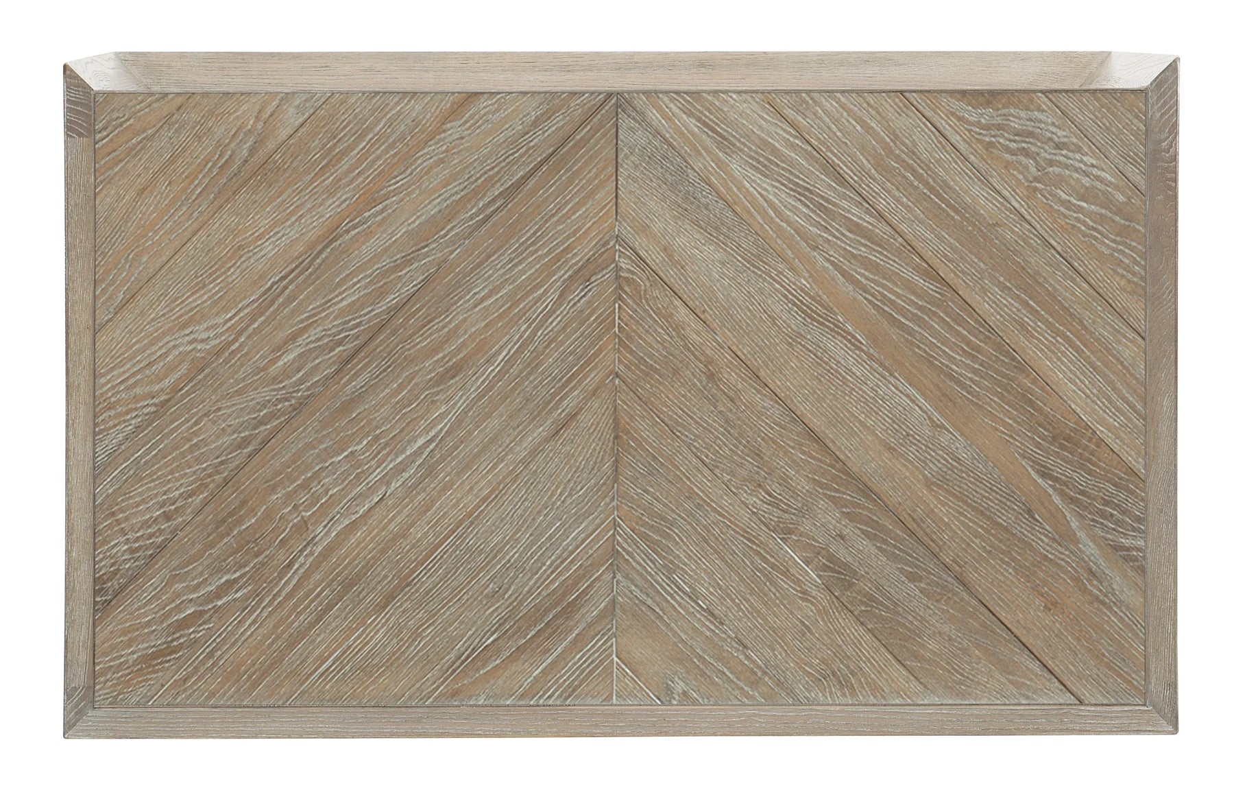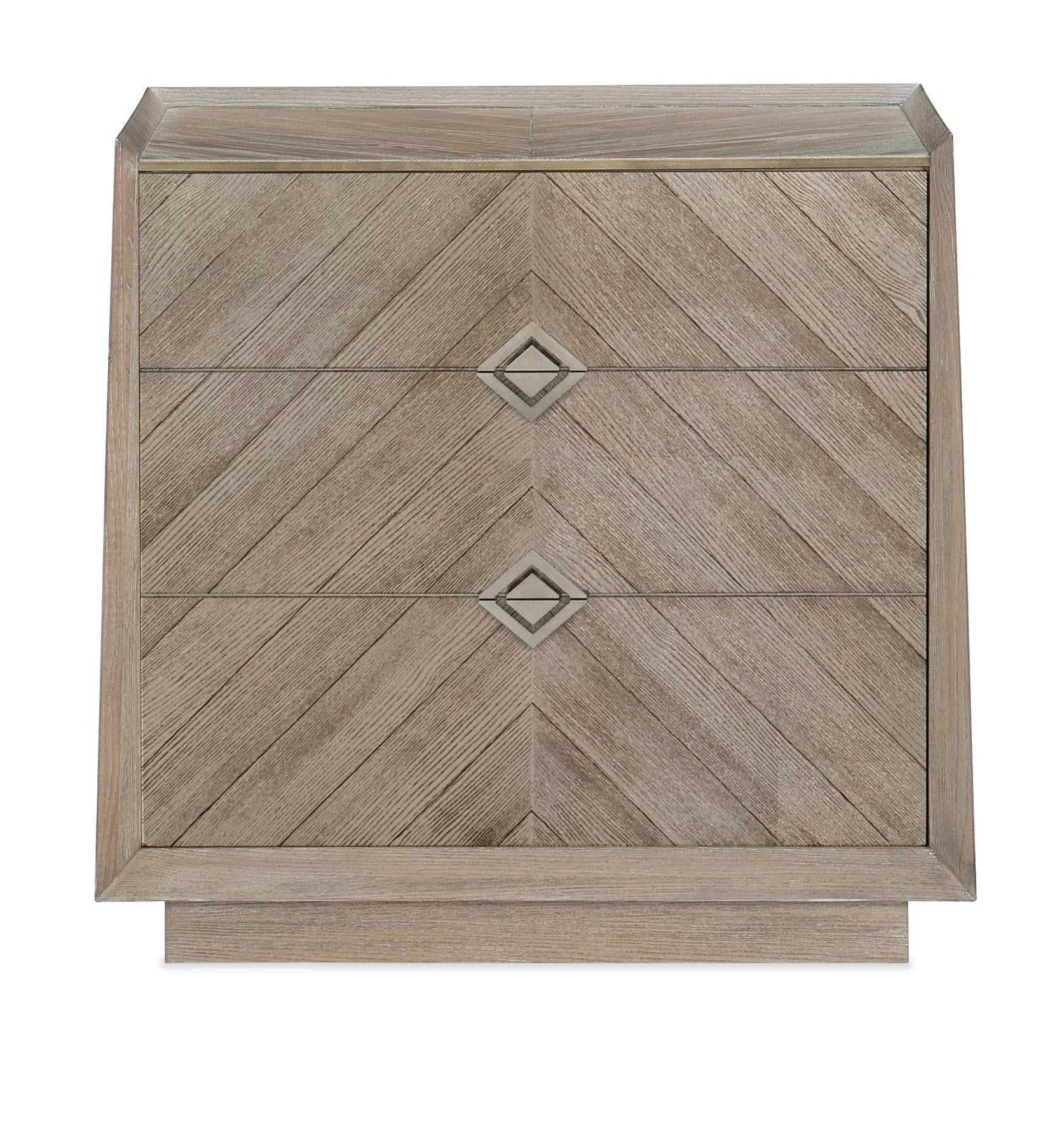 A stunning bedside companion, the Crossed Purposes nightstand clearly has the WOW factor. A simple, slightly tapered silhouette accentuates the inherent beauty of its natural materials. Perfectly matched directional woodgrain veneers create a one-of-a-kind chevron pattern that attracts the eye without competing with other pieces in the room. An easygoing Ash Driftwood finish brings out the beauty of its stunning natural lines and will complement any statement bed while a bead of Sundance Gold gives the top edge a touch of shine. Fully finished drawers wear an interior shade of Putty and are ideal for storing books, magazines and nighttime essentials.