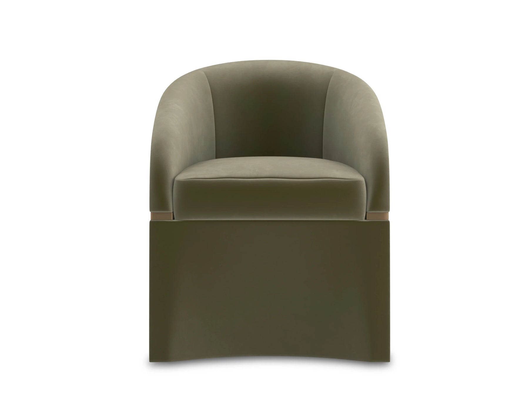 Elegantly dressed in a green velvet fabric, it’s cinched in the middle with a horizontal wood band in a Brushed Gold Paint finish. Its concave front apron detail provides a distinctive finishing touch, while hidden casters make it easy to move.