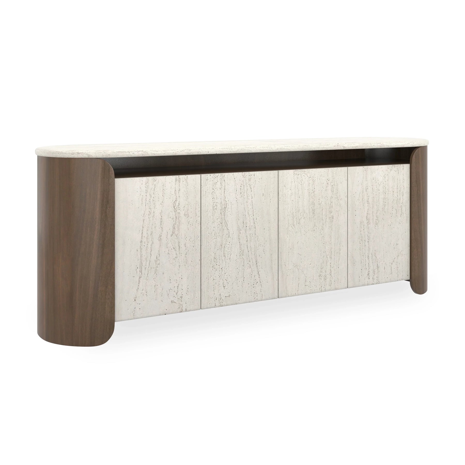 "Charm your interiors with the Fleur Open Sideboard, elegantly detailed with an unfilled Travertine top and sophisticated Porcini finish, creating an airy elegance that blends effortlessly with your dTcor."