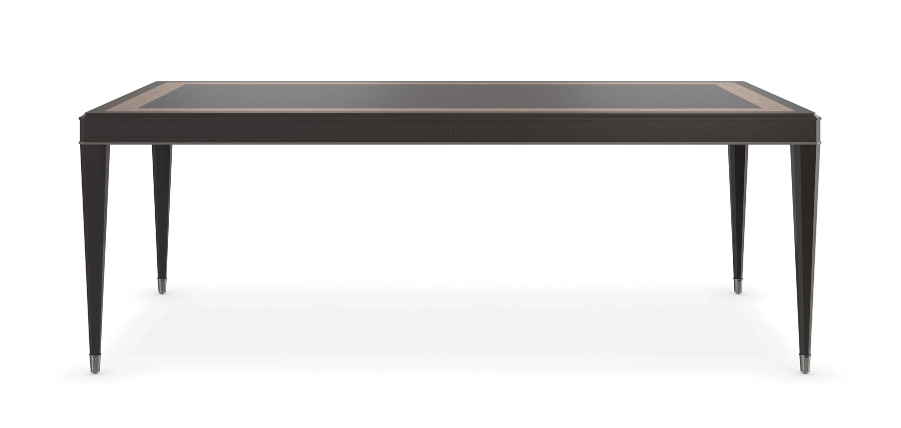 With parallel lines reminiscent of a musical staff, an inlaid border of Dark Tiger Maple dramatically frames the top of this expansive dining table. A subtle stripe of Charcoal paint accentuates a corner bevel detail, extending the length of each leg before ending with a Deep Bronze metal ferrule. Designed for grand gatherings, our Full Score dining table extends to 150” with three 22” leaves and a center support leg, comfortably accommodating up to 14 guests.