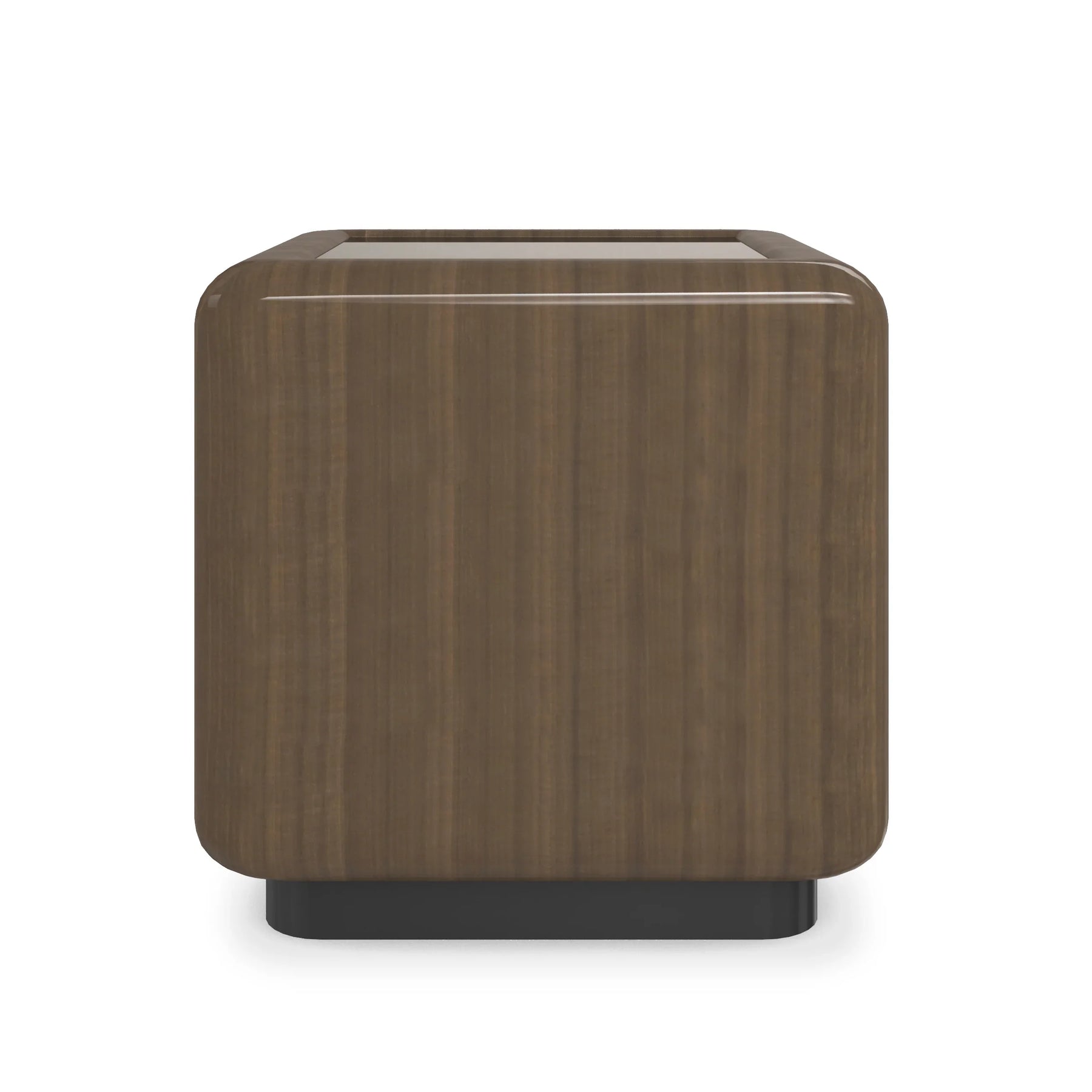 This square accent table is glossy and delicious like the perfect bonbon. Its high-sheen finish in Apatite Gloss is bold and dramatic. With generously rounded edges and compound curves, this small piece has rounded edges that create a dramatic waterfall effect. The top features an inset Crystal Grey mirror. This piece rests on a base finished in hand-applied Oracle leaf.