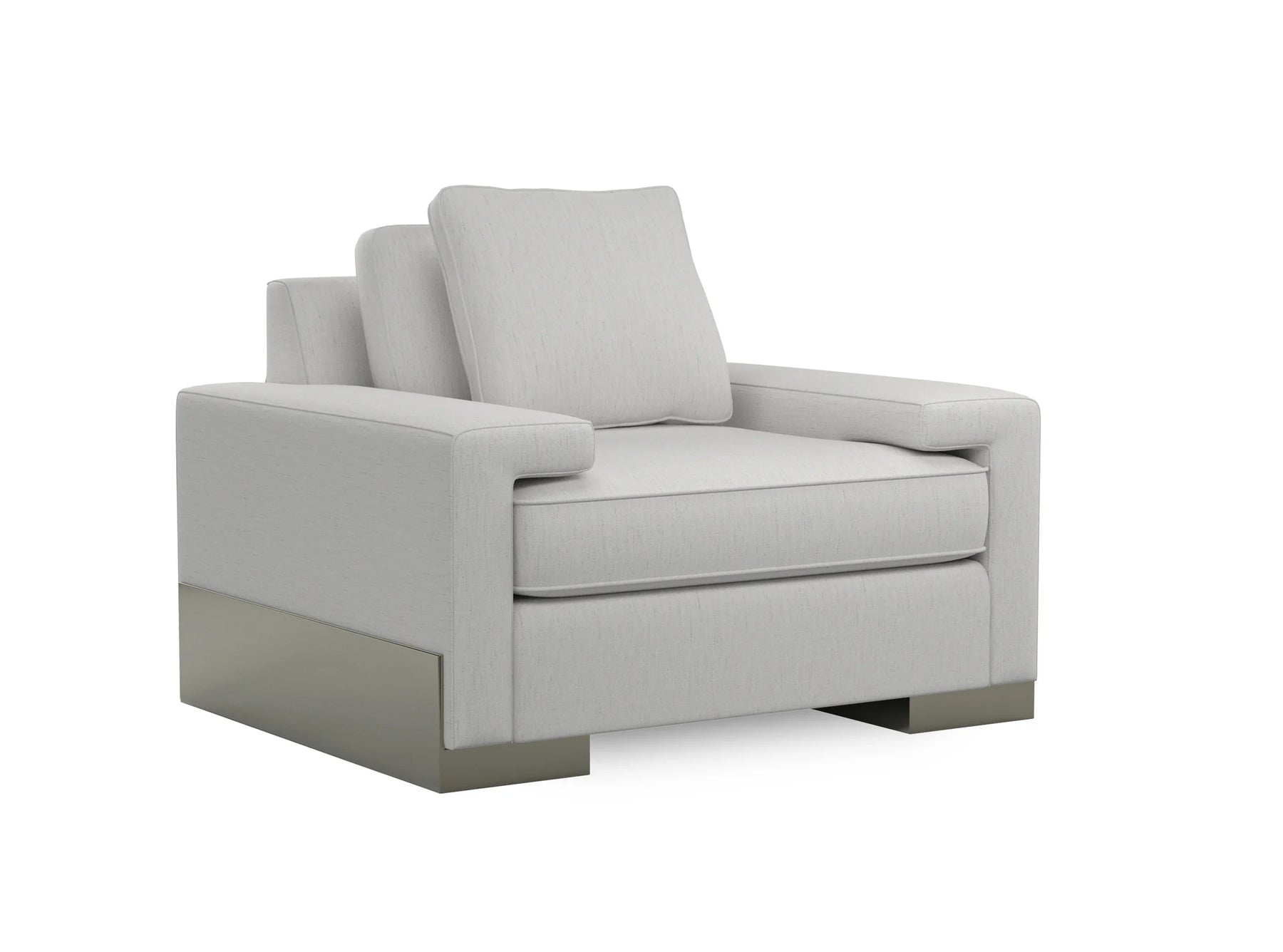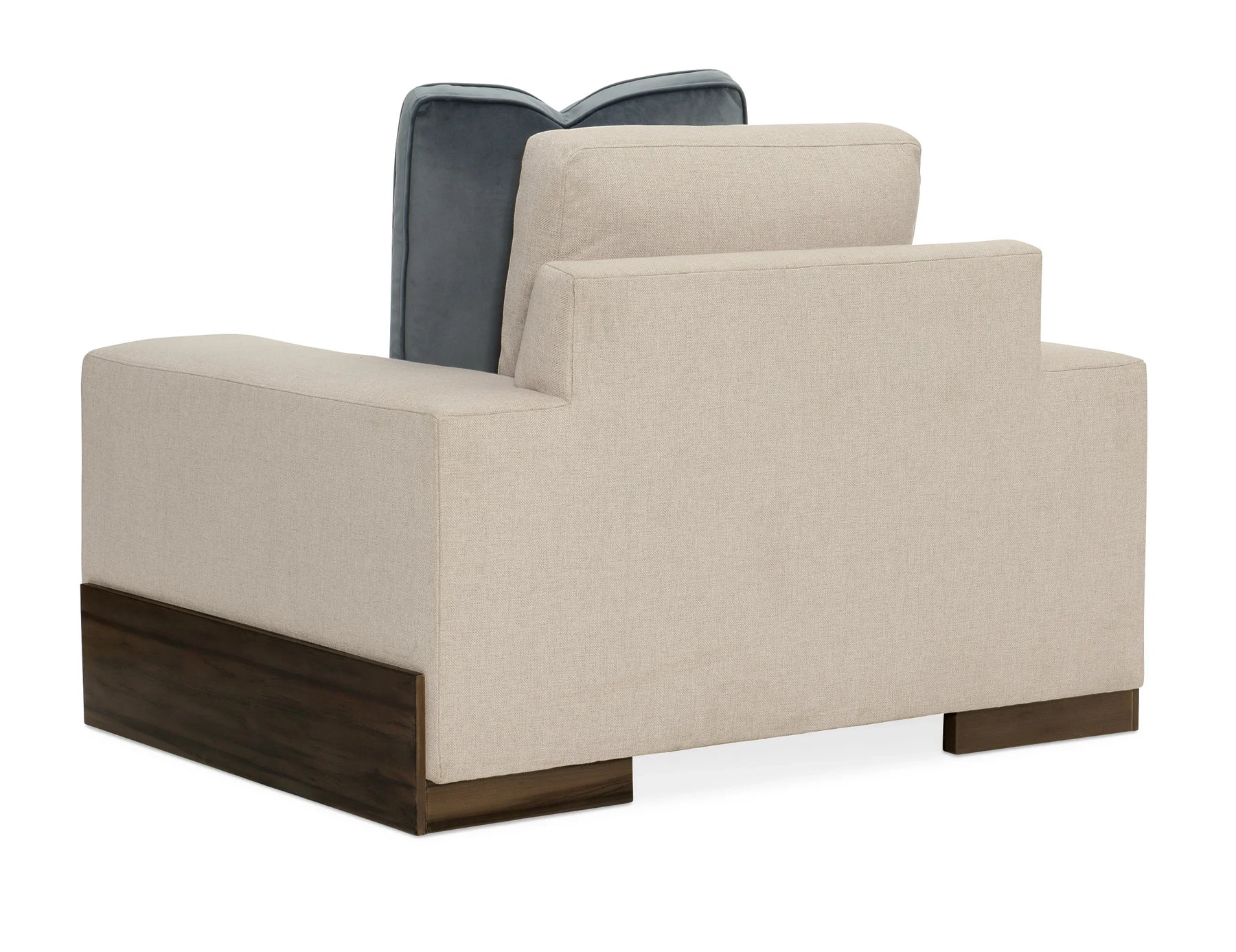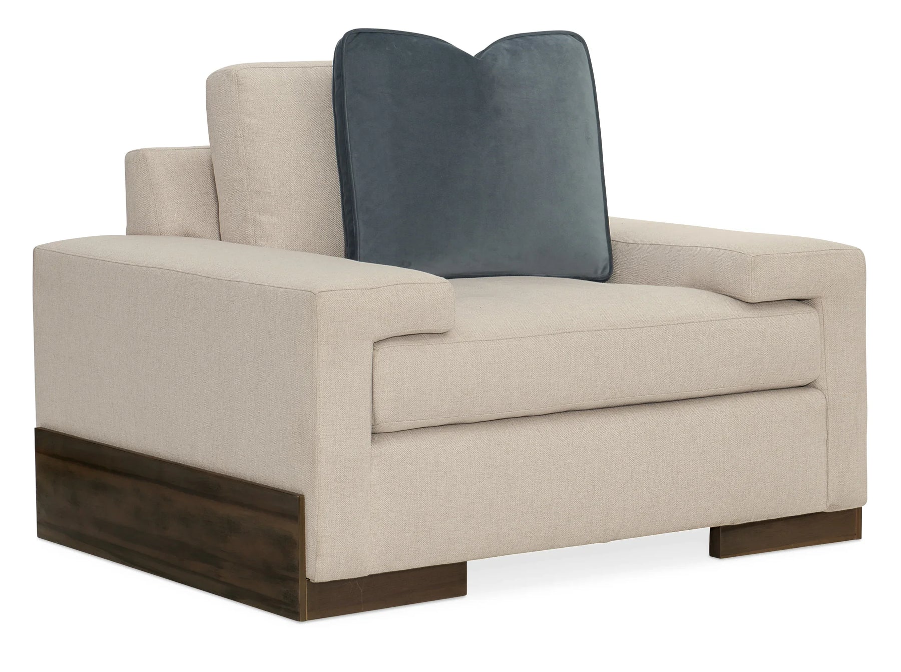 Embodying design without limits, this sublime chair adds rich character to a space. Understated charm emanates comes from its clean, linear profile where its seat cushion nests under a wide shelf-arm. Inspired by modern organic design, it features a neutral, linen-like textured fabric. An angular wood base finished in Pyrite cradles the frame and imparts a finishing touch that grounds its design presence.