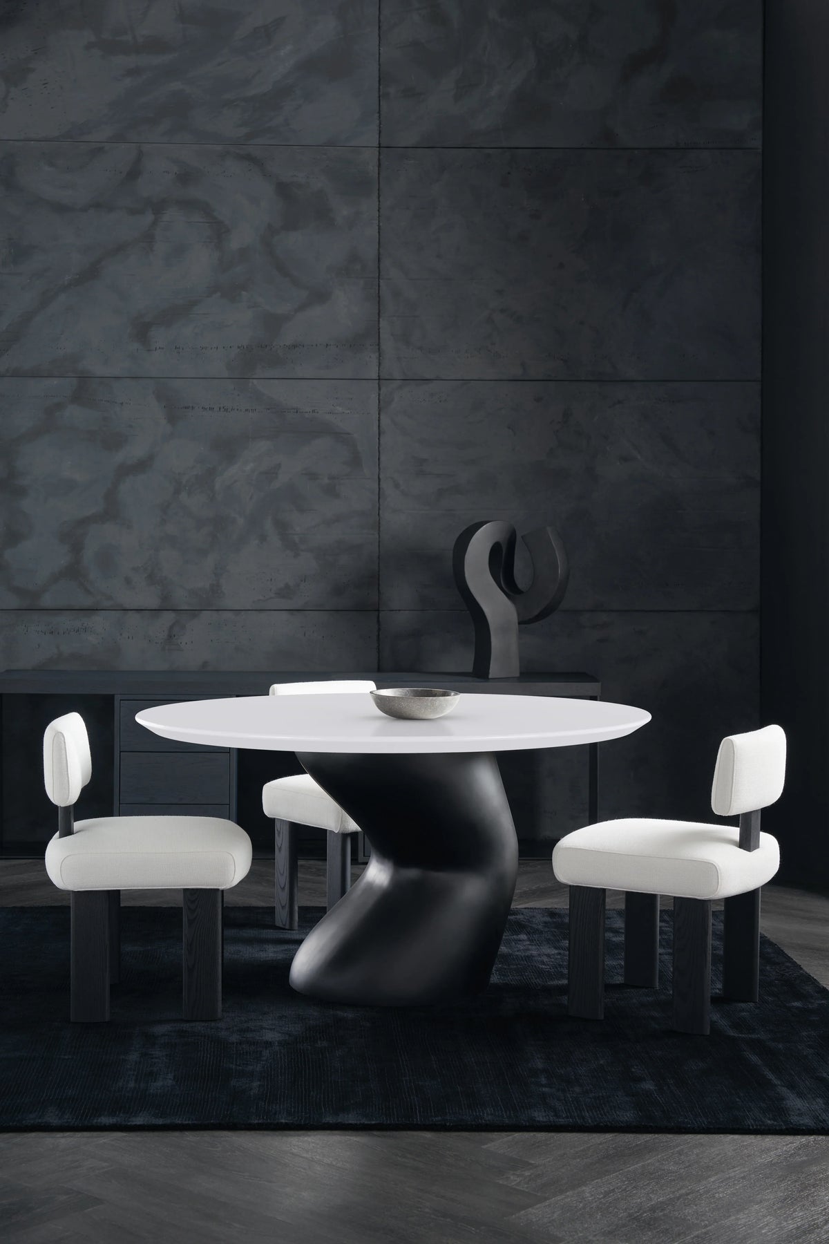 A captivating centerpiece in any interior, this dining table introduces timeless elegance with a modern aesthetic. Features a luxurious stone tabletop, beautifully balanced on a curvy, matte black base for striking contrast and visual appeal. Perfectly scaled for urban spaces and more intimate dining experiences.