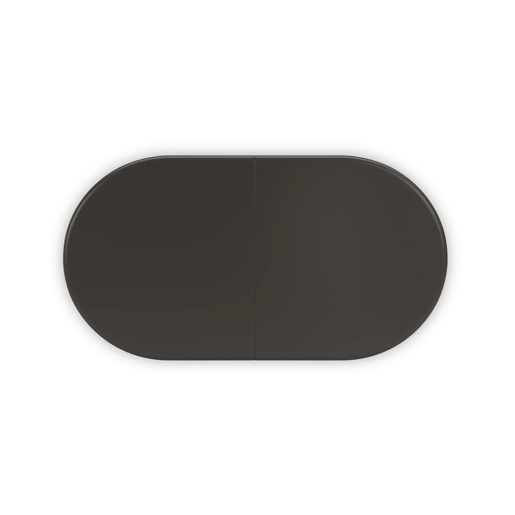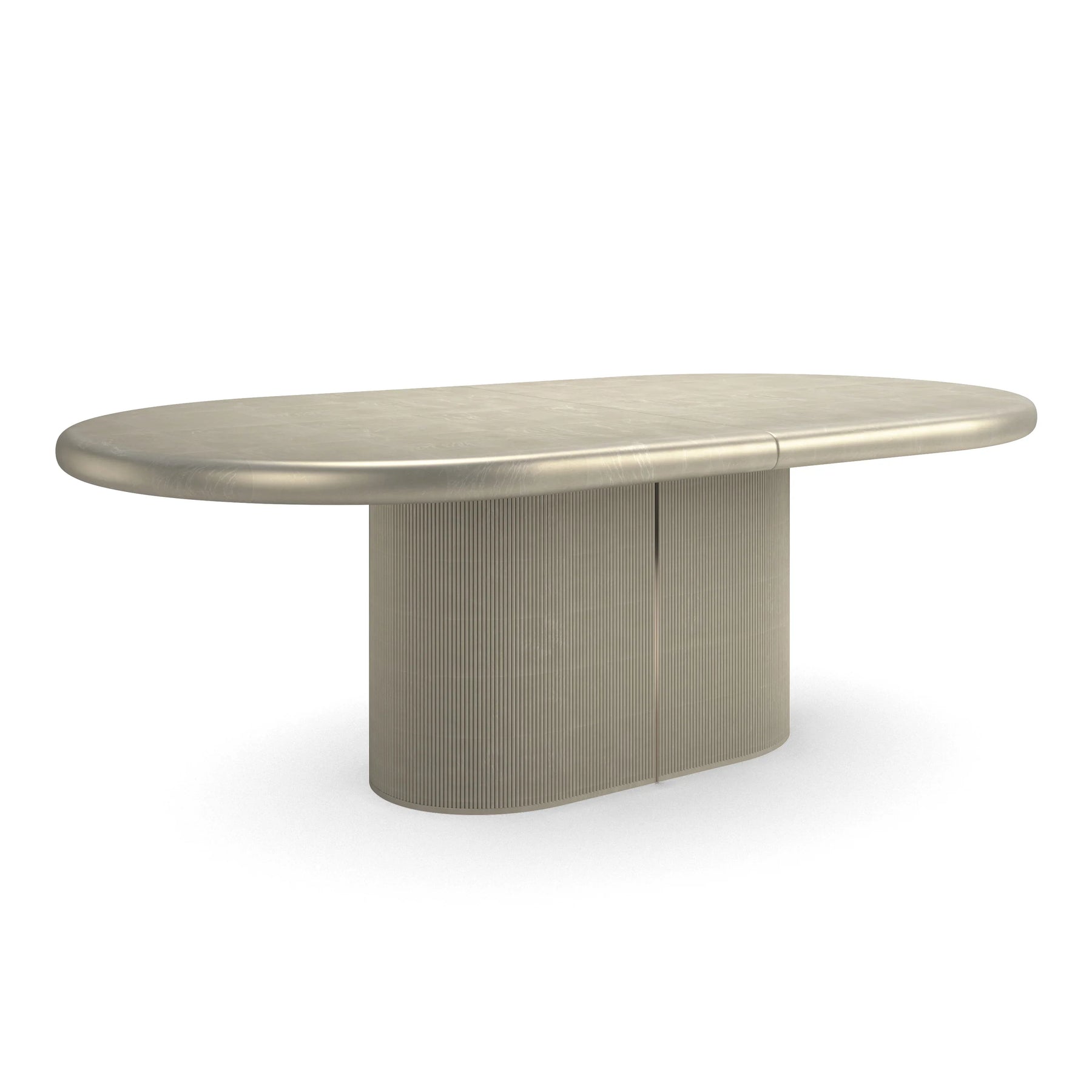 With an elegant oval shape, this large dining table rests upon a two-piece, round barrel base that showcases delicate vertical reeds in Dark Chocolate around its sides. The base can be separated to reveal flat sides with dramatic, reflective Whisper of Gold plates. Its top is Dark Chocolate, trimmed in a Whisper of Gold metal band. Comfortably seats 12 when extended.
