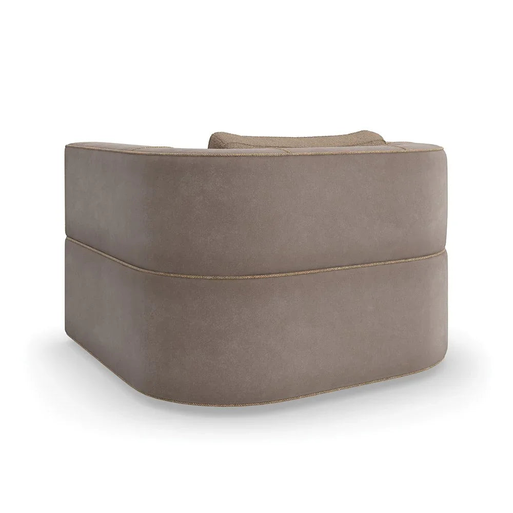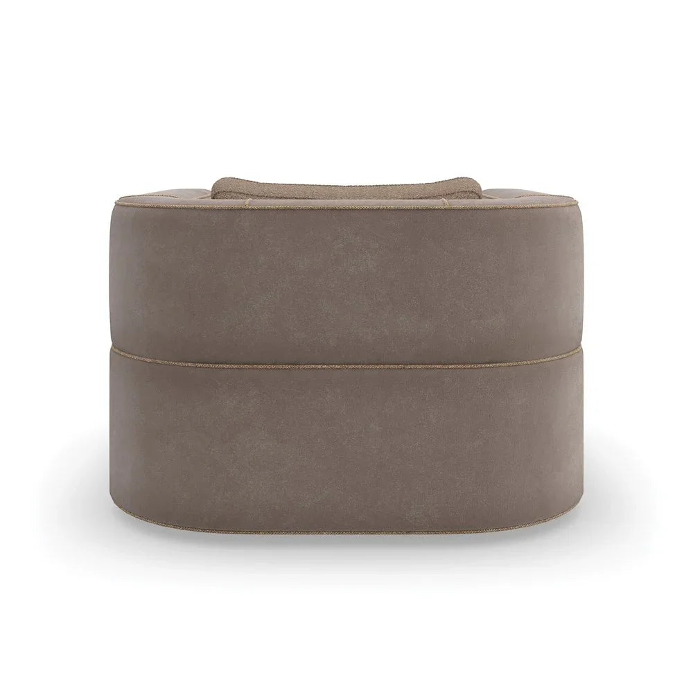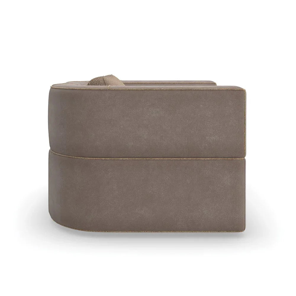 Inviting from any angle, this Italian-style chair introduces a style that is luxe yet livable. Fully upholstered in a warm gray faux nubuck fabric, its enveloping, modern form is accentuated by strategically placed seams and a saffron-colored contrast welt. A camel-colored faux shearling pillow adds tactile appeal and a cozy finishing touch.