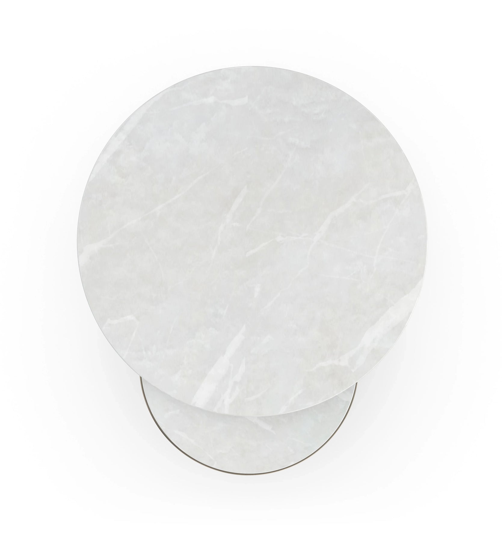 Inspired by celestial bodies, this nesting set of tables makes a dually dazzling accent. The larger accent table features a White Rhino marble top, balanced atop a reflective metal base with orbiting spheres of carved stone. Also topped in marble, the smaller accent table tucks neatly inside the larger table, adding warmth and glimmer in a Whisper of Gold.