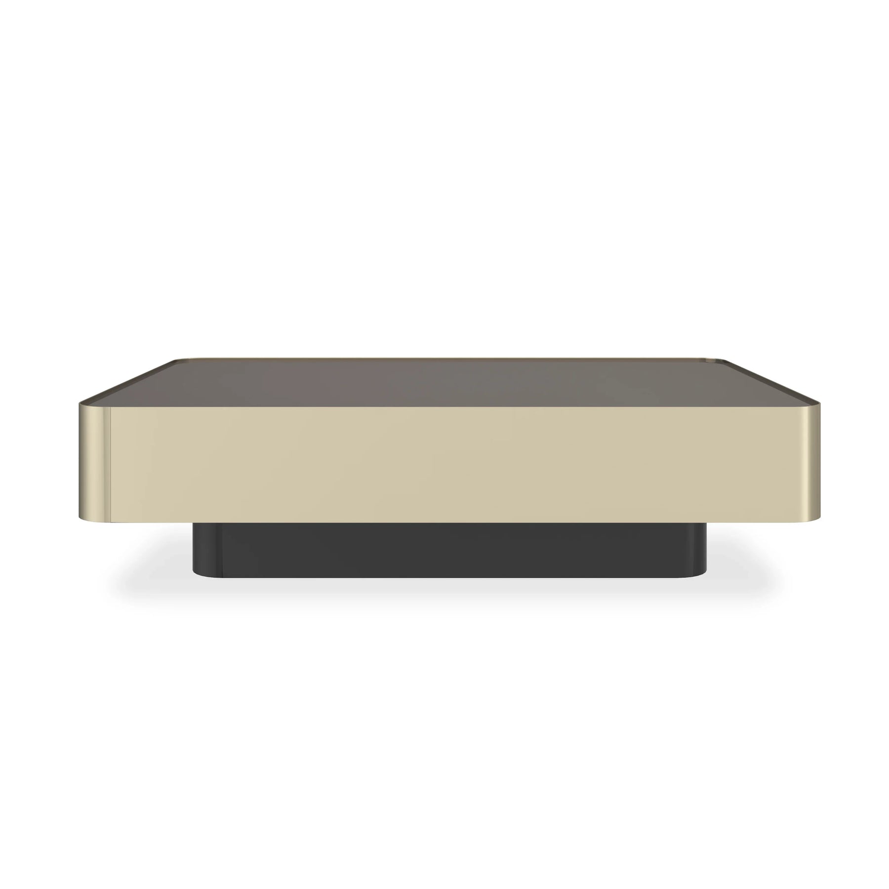 Memories of Studio 54 inspired this square-in-square cocktail table. Glossy and impressive, this large piece has deep sides and softened corners with dramatic Smoked Bronze Mirror top, banded in mirror-polished Whisper of Gold metal. The short, thin base is in Dark Chocolate. For a punctuation of color, an optional Rouge Red Gloss square tray purchased separately can be removed from its top to carry appetizers and cocktails.