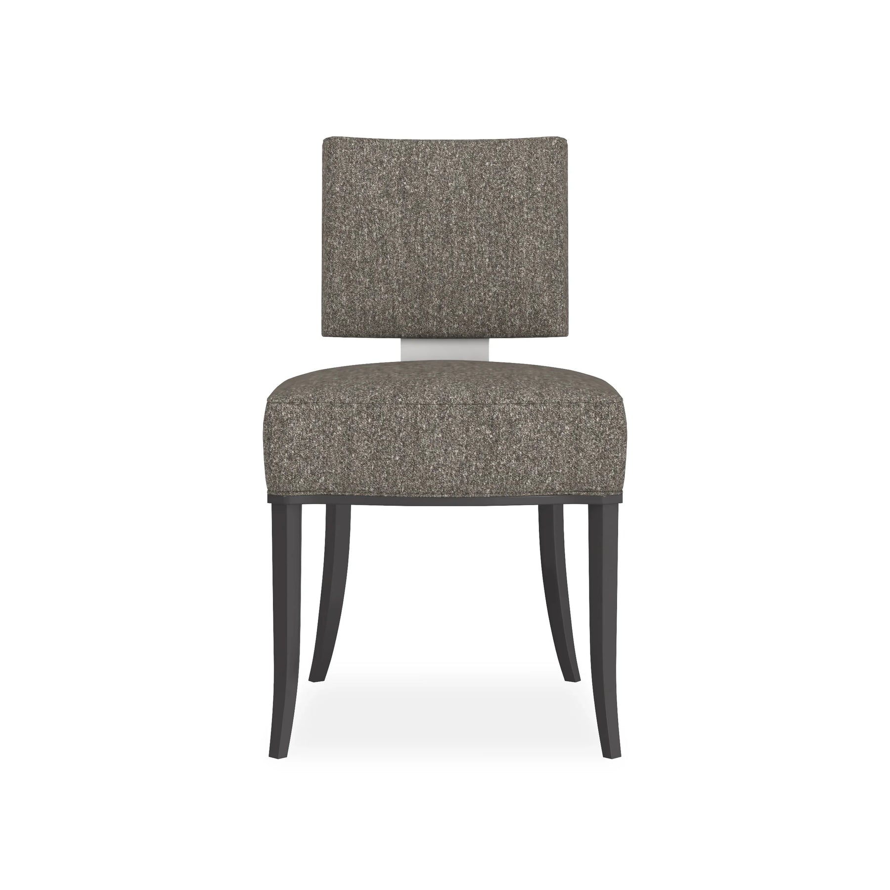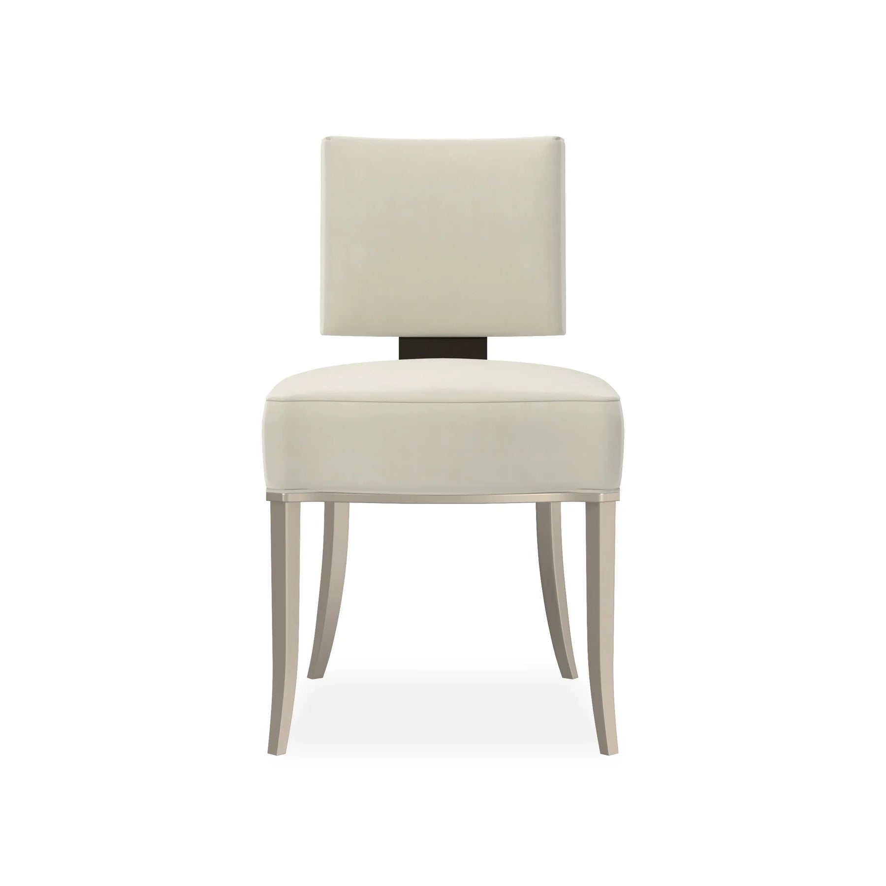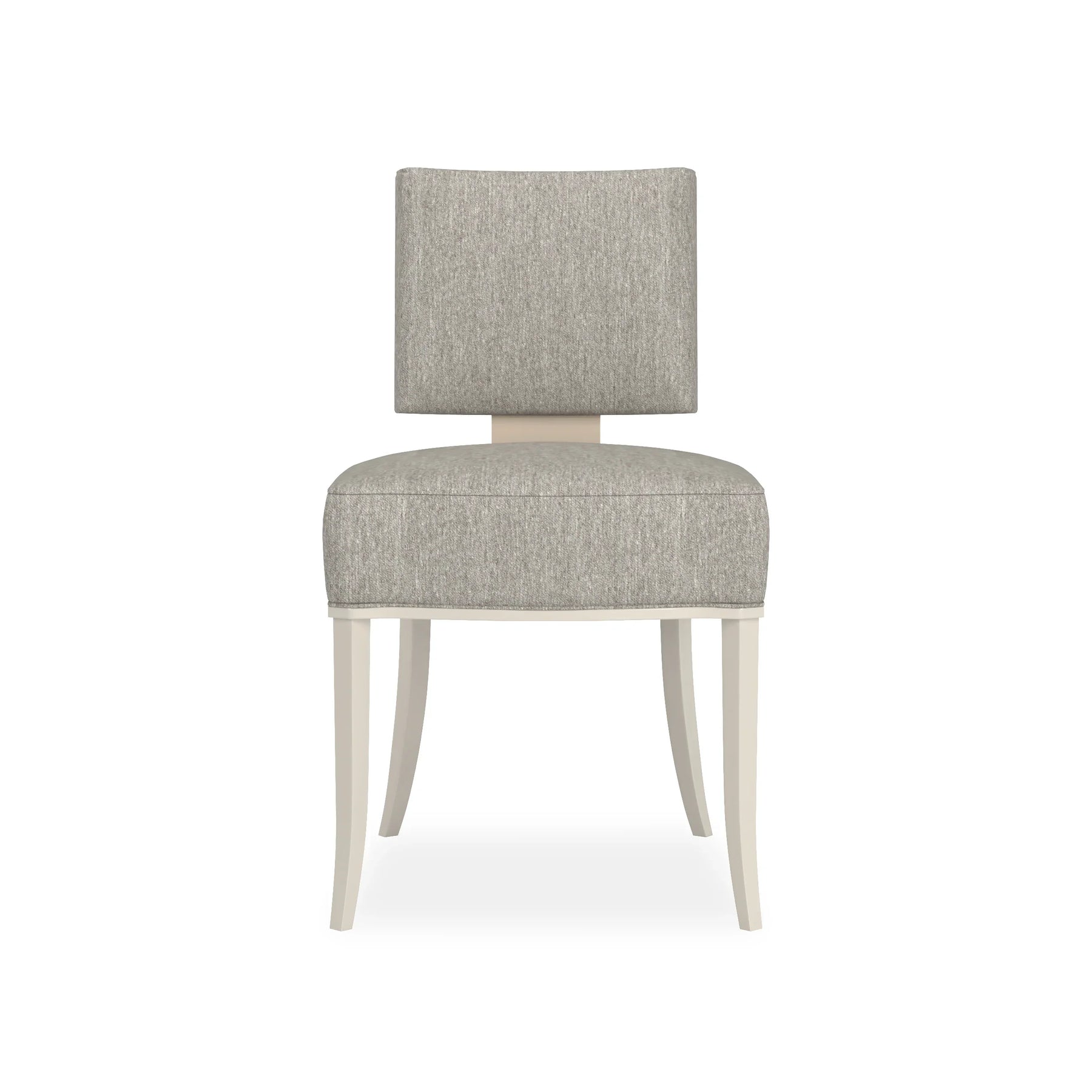 back. Neutral fabric fully surrounds the square upper back and seat cushion that rest on an exposed wood frame, sabre legs and gracefully curving arms finished in Matte Pearl. This is a low, klismos chair with truly polished appeal.