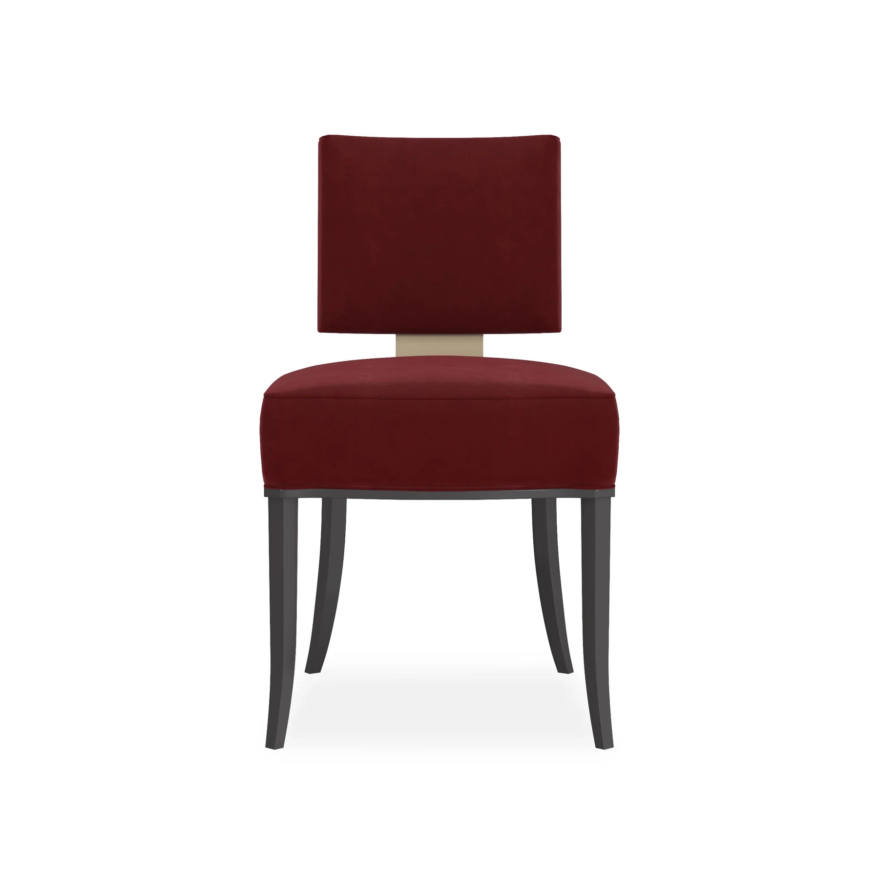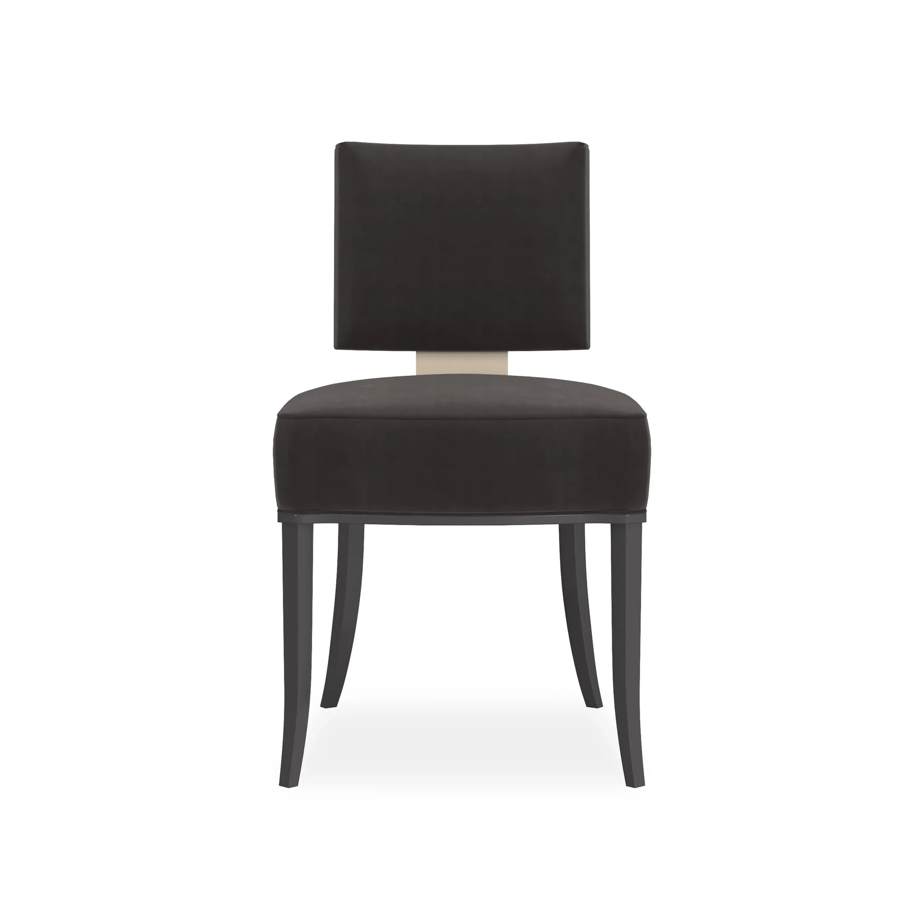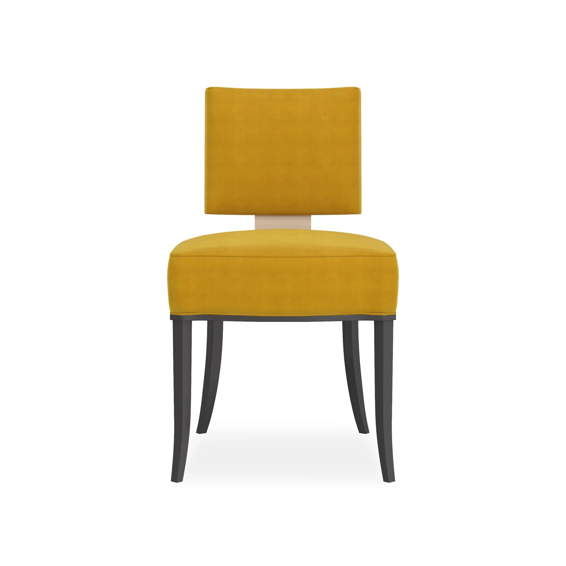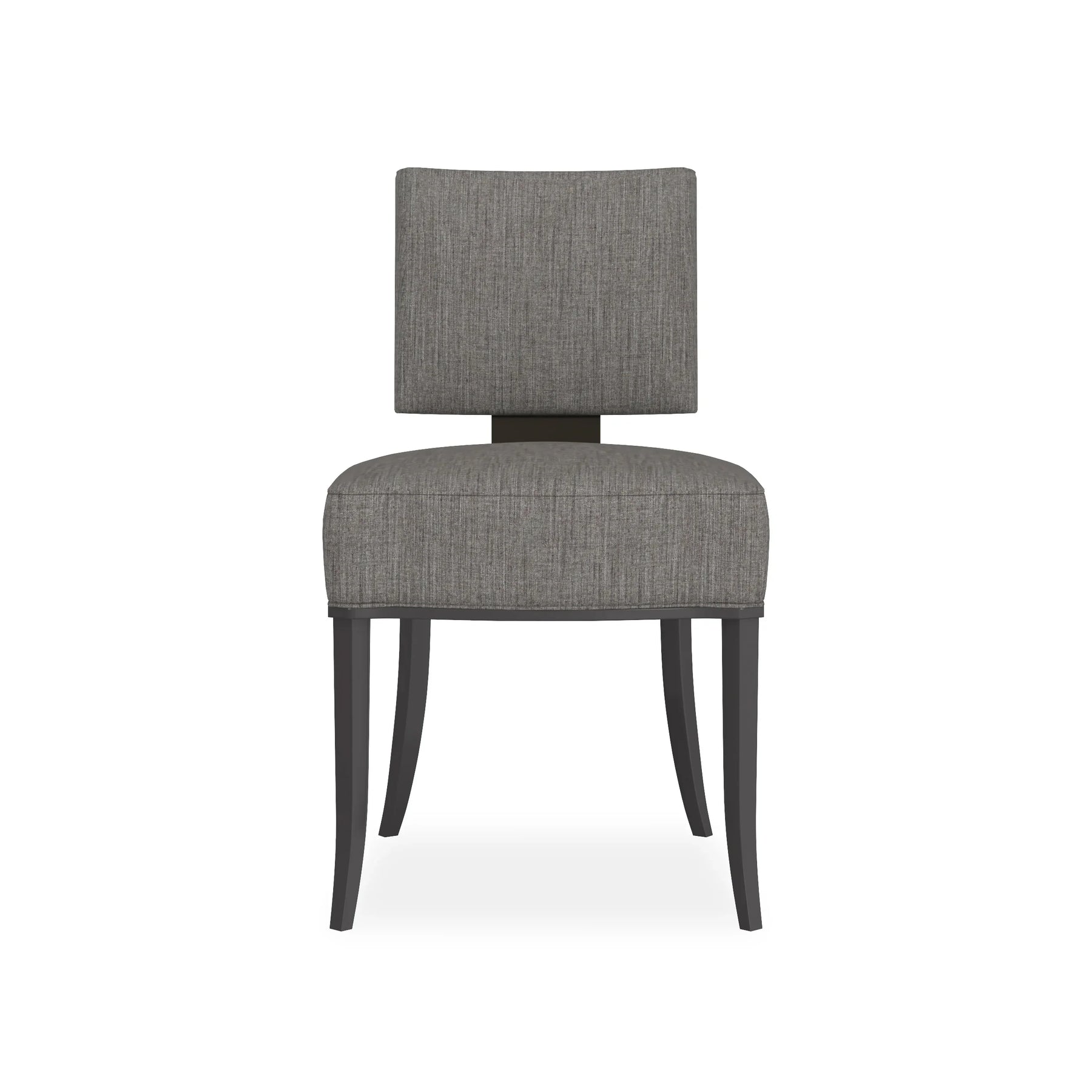 back. Neutral fabric fully surrounds the square upper back and seat cushion that rest on an exposed wood frame, sabre legs and gracefully curving arms finished in Matte Pearl. This is a low, klismos chair with truly polished appeal.