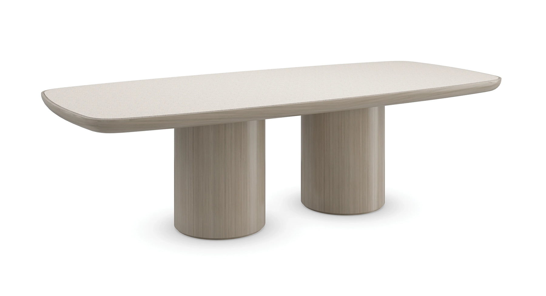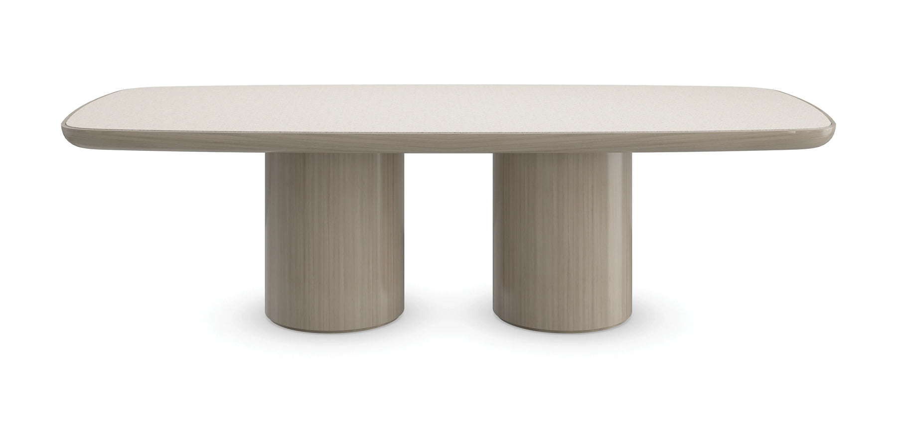 Balancing the beauty of stone with light wood tones, this modern dining table draws the eye with its elongated, soft-cornered shape. Features a silica terrazzo top with the aesthetic of crushed stone, atop two rounded pedestals in a sand-colored finish that naturally showcases the linear grains of Japanese sen. Amply sized for gatherings with family and friends, it comfortably seats 10.