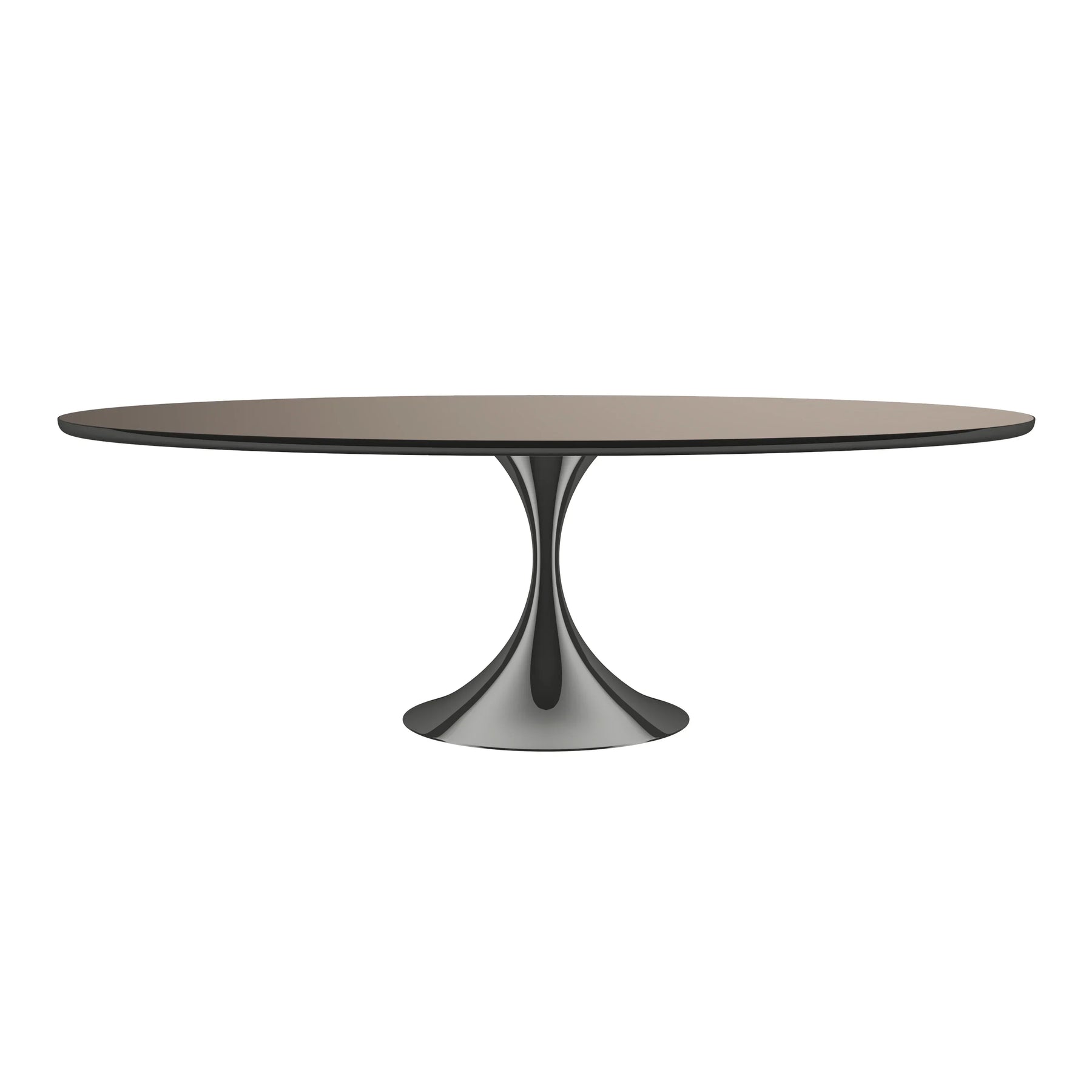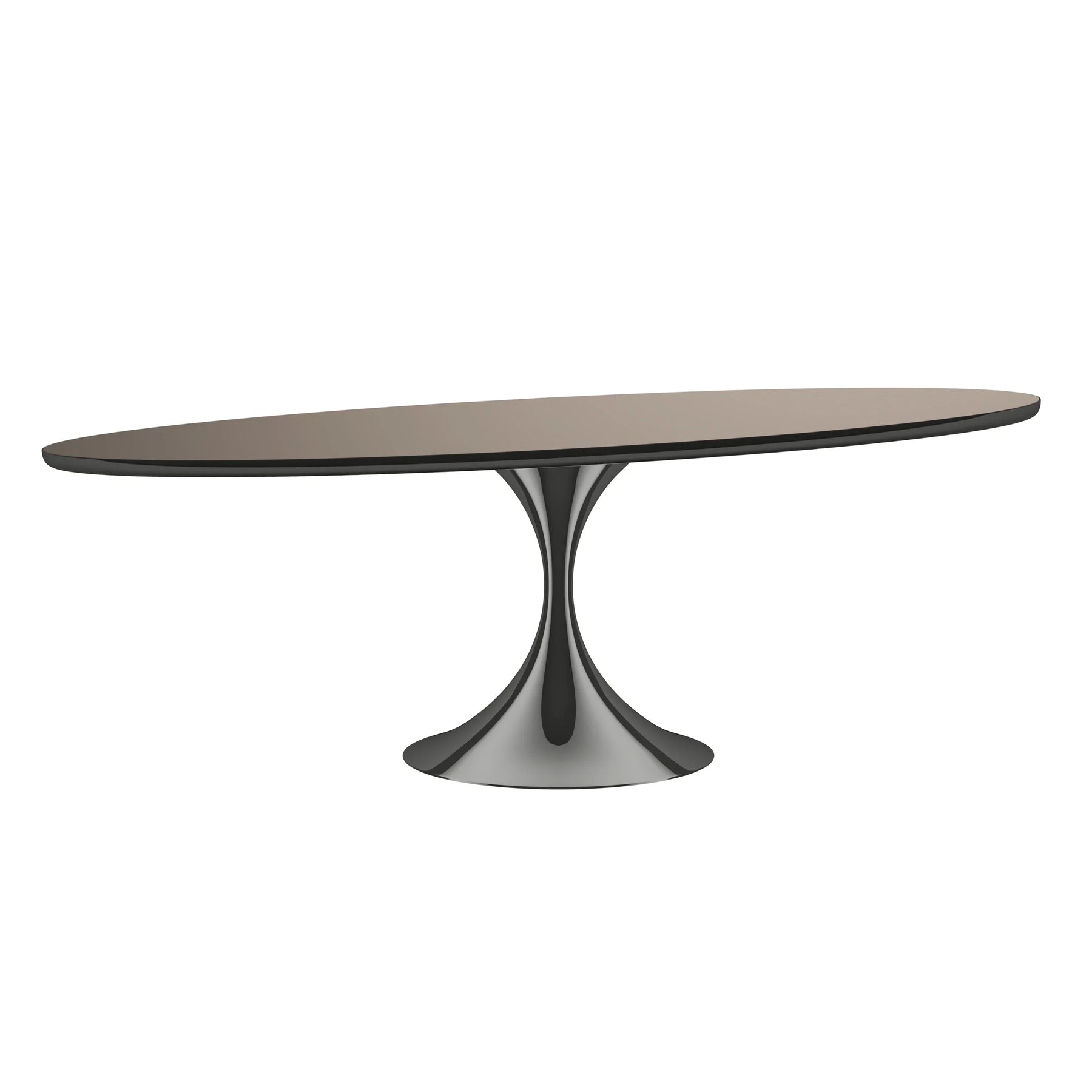 Originally designed to remove the clutter of legs under a dining table, this piece boasts a curved, stem-like metal base in Deep